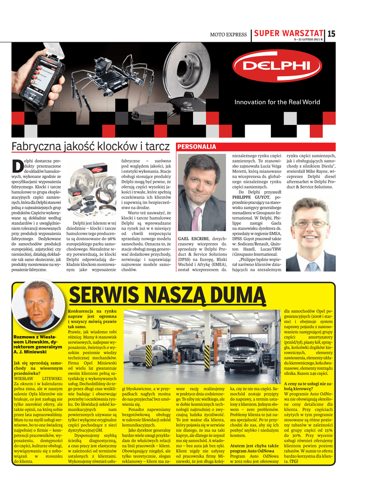 MOTO EXPRESS SUPER WARSZTAT 15 8 – 21 LUTEGO 2011 R. Innovation for the Real World Fabryczna jakość klocków i tarcz D elphi dostarcza produkty przeznaczone doukładów hamulcowych, wykonane zgodnie ze specyfikacjami wyposażenia fabrycznego. Klocki i tarcze hamulcowe to grupa eksploatacyjnych części zamiennych, która dla Delphi stanowi jedną z najważniejszych grup produktów. Części te wykonywane są dokładnie według standardów i z uwzględnieniem tolerancji stosowanych przy produkcji wyposażenia fabrycznego. Dedykowane do samochodów produkcji europejskiej, azjatyckiej czy niemieckiej, działają dokładnie tak samo skutecznie, jak produkty montowane na wyposażenie fabryczne. Delphi jest liderem w tej dziedzinie – klocki i tarcze hamulcowe tego producenta są dostosowane do 98% europejskiego parku samochodowego. Niezależne testy potwierdzają, że klocki Delphi odpowiadają dokładnie klockom montowanym jako wyposażenie fabryczne – zarówno pod względem jakości, jak i estetyki wykonania. Stacje obsługi stosujące produkty Delphi mogą być pewne, że oferują części wysokiej jakości i trwałe, które spełnią oczekiwania ich klientów i zapewnią im bezpieczeństwo na drodze. Warto też zauważyć, że klocki i tarcze hamulcowe Delphi są wprowadzane na rynek już w 6 miesięcy od chwili rozpoczęcia sprzedaży nowego modelu samochodu. Oznacza to, że stacje obsługi mogą generować dodatkowe przychody, serwisując i naprawiając najnowsze modele samochodów. PERSONALIA GAEL ESCRIBE, dotychczasowy wiceprezes ds. sprzedaży w Delphi Product & Service Solutions (DPSS) na Europę, Bliski Wschód i Afrykę (EMEA), został wiceprezesem ds. niezależnego rynku części zamiennych. To stanowisko zajmowała Lucia Veiga Moretti, którą mianowano na wiceprezesa ds. globalnego niezależnego rynku części zamiennych. Do Delphi przyszedł PHILIPPE GUYOT, poprzednio pracujący na stanowisku zastępcy generalnego menadżera w Groupauto International. W Delphi, Philippe zastąpi Gaela na stanowisku dyrektora ds. sprzedaży w regionie EMEA, DPSS. Guyot pracował także w: Sodicam/Renault, Quinton Hazell, Lucas/TRW i Groupauto International. „Philippe będzie wspierał zarówno klientów działających na niezależnym SERWIS NASZĄ DUMĄ Rozmowa z Wiesławem Litewskim, dyrektorem generalnym A. J. Miniewski Jak się sprzedają samochody na wiosennym przednówku? WIESŁAW LITEWSKI: Za oknem i w kalendarzu pełna zima, ale w naszym salonie Opla klientów nie brakuje, co jest zasługą nie tylko szerokiej oferty, ale także opinii, na którą sobie przez lata zapracowaliśmy. Mam tu na myśli usługi serwisowe, bo to one świadczą najpełniej o firmie – kompetencji pracowników, wyposażeniu, dostępności do części, kulturze obsługi, wywiązywaniu się z zobowiązań w stosunku do klienta. Konkurencja na rynku napraw jest ogromna i wszyscy mówią prawie tak samo. Prawie, jak wiadomo robi różnicę. Mamy 8 stanowisk serwisowych, najlepsze wyposażenie, świetnych o wysokim poziomie wiedzy technicznej mechaników. Firma Opel Miniewski od wielu lat gwarantuje swoim klientom pełną satysfakcję z wykonywanych usług. Dochodziliśmy do tego przez długi czas wnikliwie badając i obserwując potrzeby i oczekiwania rynku. Do likwidacji szkód komunikacyjnych nam powierzonych używane są tylko i wyłączne oryginalne części pochodzące z sieci dystrybucyjnej GM. Dysponujemy szybką ścieżką diagnostyczną, a czas pracy jest elastyczny w zależności od terminów ustalonych z klientami. Wykonujemy również usłu- gi błyskawiczne, a w przypadkach nagłych można do nas przyjechać bez umówienia się. Ponadto zapewniamy bezgotówkową obsługę w zakresie likwidacji szkód komunikacyjnych. Jako dyrektor generalny bardzo wiele uwagi przykładam do właściwych relacji na linii pracownik – klient. Obowiązujący niegdyś, ale tylko teoretycznie, slogan reklamowy – klient ma za- wsze rację realizujemy w praktyce dnia codziennego. To niby nic wielkiego, ale w dobie kosmicznych technologii najtrudniej o zwyczajną ludzka życzliwość. To jest ważne dla klienta, który pojawia się w serwisie nie dlatego, że ma na taki kaprys, ale dlatego że zepsuł mu się samochód. A wiadomo – bez auta jak bez ręki. Klient nigdy nie usłyszy od pracownika firmy Miniewski, że jest długa kolej- ka, czy że nie ma części. Samochód zostaje przyjęty do naprawy, a termin ustalony z klientem. Jednym słowem – zero problemów. Problemy klienta to już nasza specjalność. Po to przychodzi do nas, aby się ich pozbyć szybko i niedużym kosztem. Atutem jest chyba także program Auto OdNowa Program Auto OdNowa w 2011 roku jest oferowany rynku części zamiennych, jak i obsługujących samochody z silnikiem Diesla”, stwierdził Mike Rayne, wiceprezes Delphi diesel aftermarket w Delphi Product & Service Solutions. dla samochodów Opel pogwarancyjnych (2008 i starsze) i obejmuje system naprawy pojazdu z zastosowaniem następującej grupy części: amortyzatory (przód/tył), piasty kół, sprzęgła, końcówki drążków kierowniczych, elementy zawieszenia, elementy układu kierowniczego, koła dwumasowe, elementy rozrządu silnika. Razem 249 części. A ceny za te usługi nie zabolą kierowcę? W programie Auto OdNowa nie obowiązują określone ceny detaliczne dla klienta. Przy częściach użytych w tym programie stosowane są różne poziomy rabatów w zależności od grupy części od 15% do 30%. Przy wycenie usługi również oferujemy klientom pewien poziom rabatów. W sumie to oferta bardzo korzystna dla klienta. (TG)