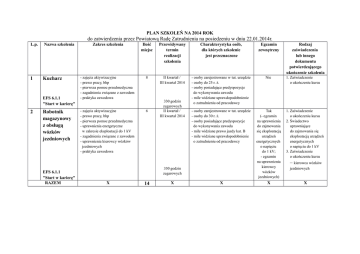 PLAN SZKOLEŃ NA 2014 ROK do zatwierdzenia przez Powiatową Radę Zatrudnienia na posiedzeniu w dniu 22.01.2014r. L.p. Nazwa szkolenia 1 Kucharz EFS 6.1.1 "Start w karierę" 2 Robotnik magazynowy z obsługą wózków jezdniowych EFS 6.1.1 "Start w karierę" RAZEM Zakres szkolenia Ilość miejsc Przewidywany termin realizacji szkolenia Charakterystyka osób, dla których szkolenie jest przeznaczone Egzamin zewnętrzny - zajęcia aktywizacyjne - prawo pracy, bhp - pierwsza pomoc przedmedyczna - zagadnienia związane z zawodem - praktyka zawodowa 8 II kwartał / III kwartał 2014 - osoby zarejestrowane w tut. urzędzie - osoby do 25 r. ż. - osoby posiadające predyspozycje do wykonywania zawodu - mile widziane uprawdopodobnienie o zatrudnieniu od pracodawcy Nie - zajęcia aktywizacyjne - prawo pracy, bhp - pierwsza pomoc przedmedyczna - uprawnienia energetyczne w zakresie eksploatacji do 1 kV - zagadnienia związane z zawodem - uprawnienia kierowcy wózków jezdniowych - praktyka zawodowa 6 - osoby zarejestrowane w tut. urzędzie - osoby do 30 r. ż. - osoby posiadające predyspozycje do wykonywania zawodu - mile widziane prawo jazdy kat. B - mile widziane uprawdopodobnienie o zatrudnieniu od pracodawcy Tak (- egzamin na uprawnienia do zajmowania się eksploatacją urządzeń energetycznych o napięciu do 1 kV; - egzamin na uprawnienia kierowcy wózków jezdniowych) 1. Zaświadczenie o ukończeniu kursu 2. Świadectwo uprawniające do zajmowania się eksploatacją urządzeń energetycznych o napięciu do 1 kV 3. Zaświadczenie o ukończeniu kursu X X 330 godzin zegarowych II kwartał / III kwartał 2014 330 godzin zegarowych X 14 X X Rodzaj zaświadczenia lub innego dokumentu potwierdzającego ukończenie szkolenia 1. Zaświadczenie o ukończeniu kursu – kierowca wózków jezdniowych PLAN SZKOLEŃ NA 2014 ROK do zatwierdzenia przez Powiatową Radę Zatrudnienia na posiedzeniu w dniu 22.01.2014r. L.p. Nazwa szkolenia 3 Przedsiębiorca Zakres szkolenia Ilość miejsc Przewidywany termin realizacji szkolenia 150 I kwartał / IV kwartał 2014 - zagadnienia związane z rozp. działalności gosp. Egzamin zewnętrzny Rodzaj zaświadczenia lub innego dokumentu potwierdzającego ukończenie szkolenia Nie 1. Zaświadczenie o ukończeniu kursu Nie 1. Zaświadczenie o ukończeniu kursu - osoby zarejestrowane w tut. urzędzie - osoby zainteresowane rozpoczęciem - biznes plan Fundusz Pracy Charakterystyka osób, dla których szkolenie jest przeznaczone własnej działalności gospodarczej 30 godzin zegarowych - prawo pracy - zagadnienia podatkowe - rozliczenia z ZUS - program Płatnik - podstawy marketingu, reklamy 4 Sekretarka i profesjonalnej obsługi klienta - zajęcia aktywizacyjne - prawo pracy, bhp - pierwsza pomoc przedmedyczna - zagadnienia związane z zawodem - praktyka zawodowa 10 I kwartał / II kwartał 2014 - osoby zarejestrowane w tut. urzędzie - osoby posiadające min. średnie 450 godzin zegarowych wykształcenie - osoby posiadające predyspozycje do wykonywania zawodu - mile widziane uprawdopodobnienie o zatrudnieniu od pracodawcy Fundusz Pracy 5 Opiekun z językiem niemieckim Fundusz Pracy 6 Pilarz Fundusz Pracy RAZEM - zajęcia aktywizacyjne - prawo pracy, bhp - pierwsza pomoc przedmedyczna - język niemiecki - zagadnienia związane z zawodem - praktyka zawodowa 6 - zajęcia aktywizacyjne - prawo pracy, bhp - pierwsza pomoc przedmedyczna - zagadnienia związane z zawodem - praktyka zawodowa 6 X 172 I kwartał / II kwartał 2014 - osoby zarejestrowane w tut. urzędzie - osoby posiadające predyspozycje do wykonywania zawodu - mile widziane uprawdopodobnienie o zatrudnieniu od pracodawcy Nie 1. Zaświadczenie o ukończeniu kursu Nie 1. Zaświadczenie o ukończeniu kursu 150 godzin zegarowych - osoby zarejestrowane w tut. urzędzie - osoby posiadające predyspozycje do wykonywania zawodu - mile widziane uprawdopodobnienie o zatrudnieniu od pracodawcy X X X 450 godzin zegarowych I kwartał / II kwartał 2014 X PLAN SZKOLEŃ NA 2014 ROK do zatwierdzenia przez Powiatową Radę Zatrudnienia na posiedzeniu w dniu 22.01.2014r. L.p. Nazwa szkolenia Zakres szkolenia Ilość miejsc Przewidywany termin realizacji szkolenia Charakterystyka osób, dla których szkolenie jest przeznaczone Egzamin zewnętrzny 7 Dekoratorsztuka carvingu - zajęcia aktywizacyjne - prawo pracy, bhp - pierwsza pomoc przedmedyczna - zagadnienia związane z zawodem - praktyka zawodowa 5 I kwartał / II kwartał 2014 - osoby zarejestrowane w tut. urzędzie - osoby posiadające predyspozycje do wykonywania zawodu - mile widziane uprawdopodobnienie o zatrudnieniu od pracodawcy Nie X 5 X X Program specjalny RAZEM 200 godzin zegarowych X Rodzaj zaświadczenia lub innego dokumentu potwierdzającego ukończenie szkolenia 1. Zaświadczenie o ukończeniu kursu X