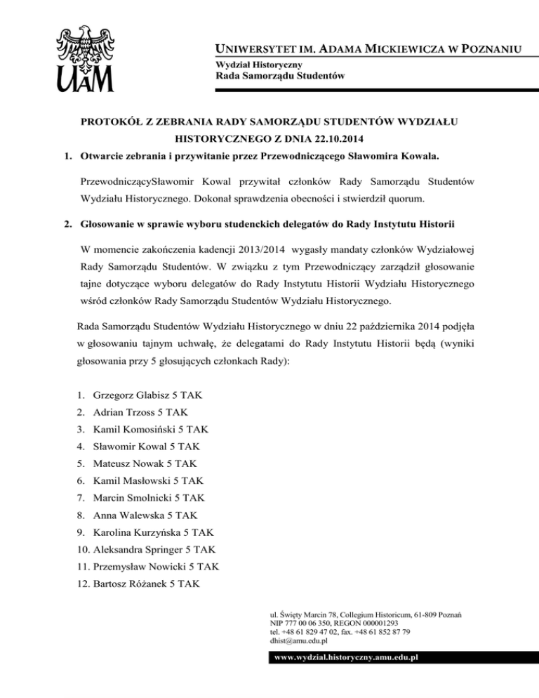Wydział Historyczny Rada Samorządu Studentów PROTOKÓŁ Z ZEBRANIA RADY SAMORZĄDU STUDENTÓW WYDZIAŁU HISTORYCZNEGO Z DNIA 22.10.2014 1. Otwarcie zebrania i przywitanie przez Przewodniczącego Sławomira Kowala. PrzewodniczącySławomir Kowal przywitał członków Rady Samorządu Studentów Wydziału Historycznego. Dokonał sprawdzenia obecności i stwierdził quorum. 2. Głosowanie w sprawie wyboru studenckich delegatów do Rady Instytutu Historii W momencie zakończenia kadencji 2013/2014 wygasły mandaty członków Wydziałowej Rady Samorządu Studentów. W związku z tym Przewodniczący zarządził głosowanie tajne dotyczące wyboru delegatów do Rady Instytutu Historii Wydziału Historycznego wśród członków Rady Samorządu Studentów Wydziału Historycznego. Rada Samorządu Studentów Wydziału Historycznego w dniu 22 października 2014 podjęła w głosowaniu tajnym uchwałę, że delegatami do Rady Instytutu Historii będą (wyniki głosowania przy 5 głosujących członkach Rady): 1. Grzegorz Glabisz 5 TAK 2. Adrian Trzoss 5 TAK 3. Kamil Komosiński 5 TAK 4. Sławomir Kowal 5 TAK 5. Mateusz Nowak 5 TAK 6. Kamil Masłowski 5 TAK 7. Marcin Smolnicki 5 TAK 8. Anna Walewska 5 TAK 9. Karolina Kurzyńska 5 TAK 10. Aleksandra Springer 5 TAK 11. Przemysław Nowicki 5 TAK 12. Bartosz Różanek 5 TAK ul. Święty Marcin 78, Collegium Historicum, 61-809 Poznań NIP 777 00 06 350, REGON 000001293 tel. +48 61 829 47 02, fax. +48 61 852 87 79 [email protected] www.wydzial.historyczny.amu.edu.pl Wydział Historyczny Rada Samorządu Studentów 13. Mateusz Kalinowski 5 TAK 14. Mikołaj Jurga 5 TAK 15. Robert Łyskawa 5 TAK Stwierdza się, że wszyscy wyżej wymienieni studenci uzyskali status delegata do Rady Instytutu Historii. 3. Głosowanie w sprawie wyboru studenckich delegatów do Rady Instytutu Prahistorii W momencie zakończenia kadencji 2013/2014 wygasły mandaty członków Wydziałowej Rady Samorządu Studentów. W związku z tym Przewodniczący zarządził głosowanie tajne dotyczące wyboru delegatów do Rady Instytutu Prahistorii Wydziału Historycznego wśród członków Rady Samorządu Studentów Wydziału Historycznego. Rada Samorządu Studentów Wydziału Historycznego w dniu 22 października 2014 podjęła w głosowaniu tajnym uchwałę, że delegatami do Rady Instytutu Prahistorii będą (wyniki głosowania przy 5 głosujących członkach Rady): Mateusz Wawrzyniak 5 TAK Michał Hyjek 5 TAK Stwierdza się, że wszyscy wyżej wymienieni studenci uzyskali status delegata do Rady Instytutu Prahistorii. 4. Głosowanie w sprawie wyboru studenckich delegatów do Rady Instytutu Etnologii i Antropologii Kulturowej W momencie zakończenia kadencji 2013/2014 wygasły mandaty członków Wydziałowej Rady Samorządu Studentów. W związku z tym Przewodniczący zarządził głosowanie tajne dotyczące wyboru delegatów do Rady Instytutu Etnologii i ul. Święty Marcin 78, Collegium Historicum, 61-809 Poznań NIP 777 00 06 350, REGON 000001293 tel. +48 61 829 47 02, fax. +48 61 852 87 79 [email protected] www.wydzial.historyczny.amu.edu.pl Wydział Historyczny Rada Samorządu Studentów Antropologii Kulturowej Wydziału Historycznego wśród członków Rady Samorządu Studentów Wydziału Historycznego. Rada Samorządu Studentów Wydziału Historycznego w dniu 22 października 2014 podjęła w głosowaniu tajnym uchwałę, że delegatami do Rady Instytutu Etnologii i Antropologii Kulturowej będą (wyniki głosowania przy 5 głosujących członkach Rady): Wojciech Cendrowski 5 TAK Stwierdza się, że wszyscy wyżej wymienieni studenci uzyskali status delegata do Rady Instytutu Prahistorii. 5. Głosowanie w sprawie uzupełnienia składu Wydziałowej Komisji Ekonomicznej Rada Samorządu Studentów Wydziału Historycznego w dniu 22 października 2014 podjęła w tajnym głosowaniu uchwałę, o mianowaniu nowego delegata do Wydziałowej Komisji Ekonomicznej na Wydziale Historycznym Uniwersytetu im. Adama Mickiewicza w Poznaniu. Na członka Wydziałowej Komisji Ekonomicznej został powołany (wyniki głosowania przy 7 głosujących członkach Rady): 1. Krzysztof Osiński – 7 głosów na TAK Stwierdza się, iż wyżej wymieniony kandydat uzyskał status nowego delegata do Wydziałowej Komisji Ekonomicznej na Wydziale Historycznym Uniwersytetu im. Adama Mickiewicza w Poznaniu. ul. Święty Marcin 78, Collegium Historicum, 61-809 Poznań NIP 777 00 06 350, REGON 000001293 tel. +48 61 829 47 02, fax. +48 61 852 87 79 [email protected] www.wydzial.historyczny.amu.edu.pl Wydział Historyczny Rada Samorządu Studentów 6. Wolne głosy, zakończenie zebrania Członkowie Wydziałowej Rady Samorządu Studentów Wydziału Historycznego zgłosili następujące wolne głosy dotyczące: - spotkania z dziekanem; - III Konwentu Starostów; - ustalenia godzin dziekańskich; - aktualizacji adresów poczty elektronicznej starostów; - wymiany węgierskiej; Następnie Przewodniczący zamknął zebranie Rady. Protokół sporządziła: Anna Walewska ul. Święty Marcin 78, Collegium Historicum, 61-809 Poznań NIP 777 00 06 350, REGON 000001293 tel. +48 61 829 47 02, fax. +48 61 852 87 79 [email protected] www.wydzial.historyczny.amu.edu.pl