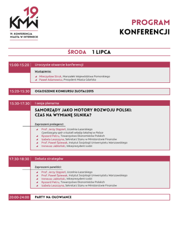 15:00-15:20 Uroczyste otwarcie konferencji Wystąpienia: Mieczysław Struk, Marszałek Województwa Pomorskiego Paweł Adamowicz, Prezydent Miasta Gdańska 15:20-15:30 15:30-17:30 @ I sesja plenarna Zaproszeni prelegenci: 17:30-18:30 Prof. Jerzy Stępień, Uczelnia Łazarskiego Cywilizacyjny spór o kształt władzy lokalnej w Polsce Ryszard Petru, Towarzystwo Ekonomistów Polskich Izabela Leszczyna, Sekretarz Stanu w Ministerstwie Finansów Prof. Paweł Śpiewak, Instytut Socjologii Uniwersytetu Warszawskiego Ireneusz Jabłoński, Wiceprezydent Łodzi Debata strategów Zaproszeni paneliści: 20:00-24:00 Prof. Jerzy Stępień, Uczelnia Łazarskiego Prof. Paweł Śpiewak, Instytut Socjologii Uniwersytetu Warszawskiego Ireneusz Jabłoński, Wiceprezydent Łodzi Ryszard Petru, Towarzystwo Ekonomistów Polskich Izabela Leszczyna, Sekretarz Stanu w Ministerstwie Finansów Bloki tematyczne 9:00-11:00 Ścieżka edukacyjna Ścieżka administracyjna Ścieżka projektów 2014-2020 ( Zaproszeni prelegenci: 11:00-13:00 Dr Marek Piotrowski, Dyrektor Ośrodka Rozwoju Edukacji Dr inż. Krzysztof Kurowski, Poznańskie Centrum Superkomputerowo-Sieciowe Zaproszeni prelegenci: Beata Tokaj, Szef Krajowego Biura Wyborczego Marcin Malicki, Dyrektor Pionu Rozwoju Produktów i Usług, Centralny Ośrodek Informatyki Marcin Wolfram, Informatyk, Urząd Miejski w Żarowie "Informatyka wyborcza na dnie", czyli jak to wygląda w samorządzie ) Zaproszeni prelegenci: Adam Jesionkiewicz, IFINITY dr Krzysztof Głuc, Wiceprezes Zarządu ds. Strategii i Rozwoju Spółki Sądeckie Wodociągi Miasta przyszłości - przyszłość miast. Wyzwania dla liderów obecnych i przyszłych II sesja plenarna Zaproszeni prelegenci: Antoni Mężydło, Poseł na Sejm RP Marcin Malicki, Dyrektor Pionu Rozwoju Produktów i Usług, Centralny Ośrodek Informatyki Krzysztof Komorowski, Instytut Sobieskiego Sebastian Christow, Dyrektor Departamentu Informatyzacji Ministerstwa Administracji i Cyfryzacji Piotr Wołejko, Ekspert ds. Społeczno-Gospodarczych, Pracodawcy RP E-administracja dla obywatela czy dla urzędnika? Dla każdego! Debata: Zaproszeni paneliści: 13:00-14:00 Antoni Mężydło, Poseł na Sejm RP Marcin Malicki, Dyrektor Pionu Rozwoju Produktów i Usług, Centralny Ośrodek Informatyki Krzysztof Komorowski, Instytut Sobieskiego Sebastian Christow, Dyrektor Departamentu Informatyzacji Ministerstwa Administracji i Cyfryzacji Piotr Wołejko, Ekspert ds. Społeczno-Gospodarczych, Pracodawcy RP LUNCH Bloki tematyczne 14:00-15:30 Ścieżka edukacyjna Ścieżka administracyjna Zaproszeni prelegenci: Urszula Augustyn, Sekretarz Stanu w Ministerstwie Edukacji Narodowej DYSKUSJA PANELOWA Zaproszeni paneliści: Dariusz Styrna, Dyrektor Dep. Edukacji i Kształcenia Ustawicznego Urzędu Marszałkowskiego Woj. Małopolskiego Zdzisław Nowakowski, Centrum Kształcenia Praktycznego i Doskonalenia Nauczycieli w Mielcu, sekretarz Rady ds. Informatyzacji Edukacji Rafał Sukiennik, Dyrektor Dep. Rozwoju Cyfrowego Ministerstwa Infrastruktury i Rozwoju Ścieżka projektów 20142020 Zaproszeni prelegenci: Zaproszeni prelegenci: Michał Bukowski, Przewodniczący Zespołu ds. rozwoju strategii informatyzacji administracji publicznej w MAC Jaka jest rola architektury korporacyjnej w budowie Cyfrowego Państwa? Helena Zbijewska, Dyrektor Dep. Zarządzania Systemami Informatycznymi ZUS Wprowadzanie pryncypiów i budowa architektury korporacyjnej doświadczenia ZUS Dariusz Śpiewak, Pełnomocnik Ministra Finansów ds. Informatyzacji Rola architektury korporacyjnej w strategii Ministerstwa Finansów „Zintegrowany system Informacyjny Resortu Finansów 2020” Artur Krawczyk, Stowarzyszenie „Miasta w Internecie” Wiesława Borczyk, Prezes Ogólnopolskiej Federacji Stowarzyszeń Uniwersytetów Trzeciego Wieku Latarnicy Polski Cyfrowej DYSKUSJA PANELOWA: Co musiałoby się stać, aby udało się wprowadzić ład korporacyjny w Cyfrowej Polsce? Zaproszeni paneliści: Marek Bąkowski, Wiceprezes Polskiej Izby Informatyki i Telekomunikacji Arkadiusz Lefanowicz, Przewodniczący Rady Fundacji IT Leader Club Polska Helena Zbijewska, ZUS Dariusz Śpiewak, Ministerstwo Finansów Bloki tematyczne 15:30-17:00 Ścieżka edukacyjna Ścieżka administracyjna Zaproszeni prelegenci: Andrzej Grzybowski, Intel Polska Ścieżka projektów 2014-2020 Zaproszeni prelegenci: Piotr Wierzchosławski, Urząd Miasta Krakowa Ewa Graniewska, Ministerstwo Administracji i Cyfryzacji Anna Napiórkowska, Dyrektor Dep. Budżetu Państwa Ministerstwo Finansów Zaproszeni prelegenci: Xawery Konarski, starszy partner w kancelarii Traple Konarski Podrecki i Wspólnicy Justyna Holka, ekspert ds. zamówień publicznych i PPP w kancelarii Traple Konarski Podrecki i Wspólnicy 17:00-19:00 III sesja plenarna Zaproszeni prelegenci: Rafał Sukiennik, Dyrektor Dep. Rozwoju Cyfrowego Ministerstwa Infrastruktury i Rozwoju Dariusz Styrna, Dyrektor Dep. Edukacji i Kształcenia Ustawicznego Urzędu Marszałkowskiego Województwa Małopolskiego Marcin Stefański, Dyrektor Dep. Społeczeństwa Informacyjnego Urzędu Marszałkowskiego Województwa Pomorskiego 20:00-24:00 Bloki tematyczne 10:00-12:00 Ścieżka edukacyjna Ścieżka administracyjna Prelegenci: 12:00-13:00 Dr inż. Krzysztof Kurowski, Bogdan Ludwiczak, Tomasz Kuczyński, Dariusz Stachecki, Poznańskie Centrum Superkomputerowo Sieciowe Ścieżka projektów 2014-2020 Prelegenci: Wojciech Kulesza, Prezes Fundacji Widzialni Przemysław Marcinkowski, Ekspert z zakresu dostępności cyfrowej Prelegenci: Rafał Sukiennik, Dyrektor Dep. Rozwoju Cyfrowego Ministerstwa Infrastruktury i Rozwoju