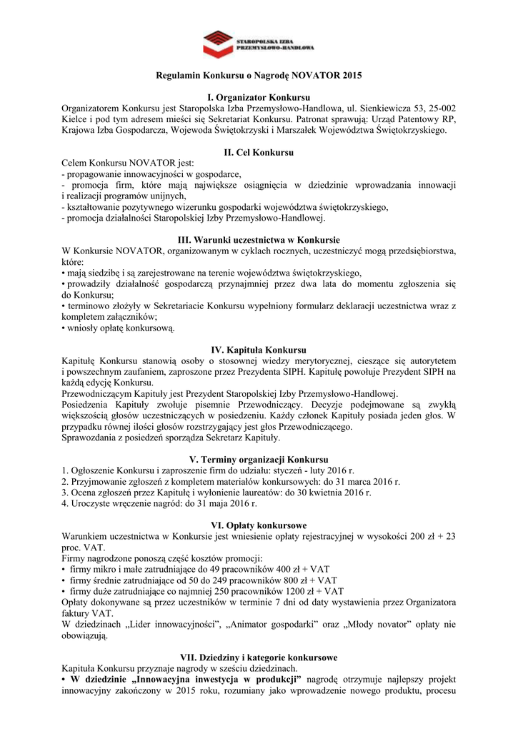 Regulamin Konkursu o Nagrodę NOVATOR 2015 I. Organizator Konkursu Organizatorem Konkursu jest Staropolska Izba Przemysłowo-Handlowa, ul. Sienkiewicza 53, 25-002 Kielce i pod tym adresem mieści się Sekretariat Konkursu. Patronat sprawują: Urząd Patentowy RP, Krajowa Izba Gospodarcza, Wojewoda Świętokrzyski i Marszałek Województwa Świętokrzyskiego. II. Cel Konkursu Celem Konkursu NOVATOR jest: - propagowanie innowacyjności w gospodarce, - promocja firm, które mają największe osiągnięcia w dziedzinie wprowadzania innowacji i realizacji programów unijnych, - kształtowanie pozytywnego wizerunku gospodarki województwa świętokrzyskiego, - promocja działalności Staropolskiej Izby Przemysłowo-Handlowej. III. Warunki uczestnictwa w Konkursie W Konkursie NOVATOR, organizowanym w cyklach rocznych, uczestniczyć mogą przedsiębiorstwa, które: • mają siedzibę i są zarejestrowane na terenie województwa świętokrzyskiego, • prowadziły działalność gospodarczą przynajmniej przez dwa lata do momentu zgłoszenia się do Konkursu; • terminowo złożyły w Sekretariacie Konkursu wypełniony formularz deklaracji uczestnictwa wraz z kompletem załączników; • wniosły opłatę konkursową. IV. Kapituła Konkursu Kapitułę Konkursu stanowią osoby o stosownej wiedzy merytorycznej, cieszące się autorytetem i powszechnym zaufaniem, zaproszone przez Prezydenta SIPH. Kapitułę powołuje Prezydent SIPH na każdą edycję Konkursu. Przewodniczącym Kapituły jest Prezydent Staropolskiej Izby Przemysłowo-Handlowej. Posiedzenia Kapituły zwołuje pisemnie Przewodniczący. Decyzje podejmowane są zwykłą większością głosów uczestniczących w posiedzeniu. Każdy członek Kapituły posiada jeden głos. W przypadku równej ilości głosów rozstrzygający jest głos Przewodniczącego. Sprawozdania z posiedzeń sporządza Sekretarz Kapituły. V. Terminy organizacji Konkursu 1. Ogłoszenie Konkursu i zaproszenie firm do udziału: styczeń - luty 2016 r. 2. Przyjmowanie zgłoszeń z kompletem materiałów konkursowych: do 31 marca 2016 r. 3. Ocena zgłoszeń przez Kapitułę i wyłonienie laureatów: do 30 kwietnia 2016 r. 4. Uroczyste wręczenie nagród: do 31 maja 2016 r. VI. Opłaty konkursowe Warunkiem uczestnictwa w Konkursie jest wniesienie opłaty rejestracyjnej w wysokości 200 zł + 23 proc. VAT. Firmy nagrodzone ponoszą część kosztów promocji: • firmy mikro i małe zatrudniające do 49 pracowników 400 zł + VAT • firmy średnie zatrudniające od 50 do 249 pracowników 800 zł + VAT • firmy duże zatrudniające co najmniej 250 pracowników 1200 zł + VAT Opłaty dokonywane są przez uczestników w terminie 7 dni od daty wystawienia przez Organizatora faktury VAT. W dziedzinach „Lider innowacyjności”, „Animator gospodarki” oraz „Młody novator” opłaty nie obowiązują. VII. Dziedziny i kategorie konkursowe Kapituła Konkursu przyznaje nagrody w sześciu dziedzinach. • W dziedzinie „Innowacyjna inwestycja w produkcji” nagrodę otrzymuje najlepszy projekt innowacyjny zakończony w 2015 roku, rozumiany jako wprowadzenie nowego produktu, procesu 2 technologicznego, nowej linii produkcyjnej, nowej organizacji produkcji. Kapituła Konkursu dokonuje oceny przedsiębiorstw w trzech kategoriach: • przedsiębiorstwa mikro i małe – zatrudniające do 49 pracowników, • przedsiębiorstwa średnie – zatrudniające od 50 do 249 pracowników, • przedsiębiorstwa duże – zatrudniające co najmniej 250 pracowników. Laureaci wyłaniani są przez Sekretariat Konkursu na podstawie złożonych przez firmy dokumentów konkursowych i zatwierdzani w głosowaniu Kapituły zwykłą większością głosów. W przypadku braku kandydata w jednej z kategorii wyłaniany jest drugi kandydat w innej tak, by łącznie wytypować trzech laureatów. • W dziedzinie „Innowacyjna inwestycja w usługach” nagrodę otrzymuje najlepszy projekt innowacyjny zakończony w 2015 roku, rozumiany jako wprowadzenie nowej usługi, procesu technologicznego, nowej organizacji zarządzania. Kapituła Konkursu dokonuje oceny przedsiębiorstw w trzech kategoriach: • przedsiębiorstwa mikro i małe – zatrudniające do 49 pracowników; • przedsiębiorstwa średnie – zatrudniające od 50 do 249 pracowników; • przedsiębiorstwa duże – zatrudniające co najmniej 250 pracowników. Laureaci wyłaniani są przez Sekretariat Konkursu na podstawie złożonych dokumentów konkursowych i zatwierdzani w głosowaniu Kapituły zwykłą większością głosów. W przypadku braku kandydata w jednej z kategorii wyłaniany jest drugi kandydat w innej tak, by łącznie wytypować trzech laureatów. • W dziedzinie „Współpraca nauka – przemysł” nagrodę otrzymuje najlepszy projekt przygotowany przez placówkę naukowo-badawczą i firmę z województwa świętokrzyskiego. Laureat wyłaniany jest przez Sekretariat Konkursu na podstawie złożonych przez firmy dokumentów konkursowych i wybierany w głosowaniu Kapituły zwykłą większością głosów. • W dziedzinie „Lider innowacyjności” nagrodę otrzymuje przedsiębiorca, menedżer, wynalazca lub organizacja z województwa świętokrzyskiego o znaczących osiągnięciach w dziedzinie wdrażania innowacji w gospodarce. Kandydatów do nagrody w tej dziedzinie zgłaszają członkowie Kapituły, firmy zrzeszone w Staropolskiej Izbie Przemysłowo-Handlowej oraz Zarząd Izby. Wymagane jest uzasadnienie na piśmie wniosku przez organizację zgłaszającą kandydata (nie więcej niż 1 strona). „Lider innowacyjności” wybierany jest w głosowaniu Kapituły zwykłą większością głosów. • W dziedzinie „Animator gospodarki” nagrodę otrzymuje organizacja, jednostka samorządu terytorialnego lub osoba z województwa świętokrzyskiego o znaczących osiągnięciach w tworzeniu warunków dla działalności gospodarczej. Kandydatów do nagrody w tej dziedzinie zgłaszają członkowie Kapituły, firmy zrzesz