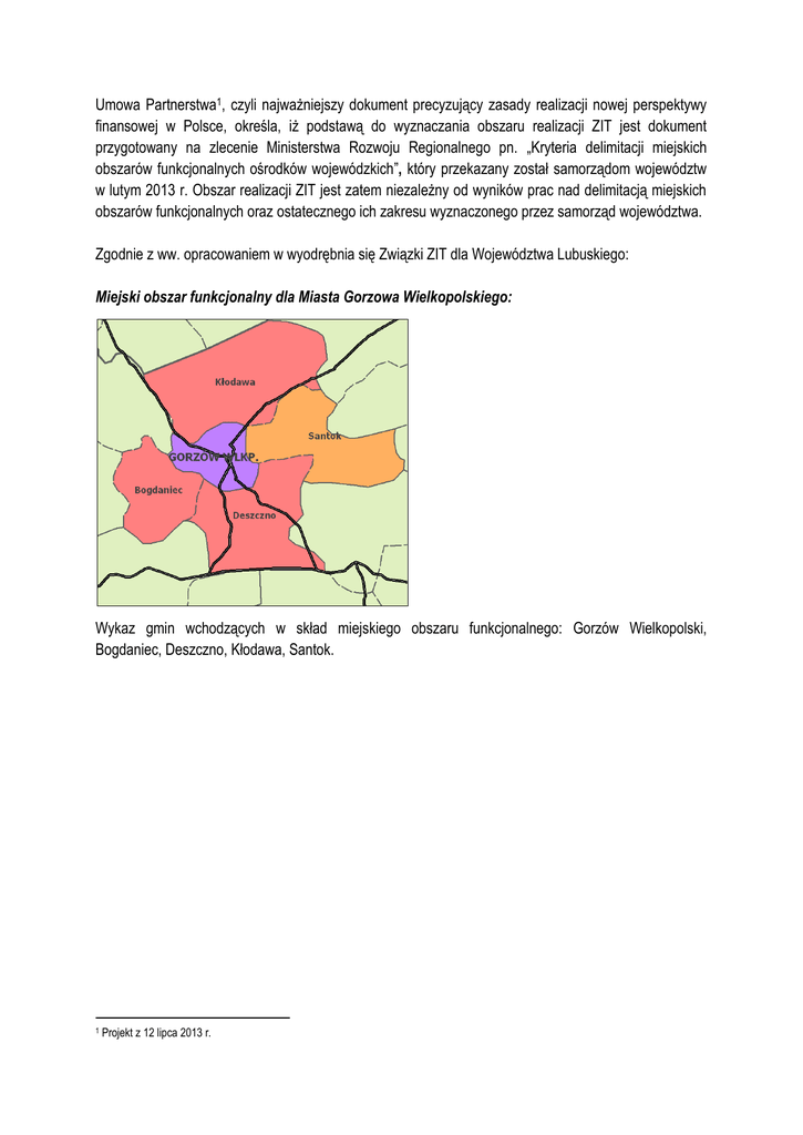 Umowa Partnerstwa1, czyli najważniejszy dokument precyzujący zasady realizacji nowej perspektywy finansowej w Polsce, określa, iż podstawą do wyznaczania obszaru realizacji ZIT jest dokument przygotowany na zlecenie Ministerstwa Rozwoju Regionalnego pn. „Kryteria delimitacji miejskich obszarów funkcjonalnych ośrodków wojewódzkich”, który przekazany został samorządom województw w lutym 2013 r. Obszar realizacji ZIT jest zatem niezależny od wyników prac nad delimitacją miejskich obszarów funkcjonalnych oraz ostatecznego ich zakresu wyznaczonego przez samorząd województwa. Zgodnie z ww. opracowaniem w wyodrębnia się Związki ZIT dla Województwa Lubuskiego: Miejski obszar funkcjonalny dla Miasta Gorzowa Wielkopolskiego: Wykaz gmin wchodzących w skład miejskiego obszaru funkcjonalnego: Gorzów Wielkopolski, Bogdaniec, Deszczno, Kłodawa, Santok. 1 Projekt z 12 lipca 2013 r. Miejski obszar funkcjonalny dla Miasta Zielona Góra Wykaz gmin wchodzących w skład miejskiego obszaru funkcjonalnego: Zielona Góra (miasto), Czerwieńsk, Sulechów, Świdnica, Zabór, Zielona Góra. Środki na realizację ZIT zostały podzielone wg algorytmu podziału środków uwzględniającego ludność zamieszkującą miejskie obszary funkcjonalne wskazane w Koncepcji Przestrzennego Zagospodarowania Kraju 2030. Dla każdego województwa wskazano liczbę ludności zamieszkującej MOF ogółem zgodnie z kryteriami określonymi w materiale „Kryteria delimitacji miejskich obszarów funkcjonalnych ośrodków wojewódzkich” i środki podzielono wprost proporcjonalnie do niej. Łącznie Lubuskie na realizację ZIT otrzyma 59,8 mln euro. Biorąc pod uwagę ludność zamieszkującą obszary funkcjonalne zgodnie z powyższymi danymi MOF Zielonej Góry z 185 tys. mieszkańców (Miasto Zielona Góra, Gmina Zielona Góra, Świdnica, Czerwieńsk, Sulechów, Zabór) otrzyma 54,25 % środków. Natomiast MOF Gorzowa Wlkp. z 156 tys. mieszkańców (Miasto Gorzów Wlkp., Gmina Kłodawa, Santok, Deszczno, Bogdaniec) otrzyma 45,75 % środków. W związku z faktem, iż prace nad delimitacją miejskich obszarów funkcjonalnych nie zostały ostatecznie zakończone oraz w związku z faktem, iż kryteria określone w wyżej wymienionym materiale różnią się od wcześniej przygotowanych kryteriów wykorzystanych na potrzeby opracowania KPZK 2030, a istnieje konieczność określenia alokacji na realizację ZIT, na poziomie MRR została podjęta decyzja, iż na potrzeby programowania oraz wyznaczenia alokacji zostanie wykorzystany materiał „Kryteria delimitacji miejskich obszarów funkcjonalnych ośrodków wojewódzkich”. Obszar realizacji ZIT jest zatem niezależny od wyników prac nad delimitacją miejskich obszarów funkcjonalnych oraz ostatecznego ich zakresu wyznaczonego przez samorząd województwa. W MRR trwają prace związane z przygotowaniem odpowiednich regulacji prawnych w zakresie wyznaczania granic obszarów funkcjonalnych i zgodnie z tymi pracami odpowiedzialność za wyznaczanie miejskich obszarów funkcjonalnych spocznie na samorządzie województwa, a dokumentem w którym powinno zostać to ujęte będzie plan zagospodarowania przestrzennego województwa. Wyniki tej delimitacji nie będą jednak miały wpływu na środki przeznaczone na realizację ZIT w ramach nowego Regionalnego Programu Operacyjnego na lata 2014-2020. Odnosząc się do dyskusji, jaka miała miejsce podczas konferencji, 12 września br. na temat powiązań funkcjonalnych, wyznaczania obszarów funkcjonalnych oraz powiązania miasta Zielona Góra z miastem Nowa Sól w tym zakresie pragnę poinformować, iż na cele realizacji ZIT, a co za tym idzie do wyznaczenia alokacji środków dla obu miast wojewódzkich oraz ich obszarów funkcjonalnych miasto Nowa Sól nie zostało wzięte pod uwagę (jak wskazują powyższe informacje). Miasto Zielona Góra wraz ze swoim obszarem funkcjonalnym (bez Nowej Soli) ma po prostu więcej mieszkańców, niż Miasto Gorzów Wlkp. oraz otaczające je gminy, a ponieważ środki finansowe na realizację ZIT odnoszą się bezpośrednio do liczby ludności, ZIT dla Zielonej Góry otrzyma większą alokację niż ZIT dla Gorzowa Wlkp. Dyskusja, jaka wywiązała się podczas czwartkowego spotkania dotyczyła problemu wyznaczania obszarów funkcjonalnych oraz stosowanych kryteriów. Ponadto pragnę zaznaczyć, iż materiał dotyczący delimitacji oraz wytyczne MRR w zakresie realizacji ZIT w ramach RPO, opisujące wszystkie zagadnienia związane z tym tematem zostały przekazane do Miasta Gorzowa Wlkp. Prezydent Tadeusz Jędrzejczak dysponuje zatem wszystkimi informacjami dotyczącymi przyjętych rozstrzygnięć w omawianym obszarze. Przygotował Departament Rozwoju Regionalnego UMWL