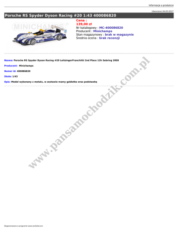 Informacje o produkcie Utworzono 04-03-2017 Porsche RS Spyder Dyson Racing #20 1:43 400086820 Cena : 139,00 zł Nr katalogowy : MC-400086820 Producent : Minichamps Stan magazynowy : brak w magazynie Średnia ocena : brak recenzji .p l Nazwa: Porsche RS Spyder Dyson Racing #20 LeitzingerFranchitti 2nd Place 12h Sebring 2008 Skala: 1/43 w w w .p an sa m oc ho dz ik Opis: Model wykonany z metalu, w zestawie mamy gablotke oraz podstawkę .c Numer id: 400086820 om Producent: Minichamps Wygenerowano w programie www.oscGold.com