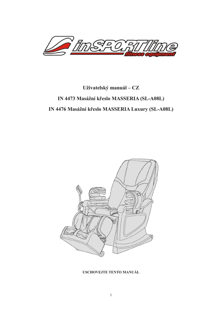 Uživatelský manuál – CZ IN 4473 Masážní křeslo MASSERIA (SL-A08L) IN 4476 Masážní křeslo MASSERIA Luxury (SL-A08L) USCHOVEJTE TENTO MANUÁL 1 Děkujeme Vám za zakoupení tohoto výrobku. Pro správné používání výrobku si před jeho prvním použitím přečtěte tento manuál. Nejdůležitější je dodržování bezpečnostních pokynů. Uschovejte manuál pro případ další potřeby. Poznámka: Naše společnost si vyhrazuje právo měnit vzhled a popis výrobku bez předchozího upozornění. Barva výrobku se může také lišit. Obsah Pokyny týkající se bezpečnosti a údržby................................................................................................................. 3 Názvy a funkce jednotlivých dílů............................................................................................................................ 5 Funkce a účinnost.................................................................................................................................................... 5 Způsob používání .................................................................................................................................................... 6 Popis výrobku ....................................................................................................................................................... 13 Záruční podmínky, reklamace ............................................................................................................................... 15 2 Pokyny týkající se bezpečnosti a údržby 1. Důležitá bezpečnostní upozornění • Zabraňte dětem kontaktu s pohyblivými částmi křesla. • Používejte napájecí kabel navržený pro tento výrobek a řádně jej uzemněte. • Předcházejte zraněním a poškození křesla tak, že po použití a před čištěním vytáhnete zástrčku napájecího kabelu. • Křeslo používejte pouze tak, jak je popsáno v manuálu. • Nepoužívejte žádné příslušenství, které není doporučeno. • Nepoužívejte křeslo ve venkovním prostředí. • Před použitím si přečtěte řádně tento manuál. • Používání křesla způsobem, který není uveden v tomto manuálu, je zakázáno. • Doporučujeme používat křeslo vždy po dobu 15 minut. • Křeslo nepoužívejte, je-li kůže jakkoliv poškozena. • Křeslo nepoužívejte, je-li potah či kůže poškozena. • Křeslo nepoužívejte, je-li větrací otvor zakrytý nebo jakkoliv zamezeno správnému větrání. • Na křeslo nepokládejte žádné předměty. • Neusínejte během používání křesla. • Křeslo nepoužívejte v případě, že jste předtím požili alkohol nebo se necítíte dobře. • Křeslo nepoužívejte nejméně jednu hodinu po jídle. • Předcházejte zranění a nepoužívejte příliš intenzivní masáž. 2. Umístění masážního křesla • Nepoužívejte křeslo při vysoké okolní teplotě a ve vlhkém prostředí, jako je např. koupelna. • Nepoužívejte křeslo bezprostředně po změně okolní teploty. • Křeslo nepoužívejte v prašném či jakkoliv nepříznivém prostředí. • Okolo křesla je třeba zajistit dostatečný volný prostor pro větrání. 3. Lidé, kteří by neměli křeslo používat • Křeslo by neměli používat lidé trpící osteoporózou. • Křeslo by neměli používat lidé trpící srdečním onemocněním nebo lidé, lidé s elektronickými implantáty jako je např. kardiostimulátor. • Křeslo by neměli používat lidé se zvýšenou tělesnou teplotou. • Těhotné ženy nebo ženy v období menstruace by neměly křeslo používat. • Zranění lidé a lidé s onemocněním kůže by neměli křeslo používat. • Děti mladší 14 let nebo lidé mentálně postiženi by neměli křeslo používat bez dozoru. • Křeslo by neměli používat lidé, kteří mají od lékaře doporučený klidový režim a lidé, kteří se necítí dobře. • Nepoužívejte křeslo, není-li Vaše tělo zcela suché. • Lidé citliví na teplo by neměli křeslo používat. • Povrch křesla je zahříván, proto musí být lidé citliví na vysokou teplotu opatrní při používání křesla. 4. Bezpečnost • Ujistěte se, že má elektrický zdroj vhodné napětí. • Nezapojujte zástrčku mokrýma rukama. • Do křesla se nesmí dostat voda, aby nedošlo k úrazu elektrickým proudem či poškození výrobku. • Dbejte na to, aby nedošlo k poškození kabelů a neupravujte elektrický obvod křesla. • K čištění elektrických částí jako je vypínač a zástrčka nepoužívejte vlhký hadr. • Nepřibližujte se ke křeslu, dojde-li k dočasnému přerušení přísunu elektrické energie a předcházejte tak zraněním. • Jestliže křeslo nefunguje správně, přestaňte jej používat a obraťte se na servisní centrum. • Jestliže se necítíte dobře, přestaňte křeslo používat a poraďte se s lékařem. 3 5. Údržba • Údržbu by měli provádět pouze kvalifikovaní servisní technici. Uživatelé by se neměli pokoušet křeslo rozebírat či provádět údržbu sami. • Nezapomínejte po použití vypínat napájení. • Nepoužívejte přístroj, je-li poškozená zástrčka kabelu či zdířka. • Jestliže se nebude křeslo po delší dobu používat, smotejte kabely a umístěte jej do suchého a čistého prostředí. • Nevystavujte křeslo vysokým teplotám, neumisťujte jej v blízkosti ohně a předcházejte dlouhodobému působení přímého slunečného záření na křeslo. • Čistěte křeslo pouze suchou látkou. Nepoužívejte ředidlo, benzen, ani alkohol. • Mechanické části křesla jsou speciálně navrženy a vyrobeny tak, že nevyžadují žádnou mimořádnou údržbu. • Dávejte pozor, aby nedošlo k poškození křesla předměty s ostrými hranami. • Neposouvejte křeslo po nerovném povrchu, vždy jej