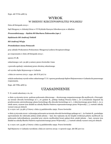 Sygn. akt VI Ka 468/13 WYROK W IMIENIU RZECZYPOSPOLITEJ POLSKIEJ Dnia 28 listopada 2013 r. Sąd Okręgowy w Jeleniej Górze w VI Wydziale Karnym Odwoławczym w składzie: Przewodniczący – Sędzia SO Barbara Żukowska (spr.) Sędziowie SO Andrzej Tekieli SO Andrzej Wieja Protokolant Anna Potaczek przy udziale Prokuratora Prokuratury Okręgowej Lesława Kwapiszewskiego po rozpoznaniu w dniu 28 listopada 2013 r. sprawy T. D. oskarżonego z art. 52 pkt 5 ustawy prawo łowieckie i inne z powodu apelacji, wniesionej przez obrońcę oskarżonego od wyroku Sądu Rejonowego w Lubaniu z dnia 20 czerwca 2013 r. sygn. akt II K 507/12 uchyla zaskarżony wyrok wobec oskarżonego T. D. i sprawę przekazuje Sądowi Rejonowemu w Lubaniu do ponownego rozpoznania. Sygn. akt VIKa 468/13 UZASADNIENIE T. D. został oskarżony o to, że: w dniu 14 stycznia 2012r. podczas polowania zbiorowego – dewizowego zorganizowanego dla myśliwych z Norwegii, na terenie obwodu łowieckiego nr (...)w gminie B., pełniąc funkcję Prezesa Koła (...)w L.świadomie dopuścił się przekroczenia zatwierdzonego planu łowieckiego dla obwodu łowieckiego nr (...) dzierżawionego przez Koło (...)o 11 sztuk saren, czynem tym działał na szkodę Skarbu Państwa reprezentowanego przez Wojewodę (...), wartość szkody wynosi 2191,50 złotych tj. o czyn z art. 52 pkt 5 Ustawy z dnia 13 października 1995r. Prawo łowieckie w dniu 15 stycznia 2012r. wykonując polowanie na terenie obwodu łowieckiego polnego nr (...)w Gminie B., posiadając upoważnienie do odstrzału jednej sztuki jelenia – łani, bez wpisania się do książki ewidencji pobytu myśliwych na polowaniu indywidualnym, pozyskał przy użyciu myśliwskiej broni palnej dwie sztuki jelenia – łani, czynem tym działał na szkodę Skarbu Państwa reprezentowanego przez Wojewodę (...), wartość szkody wynosi 1003,00 złotych tj. o czyn z art. 53 pkt 4 Ustawy z dnia 13 października 1995r. Prawo łowieckie Sąd Rejonowy w Lubaniu wyrokiem z dnia 20 czerwca 2013r. w sprawie sygn. akt IIK 507/12: ustalił, iż oskarżony T. D. dopuścił się popełnienia zarzucanych mu czynów opisanych w pkt. I części wstępnej stanowiącego występek z art. 52 pkt. 5 Ustawy Prawo łowieckie oraz w pkt. II części wstępnej wyroku z tym, że przyjął, iż ten czyn stanowi występek z art. 52 pkt 6 Ustawy Prawo łowieckie, ustalając jednocześnie, iż stopień winy i społecznej szkodliwości czynu nie jest znaczny na podstawie art. 66 § 1 i 2 kk i art. 67 § 1 kk warunkowo umorzył postępowanie na okres próby wynoszący 2 lata, na podstawie art. 67 § 3 kk w zw. z art. 46 § 2 kk zasądził od oskarżonego T. D. na rzecz pokrzywdzonego Skarbu Państwa reprezentowanego przez Wojewodę (...) kwotę 3.194,50 zł. tytułem nawiązki płatne po uprawomocnieniu się wyroku, na podstawie art. 627 kpk zasądził od oskarżonego na rzecz Skarbu Państwa koszty postępowania i na podstawie art. 17 ustęp 1 Ustawy z dnia 23 czerwca 1973r. o opłatach w sprawach karnych nie wymierzył mu opłaty. Apelację od całości powyższego wyroku wywiódł obrońca oskarżonego i zarzucił: naruszenie prawa procesowego, które mogło mieć wpływ na treść orzeczenia, tj. art. 6 kpk w zw. z art. 40 § 1 pkt 1 kpk w zw. z art. 47 kpk poprzez oparcie rozstrzygnięcia na materiale dowodowym zgromadzonym przez strażników Państwowej Straży (...) we W., którzy jako przedstawiciele pokrzywdzonego podlegali wyłączeniu a ponadto w zakresie punktu I części dyspozytywnej: co do czynu wyczerpującego znamiona art. 52 pkt 5 Prawa łowieckiego: - błędu w ustaleniach faktycznych przyjętych za podstawę rozstrzygnięcia poprzez przyjęcie, że na oskarżonym jako Prezesie Koła (...) w L. ciążył obowiązek zapobieżenia przekroczeniu zatwierdzonego planu łowieckiego oraz stwierdzenie, że oskarżony świadomie dopuścił się czynu polegającego na dopuszczeniu do przekroczenia planu pozyskania saren o 11 sztuk, podczas gdy oskarżony dopełnił wszelkiej staranności, aby zapobiec przekroczeniu planu, które ostatecznie dotyczyło tylko jednej sztuki sarny, - obrazy przepisów prawa procesowego, która miała wpływ na treść rozstrzygnięcia, a to art. 413 § 2 pkt 1 kpk w zw. z art. 424 § 1 pkt 1 kpk poprzez sprzeczność rozstrzygnięcia z treścią pisemnego uzasadnienia polegającą na stwierdzeniu w sentencji, że czyn oskarżonego odpowiadał opisowi pkt I części wstępnej, z której wynika, że miał dopuścić do przekroczenia planu pozyskania saren o 11 sztuk, przy jednoczesnym wyjaśnieniu w pisemnym uzasadnieniu, że w świetle aktualnych i przyjętych za podstawę orzeczenia przepisów, przekroczenie to dotyczyło tylko jednej sztuki, co do czynu wyczerpującego znamiona art. 52 pkt 5 Prawa łowieckiego – błędu w ustaleniach faktycznych przyjętych za podstawę rozstrzygnięcia poprzez przyjęcie, że oskarżony działał ze świadomością bezprawności swojego postępowania. w zakresie punktu II części dyspozytywnej wyroku – naruszenia prawa materialnego, a to art. 46 § 2 kk poprzez nałożenie na oskarżonego obowiązku uiszczenia na rzecz pokrzywdzonego nawiązki w kwocie odpowiadającej wartości tusz 11 sztuk saren i jednej łani, podczas gdy oskarżonemu przypisano czyn z art. 52 pkt 5 Prawa łowieckiego, który ma charakter formalny, a co za tym idzie – nie ma w tym zakresie ani szkody, ani pokrzywdzonego, zaś samo przekroczenie planu przez polujących miało dotyczyć tylko jednej sztuki sarny, a osobno później osobiście przez oskarżonego – jednej łani. Wskazując na powyższe obrońca wniósł o zmianę zaskarżonego wyroku poprzez uniewinnienie oskarżonego i zasądzenie na jego rzecz kosztów obrony według norm prawem przypisanych. W „odpowiedzi na apelację” pełnomocnik oskarżyciela posiłkowego wniósł o nieuwzględnienie podniesionych zarzutów i utrzymanie w mocy zaskarżonego wyroku. Sąd Okręgowy zważył, co następuje: Jako oc
