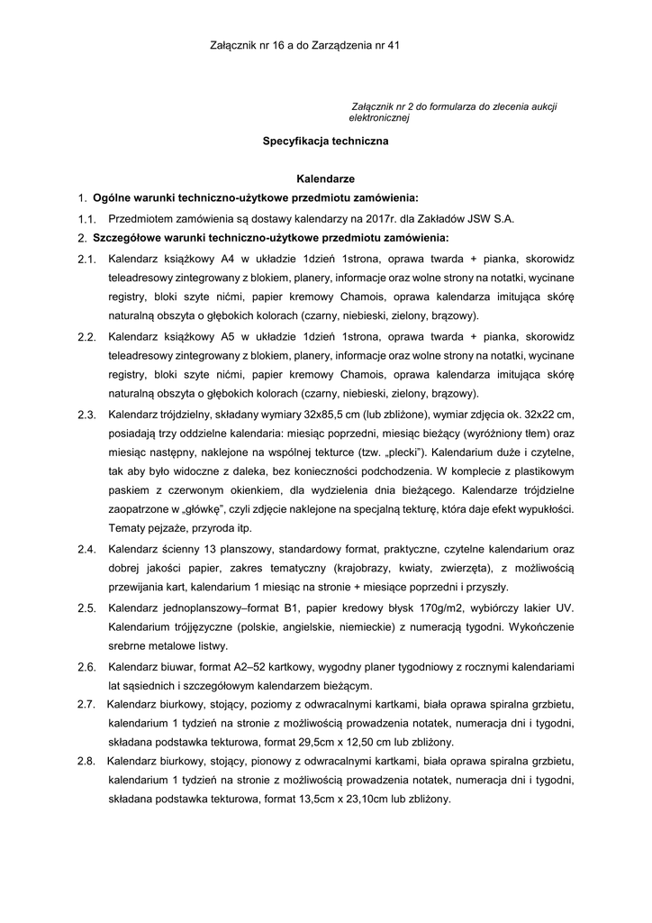 Załącznik nr 16 a do Zarządzenia nr 41 Załącznik nr 2 do formularza do zlecenia aukcji elektronicznej Specyfikacja techniczna Kalendarze Ogólne warunki techniczno-użytkowe przedmiotu zamówienia: Przedmiotem zamówienia są dostawy kalendarzy na 2017r. dla Zakładów JSW S.A. Szczegółowe warunki techniczno-użytkowe przedmiotu zamówienia: Kalendarz książkowy A4 w układzie 1dzień 1strona, oprawa twarda + pianka, skorowidz teleadresowy zintegrowany z blokiem, planery, informacje oraz wolne strony na notatki, wycinane registry, bloki szyte nićmi, papier kremowy Chamois, oprawa kalendarza imitująca skórę naturalną obszyta o głębokich kolorach (czarny, niebieski, zielony, brązowy). Kalendarz książkowy A5 w układzie 1dzień 1strona, oprawa twarda + pianka, skorowidz teleadresowy zintegrowany z blokiem, planery, informacje oraz wolne strony na notatki, wycinane registry, bloki szyte nićmi, papier kremowy Chamois, oprawa kalendarza imitująca skórę naturalną obszyta o głębokich kolorach (czarny, niebieski, zielony, brązowy). Kalendarz trójdzielny, składany wymiary 32x85,5 cm (lub zbliżone), wymiar zdjęcia ok. 32x22 cm, posiadają trzy oddzielne kalendaria: miesiąc poprzedni, miesiąc bieżący (wyróżniony tłem) oraz miesiąc następny, naklejone na wspólnej tekturce (tzw. „plecki”). Kalendarium duże i czytelne, tak aby było widoczne z daleka, bez konieczności podchodzenia. W komplecie z plastikowym paskiem z czerwonym okienkiem, dla wydzielenia dnia bieżącego. Kalendarze trójdzielne zaopatrzone w „główkę”, czyli zdjęcie naklejone na specjalną tekturę, która daje efekt wypukłości. Tematy pejzaże, przyroda itp. Kalendarz ścienny 13 planszowy, standardowy format, praktyczne, czytelne kalendarium oraz dobrej jakości papier, zakres tematyczny (krajobrazy, kwiaty, zwierzęta), z możliwością przewijania kart, kalendarium 1 miesiąc na stronie + miesiące poprzedni i przyszły. Kalendarz jednoplanszowy–format B1, papier kredowy błysk 170g/m2, wybiórczy lakier UV. Kalendarium trójjęzyczne (polskie, angielskie, niemieckie) z numeracją tygodni. Wykończenie srebrne metalowe listwy. Kalendarz biuwar, format A2–52 kartkowy, wygodny planer tygodniowy z rocznymi kalendariami lat sąsiednich i szczegółowym kalendarzem bieżącym. 2.7. Kalendarz biurkowy, stojący, poziomy z odwracalnymi kartkami, biała oprawa spiralna grzbietu, kalendarium 1 tydzień na stronie z możliwością prowadzenia notatek, numeracja dni i tygodni, składana podstawka tekturowa, format 29,5cm x 12,50 cm lub zbliżony. 2.8. Kalendarz biurkowy, stojący, pionowy z odwracalnymi kartkami, biała oprawa spiralna grzbietu, kalendarium 1 tydzień na stronie z możliwością prowadzenia notatek, numeracja dni i tygodni, składana podstawka tekturowa, format 13,5cm x 23,10cm lub zbliżony. Załącznik nr 16 a do Zarządzenia nr 41 2.9. Kalendarz biurkowy + piórnik z odwracalnymi kartkami, kalendarium 1 tydzień na stronie z możliwością prowadzenia notatek, numeracja dni i tygodni, podstawka tekturowa mieszcząca piórnik. 2.10. Kalendarz książkowy A4 w układzie tygodniowym, oprawa twarda + pianka, skorowidz teleadresowy zintegrowany z blokiem, planery, informacje oraz wolne strony na notatki, wycinane registry, bloki szyte nićmi, papier kremowy Chamois, oprawa kalendarza imitująca skórę naturalną obszyta o głębokich kolorach (czarny, niebieski, zielony, brązowy). Wykaz dokumentów składanych wraz z ofertą: Lista oferowanych pozycji materiałowych wraz z podaniem producenta (kolejność dokumentów w ofercie powinna odpowiadać kolejności w formularzu. Karta katalogowa danego materiału z zaznaczeniem na każdej karcie numeru pozycji w formularzu. Oświadczenie kontrahenta, że oferowane wyroby są zgodne z przedmiotem aukcji Wykaz dokumentów składanych wraz z pierwszą dostawą przedmiotu zamówienia: -Wykaz dokumentów składanych wraz z każdą dostawą przedmiotu zamówienia: -- * niepotrzebne usunąć