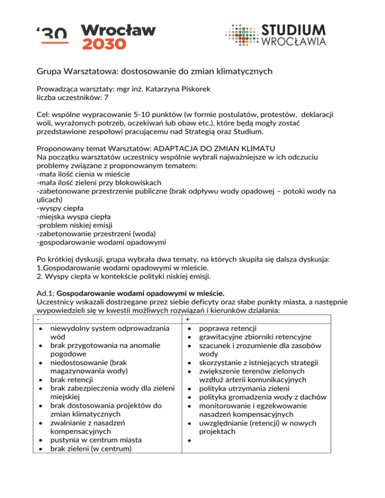 Grupa Warsztatowa: dostosowanie do zmian klimatycznych Prowadząca warsztaty: mgr inż. Katarzyna Piskorek liczba uczestników: 7 Cel: wspólne wypracowanie 5-10 punktów (w formie postulatów, protestów, deklaracji woli, wyrażonych potrzeb, oczekiwań lub obaw etc.), które będą mogły zostać przedstawione zespołowi pracującemu nad Strategią oraz Studium. Proponowany temat Warsztatów: ADAPTACJA DO ZMIAN KLIMATU Na początku warsztatów uczestnicy wspólnie wybrali najważniejsze w ich odczuciu problemy związane z proponowanym tematem: -mała ilość cienia w mieście -mała ilość zieleni przy blokowiskach -zabetonowane przestrzenie publiczne (brak odpływu wody opadowej – potoki wody na ulicach) -wyspy ciepła -miejska wyspa ciepła -problem niskiej emisji -zabetonowanie przestrzeni (woda) -gospodarowanie wodami opadowymi Po krótkiej dyskusji, grupa wybrała dwa tematy, na których skupiła się dalsza dyskusja: 1.Gospodarowanie wodami opadowymi w mieście. 2. Wyspy ciepła w kontekście polityki niskiej emisji. Ad.1: Gospodarowanie wodami opadowymi w mieście. Uczestnicy wskazali dostrzegane przez siebie deficyty oraz słabe punkty miasta, a następnie wypowiedzieli się w kwestii możliwych rozwiązań i kierunków działania: + niewydolny system odprowadzania poprawa retencji wód grawitacyjne zbiorniki retencyjne brak przygotowania na anomalie szacunek i zrozumienie dla zasobów pogodowe wody niedostosowanie (brak skorzystanie z istniejących strategii magazynowania wody) zwiększenie terenów zielonych brak retencji wzdłuż arterii komunikacyjnych brak zabezpieczenia wody dla zieleni polityka utrzymania zieleni miejskiej polityka gromadzenia wody z dachów brak dostosowania projektów do monitorowanie i egzekwowanie zmian klimatycznych nasadzeń kompensacyjnych zwalnianie z nasadzeń uwzględnianie (retencji) w nowych kompensacyjnych projektach pustynia w centrum miasta brak zieleni (w centrum) Po szczegółowej dyskusji zostały sformułowane cztery postulaty: I. ROZPOCZĘCIE PROJEKTOWANIA I BUDOWY SYSTEMU RETENCJI II. ZWIĘKSZENIE POWIERZCHNI TERENÓW ZIELONYCH W CENTRUM (W GRANICACH OBWODNICY ŚRÓDMIEJSKIEJ) ORAZ PRZY ARTERIACH KOMUNIKACYJNYCH; NASADZENIA KOMPENSACYJNE OBLIGATORYJNIE W CENTRUM MIASTA) III. DOSTOSOWANIE WYMOGÓW PRAWA MIEJSCOWEGO DO ZMIAN KLIMATYCZNYCH ORAZ EGZEKWOWANIE DECYZJI ADMINISTRACYJNYCH IV. ZACHĘTY DLA INWESTORÓW STOSUJĄCYCH ROZWIĄZANIA TYPU „OGRÓD DESZCZOWY”, „ZIELONE ŚCIANY” Ad.2: Wyspy ciepła w kontekście polityki niskiej emisji. Uczestnicy warsztatów odbyli dyskusję na temat przyczyn i skutków: przyczyny skutki kotłownie na paliwa stałe ósme najbardziej skażone miasto w Europie spaliny z pojazdów pogorszenie stanu zdrowia archaiczna komunikacja zbiorowa mieszkańców (plus najwyższy współczynnik pojazdów na liczbę ludności) smog niechęć mieszkańców do komunikacji straty finansowe zbiorowej (nieefektywna, przekroczone dopuszczalne stężenia nieskuteczna) pyłów zawieszonych indywidualne paleniska na paliwa wciąganie ruchu samochodowego do stałe miasta zbyt dużo zabudowanych przestrzeni straty energetyczne budynków nadmierne rozbudowanie infrastruktury dla komunikacji prywatnej Po dyskusji nad wskazanymi przyczynami i skutkami, uczestnicy stworzyli cztery punkty będące wyrazem ich oczekiwań oraz postulatami: I. ZMIANA PRIORYTETÓW INWESTYCYJNYCH MIASTA NA RZECZ KOMUNIKACJI ZBIOROWEJ (W TYM KOLEI AGLOMERACYJNEJ) II. OGRANICZENIE RUCHU SAMOCHODOWEGO W MIEŚCIE (GŁÓWNIE W CENTRUM, GDZIE POWINNY OBOWIĄZYWAĆ WYSOKIE OPŁATY ZA WJAZD I PARKING) III. UNIKANIE LOKALIZACJI ATRAKTORÓW RUCHU SAMOCHODOWEGO W CENTRUM (DUZE PARKINGI, GALERIE HANDLOWE Z PARKINGAMI) IV. WYMIANA PIECÓW NA PALIWA STAŁE Wypowiadając się na każdy z powyższych tematów, uczestnicy wielokrotnie w dyskusji podkreślali rolę bezwzględnego egzekwowania prawa oraz zaostrzanie przepisów.