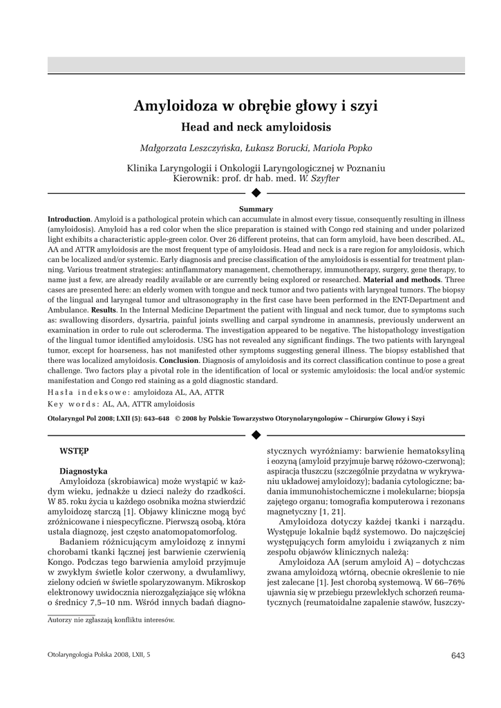 PRACE ORYGINALNE Amyloidoza w obrębie głowy i szyi Amyloidoza w obrębie głowy i szyi Head and neck amyloidosis Małgorzata Leszczyńska, Łukasz Borucki, Mariola Popko Klinika Laryngologii i Onkologii Laryngologicznej w Poznaniu Kierownik: prof. dr hab. med. W. Szyfter Summary Introduction. Amyloid is a pathological protein which can accumulate in almost every tissue, consequently resulting in illness (amyloidosis). Amyloid has a red color when the slice preparation is stained with Congo red staining and under polarized light exhibits a characteristic apple-green color. Over 26 different proteins, that can form amyloid, have been described. AL, AA and ATTR amyloidosis are the most frequent type of amyloidosis. Head and neck is a rare region for amyloidosis, which can be localized and/or systemic. Early diagnosis and precise classification of the amyloidosis is essential for treatment planning. Various treatment strategies: antinflammatory management, chemotherapy, immunotherapy, surgery, gene therapy, to name just a few, are already readily available or are currently being explored or researched. Material and methods. Three cases are presented here: an elderly women with tongue and neck tumor and two patients with laryngeal tumors. The biopsy of the lingual and laryngeal tumor and ultrasonography in the first case have been performed in the ENT-Department and Ambulance. Results. In the Internal Medicine Department the patient with lingual and neck tumor, due to symptoms such as: swallowing disorders, dysartria, painful joints swelling and carpal syndrome in anamnesis, previously underwent an examination in order to rule out scleroderma. The investigation appeared to be negative. The histopathology investigation of the lingual tumor identified amyloidosis. USG has not revealed any significant findings. The two patients with laryngeal tumor, except for hoarseness, has not manifested other symptoms suggesting general illness. The biopsy established that there was localized amyloidosis. Conclusion. Diagnosis of amyloidosis and its correct classification continue to pose a great challenge. Two factors play a pivotal role in the identification of local or systemic amyloidosis: the local and/or systemic manifestation and Congo red staining as a gold diagnostic standard. H a s ł a i n d e k s o w e : amyloidoza AL, AA, ATTR K e y w o r d s : AL, AA, ATTR amyloidosis Otolaryngol Pol 2008; LXII (5): 643–648 © 2008 by Polskie Towarzystwo Otorynolaryngologów – Chirurgów Głowy i Szyi WSTĘP Diagnostyka Amyloidoza (skrobiawica) może wystąpić w każdym wieku, jednakże u dzieci należy do rzadkości. W 85. roku życia u każdego osobnika można stwierdzić amyloidozę starczą [1]. Objawy kliniczne mogą być zróżnicowane i niespecyficzne. Pierwszą osobą, która ustala diagnozę, jest często anatomopatomorfolog. Badaniem różnicującym amyloidozę z innymi chorobami tkanki łącznej jest barwienie czerwienią Kongo. Podczas tego barwienia amyloid przyjmuje w zwykłym świetle kolor czerwony, a dwułamliwy, zielony odcień w świetle spolaryzowanym. Mikroskop elektronowy uwidocznia nierozgałęziające się włókna o średnicy 7,5–10 nm. Wśród innych badań diagno- stycznych wyróżniamy: barwienie hematoksyliną i eozyną (amyloid przyjmuje barwę różowo-czerwoną); aspiracja tłuszczu (szczególnie przydatna w wykrywaniu układowej amyloidozy); badania cytologiczne; badania immunohistochemiczne i molekularne; biopsja zajętego organu; tomografia komputerowa i rezonans magnetyczny [1, 21]. Amyloidoza dotyczy każdej tkanki i narządu. Występuje lokalnie bądź systemowo. Do najczęściej występujących form amyloidu i związanych z nim zespołu objawów klinicznych należą: Amyloidoza AA (serum amyloid A) – dotychczas zwana amyloidozą wtórną, obecnie określenie to nie jest zalecane [1]. Jest chorobą systemową. W 66–76% ujawnia się w przebiegu przewlekłych schorzeń reumatycznych (reumatoidalne zapalenie stawów, łuszczy- Autorzy nie zgłaszają konfliktu interesów. Otolaryngologia Polska 2008, LXII, 5 643 M. Leszczyńska i inni cowe zapalenie stawów, choroba Stilla, choroba Behceta); w 3–9% – w przewlekłych chorobach zapalnych i nowotworach (sarkoidoza, mukowiscydoza, choroba Leśniowskiego-Crohna, wrzodziejące zapalenie jelita grubego, przewlekłe odmiedniczkowe zapalenie nerek, gruźlica, zakażenie HIV, chłoniak ziarniczy, chłoniak nieziaraniczy, rak nerki) [6]. Złogi amyloidu umiejscawiają się w narządach miąższowych (wątroba, śledziona, nerki) [7], sercu, przewodzie pokarmowym. W konsekwencji doprowadzają najczęściej do zespołu nerczycowego, kardiomiopatii, zaburzenia wchłaniania, biegunki [1, 8]. Amyloidoza AL (amyloid light chain) – historycznie nazywana amyloidozą pierwotną [1]. Istota amyloidozy AL polega na klonalnym rozroście komórek plazmatycznych w szpiku kostnym i produkcji lekkich łańcuchów immunoglobulin. W 80% przypadków u podłoża amyloidozy AL leży gammapatia monoklonalna, w tym w 20% to szpiczak mnogi. Najczęściej dotyczy: nerek, serca, przewodu pokarmowego i autonomicznego układu nerwowego [9]. Klinicznie, do objawów zwiastunowych systemowej amyloidozy AL zaliczamy: zespół nerczycowy, zaburzenia rytmu serca, biegunki, zaparcia, znaczną utratę masy ciała, organomegalię, polinuropatię z zespołem cieśni nadgarstka na czele [1]. 90% pacjentów z systemową amyloidozą AL rozwija amyloidozę górnych dróg oddechowych i górnego odcinka przewodu pokarmowego z makroglossią jako objawem patognomonicznym [9]. Amyloidoza ATTR – choroba występująca rodzinnie, dziedziczona autosomalnie dominująco. Transtyretina (TTR) to białko transportujące, wiążące: tyroksynę i białko wiążące retinol. Mutacja genu dla transtyretyny jest przyczyną następujących schorzeń: polineuropatii, kardiomiopatii restrykcyjnej, zaburzenia wchłaniania, rytmu serca, funkcji nerek, wątroby, wzroku, centralnego