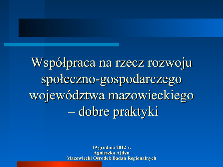 Współpraca na rzecz rozwoju społeczno-gospodarczego województwa mazowieckiego – dobre praktyki 19 grudnia 2012 r. Agnieszka Ajdyn Mazowiecki Ośrodek Badań Regionalnych Plan prezentacji 1. 2. 3. Podejmowane działania wspólne jako element efektywnego zarządzania rozwojem województwa. Inne formy współpracy – przykłady. Działania/produkty MOBR jako narzędzia do budowy i monitoringu strategii rozwoju. Podejmowane działania wspólne jako element efektywnego zarządzania rozwojem województwa Współpraca w zarysie Kto? - Mazowiecki Ośrodek Badań Regionalnych, Mazowieckie Biuro Planowania Regionalnego, Departament Geodezji i Kartografii Urzędu Marszałkowskiego Od kiedy? - od 2009 r Jak? - porozumienia formalne - brak Dlaczego? – wspólny cel Jakie prace? – analizy na zlecenie, wspólne projekty badawcze, narzędzie internetowe do monitorowania rozwoju Mazowsza Prace o charakterze badawczym realizowane na zlecenie Delimitacja obszarów o cechach miejskich i cechach wiejskich w województwie mazowieckim Wspólne prace o charakterze badawczym Narzędzie internetowe – Monitorowanie rozwoju Mazowsza Departament Geodezji i Kartografii UM Mazowiecki System Informacji Przestrzennej Internetowe narzędzie monitorowania Baza wiedzy o Mazowszu MAZOWIECKI OŚRODEK BADAŃ REGIONALNYCH Regionalna baza wiedzy Monitorowanie rozwoju Mazowsza – narzędzie internetowe Narzędzie internetowe – Monitorowanie rozwoju Mazowsza Od tego się zaczęło w 2011 r. Fiszka projektowa Narzędzie internetowe – Monitorowanie rozwoju Mazowsza Podział zadań wg kompetencji jednostek oraz wiedzy i umiejętności poszczególnych pracowników, 7-osobowy zespół + kierownicy nadzorujący prace w ramach wcześniej przypisanych zadań, Bez porozumienia czy innego dokumentu formalizującego przedsięwzięcie, 60 wskaźników (pogrupowanych w 10 bloków tematycznych), Prezentacja danych statystycznych o regionie w podziale na podregiony, powiaty i gminy, w długich szeregach czasowych (1999-2010), Udostępnione 26 listopada br. http://mrm.wrotamazowsza.pl/ http://mrm.wrotamazowsza.pl http://mrm.wrotamazowsza.pl http://mrm.wrotamazowsza.pl Inne formy współpracy przykłady Płaszczyzna współpracy Porozumienie z Geodetą Województwa Mazowieckiego dot. zasilania MSIP danymi statystycznymi (2005 r.) budowa i cykliczna aktualizacja baz danych Mazowieckiego Systemu Informacji Przestrzennej, wykorzystanie systemów informacji przestrzennej do aktualizacji przebiegu granic rejonów i obwodów spisowych oraz wizualizacji danych z rejestru TERYT, przekazywanie nowych rozwiązań technicznych na potrzeby realizacji prac statutowych US w tym przy wizualizacji danych. Płaszczyzna współpracy Regionalna Strategia Innowacji dla Mazowsza – umowa wykorzystanie danych statystycznych na etapie tworzenia projektu strategii oraz diagnozy, określenie danych/wskaźników niezbędnych do budowy systemu monitoringu i podstaw ewaluacji strategii, cykliczne zasilanie systemu danymi statystycznymi, Płaszczyzna współpracy Stołeczne Forum Przedsiębiorczości – porozumienie realizacja wspólnych badań dotyczących przedsiębiorczości, upowszechnianie wiedzy i edukacja statystyczna przedsiębiorców warszawskich, cykliczne przekazywanie danych z rejestru REGON pozwalających na podejmowanie efektywnych działań na rzecz małych i średnich przedsiębiorstw. Działania/produkty MOBR jako narzędzia do budowy i monitoringu dokumentów strategicznych Podejmowane działania: Samodzielne: Ankieta badająca zapotrzebowanie jednostek samorządu terytorialnego na informacje statystyczne Publikacje i opracowania sygnalne Opracowania analityczne Konferencje tematyczne Ankieta badająca zapotrzebowanie na informacje statystyczne Cel: określenie znajomości i stopnia wykorzystania zasobów informacyjnych US (lub przyczyn niekorzystania), potrzeb informacyjnych oraz gotowości współpracy, ocena przydatności publikacji i funkcjonalności strony internetowej, Odbiorcy: starostwa powiatowe oraz urzędy miast/gmin i urzędy dzielnic Termin realizacji: koniec czerwca 2012, Działania podjęte na podstawie wyników ankiety: Spotkanie z przedstawicielami jst – prezentacja multimedialna na temat zasad funkcjonowania systemu statystyki publicznej, Przekazanie uwag i spostrzeżeń dotyczących serwisu internetowego jednostkom odpowiadającym za ich modyfikację, Rozszerzenie dotychczasowych działań związanych z promocją wydawnictw US, Ustalenie priorytetów dotyczących tematyki opracowań analitycznych, Uruchomienie newslettera, Publikacje i opracowania sygnalne Opracowania analityczne Wskaźnik poziomu występowania i zagrożenia ubóstwem przasnyski ostrołęcki żu rom iń ski m w m aakkoow sskkii cie c ha now ski sie rp ecki Płock gostyniński Ostrołęka m ław sk i płoński p łocki ostrowski pułtuski wyszkowski nowodworski legionowski wołomiński warszawskim.st. sochaczewski zachodni Warszawa miński grodziskipruszkowski otwocki żyrardowski piaseczyński grójecki garwoliński białobrzeski kozienicki 0,00 0,29 niski 0,30 0,59 umiarkowany przysuski 0,60 1,00 wysoki sokołowski węgrowski Radom zwoleński ski szydłowieckiradom lipski siedlecki Siedlce łosicki Opracowania analityczne Opracowania analityczne Możliwości wykorzystania informacji statystycznych Dokumenty strategiczne na etapie stawiania diagnozy, przy monitorowaniu strategii i jej ocenie, do prognozowania na lata przyszłe, Możliwości wykorzystania informacji statystycznych Pozostałe działania sporządzanie własnych opracowań analitycznych na potrzeby bieżącej działalności, korzystanie ze środków funduszy europejskich, wspomaganie procesów decyzyjnych, aktualizacja strony internetowej. Dziękuję za uwagę Mazowiecki Ośrodek Badań Regionalnych http://www.stat.gov.pl/warsz/