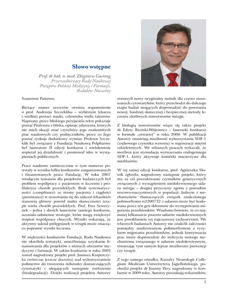 Słowo wstępne Prof. dr hab. n. med. Zbigniew Gaciong Przewodniczący Rady Naukowej Postępów Polskiej Medycyny i Farmacji, Redaktor Naczelny Szanowni Państwo, Bieżący numer zeszytów otwiera wspomnienie o prof. Andrzeju Szczekliku – wybitnym lekarzu i wielkiej postaci nauki, człowieku wielu talentów. Napisany przez bliskiego przyjaciela tekst pokazuje postać Profesora z bliska, opisuje zdarzenia, których nie mieli okazji znać czytelnicy jego znakomitych prac naukowych czy podręczników, przez co Jego postać zyskuje dodatkowy wymiar. Profesor Szczeklik był związany z Fundacja Naukową Polpharmy był laureatem II edycji konkursu i wielokrotnie wspierał jej działalność i promował idee w wystąpieniach publicznych. Prace naukowe zamieszczone w tym numerze powstały w wyniku kilku konkursów zorganizowanych i finansowanych przez Fundację. W roku 2007 wiodącym tematem dla projektów badawczych był problem współpracy z pacjentem w leczeniu i profilaktyce chorób przewlekłych. Brak systematyczności (compliance) ze strony pacjenta i ciągłości (persistance) w stosowaniu się do zaleceń lekarskich stanowią główny powód małej skuteczności terapii wielu chorób przewlekłych. Prof. Ewa Sewerynek – jedna z dwóch laureatów tamtego konkursu, oceniała odmienne strategie, które mogą zwiększyć stopień współpracy chorych. Wyniki wskazują, że aktywny udział pielęgniarek w terapii może znacząco poprawić wyniki leczenia. W większości konkursów Fundacji, Rada Naukowa nie określała tematyki, umożliwiając uzyskanie finansowania dla projektów z różnych obszarów medycyny i farmacji. W takim konkursie w roku 2003 został nagrodzony projekt prof. Janusza Kasperczyka (wówczas jeszcze docenta) nad wykorzystaniem polimerów do tworzenia mikrosfer dostarczających cytostatyki i ulegających następnie rozłożeniu (biodegradacji). Dzięki realizacji projektu Autorzy stworzyli nowy oryginalny nośnik dla często stosowanych cytostatyków, który przechodzi do dalszego etapu badań mogących doprowadzić do powstania nowej, bardziej skutecznej i bezpiecznej metody leczenia złośliwych nowotworów mózgu. Z biologią nowotworów wiąże się także projekt dr Edyty Brzóski-Wójtowicz – laureatki konkursu w formule „otwartej” w roku 2008. W publikacji Autorzy omawiają możliwość wykorzystania SDF-1 (zrębowego czynnika wzrostu) w regeneracji mięśni szkieletowych. We własnych pracach wykazali, że możliwa jest stymulacja wytwarzania endogennego SDF-1, który aktywuje komórki macierzyste dla mioblastów. W tej samej edycji konkursu, prof. Agnieszka Słowik zgłosiła, nagrodzony następnie projekt, który ma za cel poszukiwanie czynników genetycznych związanych z wystąpieniem niedokrwiennego udaru mózgu – drugiej przyczyny zgonu z powodów sercowo-naczyniowych w populacji. Jednym z mechanizmów tłumaczących związek znalezionego polimorfizmu rs2200732 z udarem może być kodowana przez ten gen skłonność do występowania migotania przedsionków. Wiadomo bowiem, że co najmniej kilkanaście procent udarów niedokrwiennych jest powikłaniem tej najczęstszej tachyarytmii, We własnych badaniach Autorzy nie znaleźli zależności pomiędzy analizowanym polimorfizmem a ryzykiem migotania przedsionków, jednak kontynuacja prac może doprowadzić do wykrycia nowego mechanizmu związanego w udarem niedokrwiennym, stwarzając tym samym lepsze możliwości prewencji czy terapii. Z tego samego ośrodka, Katedry Neurologii Collegium Medicum Uniwersytetu Jagiellońskiego, pochodzi projekt dr Joanny Pery, nagrodzony w konkursie w 2009 roku. Autorzy poszukują wskaźników, 5 które pozwolą na wykrycie osób szczególnie zagrożonych istnieniem tętniaka wewnątrzczaszkowego o wysokim prawdopodobieństwie pęknięcia i krwotoku podpajęczynówkowego. W badaniach Autorzy wykorzystali nowoczesną metodę jednoczasowej analizy wielu genów w krążących komórkach krwi z wykorzystaniem mikromacierzy. Wyniki sugerują istnienie odrębnych profili ekspresji dla chorych szczególnie zagrożonych. Współcześnie u chorych z udarem niedokrwiennym jedyną szansa uniknięcia trwałego kalectwa jest wczesne zastosowanie leków fibrynolitycznych, obarczonych jednak dużym ryzykiem poważnych powikłań, dotykających nawet 10% poddanych terapii. Nadzieje na lepsze preparaty wiąże się z rozwojem biotechnologii. Rozwój metod diagnostyki i terapii opartych na biotechnologii należy do wiodących zadań Fundacji i był także tematem konkursu w roku 2006. Nagrodzony wówczas zespół – kierowany przez prof. Janusza Szemraja, opracował drogą inżynierii genetycznej nowe białka o właściwościach trombolitycznych, oparte na cząsteczce stafylokinazy i wykazujące zwiększone powinowactwo do białek skrzepu. Nowy produkt przeszedł pomyślnie pierwsze badania w modelu zwierzęcym 6 i można mieć nadzieję, że znajduje się na ścieżce prowadzącej do kliniki. Receptory dla serotoniny stanowią miejsce uchwytu wielu leków stosowanych w psychiatrii. W 2002 roku Fundacja nagrodziła projekt poszukiwania nowych cząsteczek wiążących się z receptorem dla serotoniny. Zespół kierowany przez Prof. Andrzeja Bojarskiego przebadał 39 związków pochodzących z własnej biblioteki Instytutu Farmacji, wykazując w badaniach na zwierzętach, że posiadają właściwości przeciwdepresyjne. Autorzy przeprowadzili też modelowanie komputerowe interakcji ligand-receptor, identyfikując struktury istotne dla działania nowych leków. Ostatnia praca w tym numerze, także pochodzi z konkursu o otwartej formule ogłoszonego w roku 2009. Zespół Prof. Marka Jagielskiego z Państwowego Zakładu Higieny wykazał, że stosowana przez nich metoda genotypowania stanowi przydatne narzędzie do analizy zmienności szczepów bakterii błonicy, która nadal stanowi zagrożenie epidemiczne, także w naszym kraju. Zapraszam do lektury.