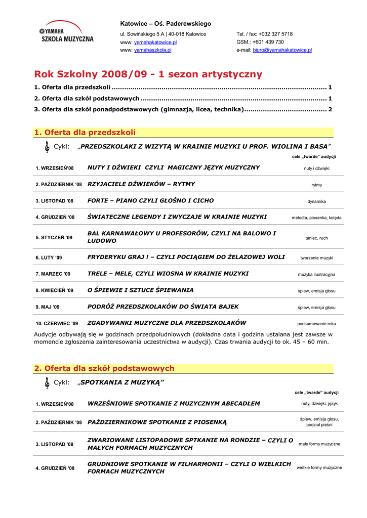 Katowice – Oś. Paderewskiego ul. Sowińskiego 5 A | 40-018 Katowice Tel. / fax: +032 327 5718 www: yamahakatowice.pl GSM.: +601 439 730 www: yamahaszkola.pl e-mail: [email protected] Rok Szkolny 2008/09 - 1 sezon artystyczny 1. Oferta dla przedszkoli ........................................................................................................ 1 2. Oferta dla szkół podstawowych .......................................................................................... 1 3. Oferta dla szkół ponadpodstawowych (gimnazja, licea, technika)........................................ 2 1. Oferta dla przedszkoli & Cykl: „PRZEDSZKOLAKI Z WIZYTĄ W KRAINIE MUZYKI U PROF. WIOLINA I BASA” cele „twarde” audycji 1. WRZESIEŃ’08 NUTY I DŹWIEKI CZYLI MAGICZNY JĘZYK MUZYCZNY 2. PAŹDZIERNIK ’08 RZYJACIELE DŹWIEKÓW – RYTMY 3. LISTOPAD ’08 FORTE – PIANO CZYLI GŁOŚNO I CICHO 4. GRUDZIEŃ ’08 ŚWIATECZNE LEGENDY I ZWYCZAJE W KRAINIE MUZYKI 5. STYCZEŃ ’09 BAL KARNAWAŁOWY U PROFESORÓW, CZYLI NA BALOWO I LUDOWO 6. LUTY ’09 FRYDERYKU GRAJ ! – CZYLI POCIĄGIEM DO ŻELAZOWEJ WOLI 7. MARZEC ’09 TRELE – MELE, CZYLI WIOSNA W KRAINIE MUZYKI muzyka ilustracyjna 8. KWIECIEŃ ’09 O ŚPIEWIE I SZTUCE ŚPIEWANIA śpiew, emisja głosu 9. MAJ ’09 PODRÓŻ PRZEDSZKOLAKÓW DO ŚWIATA BAJEK śpiew, emisja głosu 10. CZERWIEC ’09 ZGADYWANKI MUZYCZNE DLA PRZEDSZKOLAKÓW podsumowanie roku nuty i dźwięki rytmy dynamika melodia, piosenka, kolęda taniec, ruch tworzenie muzyki Audycje odbywają się w godzinach przedpołudniowych (dokładna data i godzina ustalana jest zawsze w momencie zgłoszenia zainteresowania uczestnictwa w audycji). Czas trwania audycji to ok. 45 – 60 min. 2. Oferta dla szkół podstawowych & Cykl: „SPOTKANIA Z MUZYKĄ” cele „twarde” audycji 1. WRZESIEŃ’08 WRZEŚNIOWE SPOTKANIE Z MUZYCZNYM ABECADŁEM 2. PAŹDZIERNIK ’08 PAŻDZIERNIKOWE SPOTKANIE Z PIOSENKĄ 3. LISTOPAD ’08 ZWARIOWANE LISTOPADOWE SPTKANIE NA RONDZIE – CZYLI O MAŁYCH FORMACH MUZYCZNYCH małe formy muzyczne 4. GRUDZIEŃ ’08 GRUDNIOWE SPOTKANIE W FILHARMONII – CZYLI O WIELKICH FORMACH MUZYCZNYCH wielkie formy muzyczne nuty, dźwięki, język śpiew, emisja głosu, podział pieśni www.yamahakatowice.pl „Audycje Muzyczne prowadzone przez Szkołę Muzyczna Yamaha w Katowicach to „AUDYCJE INNE NIŻ WSZYSTKIE”, z uwagi na ciekawe metody przyswajania wiedzy, bazujące na aktywnym słuchaniu muzyki połączone z rozwijaniem zainteresowań muzycznych wśród dzieci i młodzieży.” 5. STYCZEŃ ’09 W ZIMOWYM NASTROJU STYCZNIOWYM charakter i nastrój w utworach 6. LUTY ’09 ZIMOWA WĘDRÓWKA DO GALERII OBRAZÓW MALOWANYCH MUZYKĄ – CZYLI O MUZYCE ILUSTRACYJNEJ I PROGRAMOWEJ muzyka ilustracyjna / programowa 7. MARZEC ’09 W MARCOWYCH BARWACH I ODCIENIACH AEROFONÓW CZYLI INSTRUMENTÓW DĘTYCH instrumenty muzyczne 8. KWIECIEŃ ’09 WIOSENNE SPOTKANIE Z WIBRUJĄCĄ STRUNĄ CHORDOFONÓW instrumenty muzyczne 9. MAJ ’09 MAJOWE SPOTKANIE NA POLSKIEJ ZIEMI CZYLI O MUZYCE PATRIOTYCZNEJ I NARODOWEJ 10. CZERWIEC ’09 ROZTAŃCZONE LATO NA POLSKIEJ WSI. O MUZYCE I TAŃCACH LUDOWYCH Polska muzyka narodowa taniec i muzyka ludowa Audycje odbywają się w godzinach przedpołudniowych (dokładna data i godzina ustalana jest zawsze w momencie zgłoszenia zainteresowania uczestnictwa w audycji). Czas trwania audycji to ok. 60 – 90 min. 3. Oferta dla szkół ponadpodstawowych (gimnazja, licea, technika) & Cykl: „OD JESIENNCH SPOTKAŃ BAROKOWYCH PRZEZ KLASYCZNE WIECZORY ZIMOWE DO ROMANTYCZNYCH PORANKÓW WIOSENNYCH” cele „twarde” audycji 1. WRZESIEŃ’08 BAROK – PERŁA O NIERÓWNYCH BRZEGACH epoka 2. PAŹDZIERNIK ’08 J. S. BACH; J. F. HAENDEL; A. VIVALDI – MISTRZAMI BAROKU twórcy 3. LISTOPAD ’08 FORMY I DZIEŁA MUZYKI BAROKOWEJ dzieła 4. GRUDZIEŃ ’08 O PANACH W ŻABOTACH I PERUKACH CZYLI O MUZYCE KLASYCZNEJ epoka 5. STYCZEŃ ’09 WIEDEŃSKIE TRIO CZYLI J. HAYDN, W.A. MOZART I L.VAN BEETHOVEN twórcy 6. LUTY ’09 KLASYCZNY = DOSKONAŁY CZYLI O STYLU I FORMACH MUZYKI KLASYCZNEJ dzieła 7. MARZEC ’09 SZTUKA DLA SZTUKI CZYLI O MUZYCE W EPOCE ROMANTYCZNEJ epoka 8. KWIECIEŃ ’09 FRYDERYK CHOPIN – NAJWYBITNIEJSZA POSTAĆ KULTURY POLSKIEJ twórcy 9. MAJ ’09 10. CZERWIEC ’09 EMOCJONALIZM, LIRYZM I SUBIEKTYWIZM W ROMANTYCZNYCH FORMACH I UTWORACH MUZYCZNYCH XIX WIECZNE STYLE NARODOWE W MUZYCE (NEOROMANTYZM) dzieła epoka / twórcy / dzieła / szkoły Audycje odbywają się w godzinach przedpołudniowych (dokładna data i godzina ustalana jest zawsze w momencie zgłoszenia zainteresowania uczestnictwa w audycji). Czas trwania audycji to ok. 60 – 90 min. Szkoła Muzyczna YAMAHA w Katowicach istnieje od września 2006 roku i jest jedną z najlepszych w kraju. Potwierdzeniem są nagrody „Szkoła Roku 2006 / 2007” oraz „Szkoła Roku 2007 / 2008”. Obecnie uczy się w niej ponad 300 uczniów na 21 programach nauczania, w tym prawie 30 niemowlaków. Szkoła planuje wprowadzenie nowych programów (skrzypce, perkusja dla dzieci), jak również wdrożenie systemu zarządzania jakością, zgodnego z normą ISO 9001:2000. Więcej informacji na www.yamahakatowice.pl