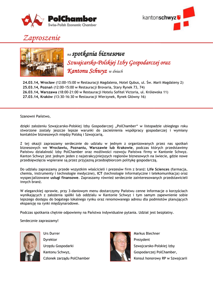 Zaproszenie na spotkania biznesowe Szwajcarsko--Polskiej Izby Gospodarczej oraz Szwajcarsko Kantonu Kantonu Schwyz w dniach 24.03.14, Wrocław (12:00-15:00 w Restauracji Magdalena, Hotel Qubus, ul. Św. Marii Magdaleny 2) 25.03.14, Poznań (12:00-15:00 w Restauracji Brovaria, Stary Rynek 73, 74) 26.03.14, Warszawa (18:00-21:00 21:00 w Restauracji Hotelu Sofitel Victoria, ul. Królewska 11) 11 27.03.14, Kraków (13:30-16:30 w Restauracji Wierzynek, Rynek Główny 16) Szanowni Państwo, dzięki załoŜeniu Szwajcarsko-Polskiej Polskiej Izby Gospodarczej „PolChamber“ „PolChamber“ w listopadzie ubiegłego ubiegł roku stworzone zostałyy jeszcze lepsze warunki do zacieśnienia współpracy gospodarczej i wymiany kontaktów biznesowych między Polską i Szwajcarią. Szwajcarią Z tej okazji zapraszamy apraszamy serdecznie do udziału udział w jednym z organizowanych przez nas spotkań biznesowych we Wrocławiu, iu, Poznaniu, Warszawie lub Krakowie, Krakowie, podczas których przedstawimy Państwu działalność Izby PolChamber oraz moŜliwości rozwoju Państwa firmy w Kantonie Schwyz. Kanton Schwyz jest jednym jeden z najatrakcyjniejszych regionów biznesowych na świecie, gdzie nowe przedsięwzięcia wspierane są przez przyjazną przedsiębiorcom politykę gospodarczą. Do udziału zapraszamy przede wszystkim właścicieli i prezesów pr firm z branŜ: Life Sciences (farmacja, chemia, instrumenty i technologie medyczne), medyczne) ICT (technologie informatyczne i telekomunikacja) telek oraz wyspecjalizowane usługi ugi finansowe. finansowe Zapraszamy równieŜ serdecznie zainteresowanych przedstawicieli innych branŜ. W eleganckiej oprawie, przy 3-daniowym daniowym menu dostarczymy Państwu cenne informacje o korzyściach wynikających z załoŜenia spółki lub oddziału oddział w Kantonie Schwyz i tym samym zapewnienie sobie lepszego dostępu do bogatego lokalnego rynku oraz renomowanego adresu dla podmiotów planujących ekspansję na rynki międzynarodowe. Podczas spotkania chętnie odpowiemy na Państwa indywidualne pytania. Udział jest bezpłatny. bezpł Serdecznie zapraszamy! Urs Durrer Markus Blechner Dyrektor Prezydent Urzędu Gospodarki Szwajcarsko--Polskiej Izby Kantonu Schwyz, Gospodarczej PolChamber, Członek zarządu du PolChamber Konsul honorowy RP w Szwajcarii Największe zalety Kantonu Schwyz • PołoŜenie w centrum Europy oraz w regionie gospodarczym Zurich • Międzynarodowe lotnisko Zurich-Kloten Zurich oddalone o niecałą godzinę jazdy samochodem • Bardzo niskie podatki dla firm oraz osób osó prywatnych (jedne z najniŜszych w Szwajcarii i na świecie) • Klaster Medtech w miejscowości miejscowoś Küssnacht am Rigi: start w maju 2014 • Wysoko wykwalifikowana, wielojęzyczna wieloję kadra specjalistów • Wysoki standard Ŝycia • Dostęp do renomowanych uniwersytetów uniwersy i innych szkół wyŜszych • Sprawna obsługa w urzędach dach administracji gospodarczej Wiecej informacji o PolChamber oraz Kantonie Schwyz znajdziecie Państwo tutaj: www.polchamber.org www.sz.ch www.medtechcluster.ch www.financevalley.ch KARTA ZGŁOSZENIOWA OSZENIOWA: Prosimy o przesłanie nam wiąŜącego zgłoszenia zgł do dnia 17.03.2014 E-MAIL: [email protected] [email protected] (zeskanowane) lub FAX: 0049 351 8626 4310 Serdecznie dziękujemy! Liczba uczestników kaŜdego ze spotkań jest ograniczona. Ostateczne potwierdzenie udziału otrzymają Państwo od nas jak najszybciej drogą mailową. Dziękujemy za wyrozumiałość. wyrozumiałość Niniejszym zgłaszam swój udział w spotkaniu biznesowym Szwajcarsko-Polskiej Szwajcarsko Polskiej Izby Gospodarczej oraz Kantonu Schwyz w (prosimy prosimy zakreślić odpowiednią datę i miasto): □Wrocław (24.03.) □Poznań (25. 25.03.) □Warszawa (26.03.) □Kraków (27.0 03.) Imię i nazwisko………………………………………………………………………………………………………………. ………………………………………………………………………………………………………………. Firma………………………………………………………………………………………………………………………………. Rok załoŜenia………………………………………… ………………………………………… Liczba pracowników……………………………………… ……………………………………… Stanowisko w firmie…………………….……………………………………………………………………………… ………………………………………………………………………………… … E-mail….………………………………………………………………………………………………………………………….. mail….………………………………………………………………………………………………………………………….. Telefon.………………………………………………………………………………………………………………………….. .………………………………………………………………………………………………………………………….. Zaproszenie otrzymano od (osoba lub instytucja, przez którą zostali Państwo stwo zaproszeni): zaproszeni ………………………………………………………………………………………………………………………….. Interesują ą mnie szczególnie nastepujące nastepują tematy dotyczące rynku szwajcarskiego: □ ZałoŜenie spółki □ Filia dystrybucyjna □ Kwestie celne lub podatkowe Inne: ………………………………………………………………………………………………………………………………………. Data, Podpis………….………………………………………………………………………………