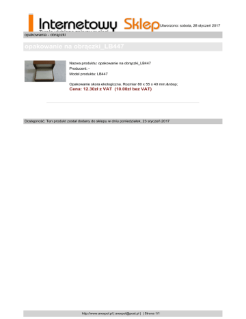 Utworzono: sobota, 28 styczeń 2017 opakowania - obrączki opakowanie na obrączki_LB447 Nazwa produktu: opakowanie na obrączki_LB447 Producent: Model produktu: LB447 Opakowanie skora ekologiczna. Rozmiar 80 x 55 x 40 mm. Cena: 12.30zł z VAT (10.00zł bez VAT) Dostępność: Ten produkt został dodany do sklepu w dniu poniedziałek, 23 styczeń 2017 http://www.arexpol.pl | [email protected] | | Strona 1/1