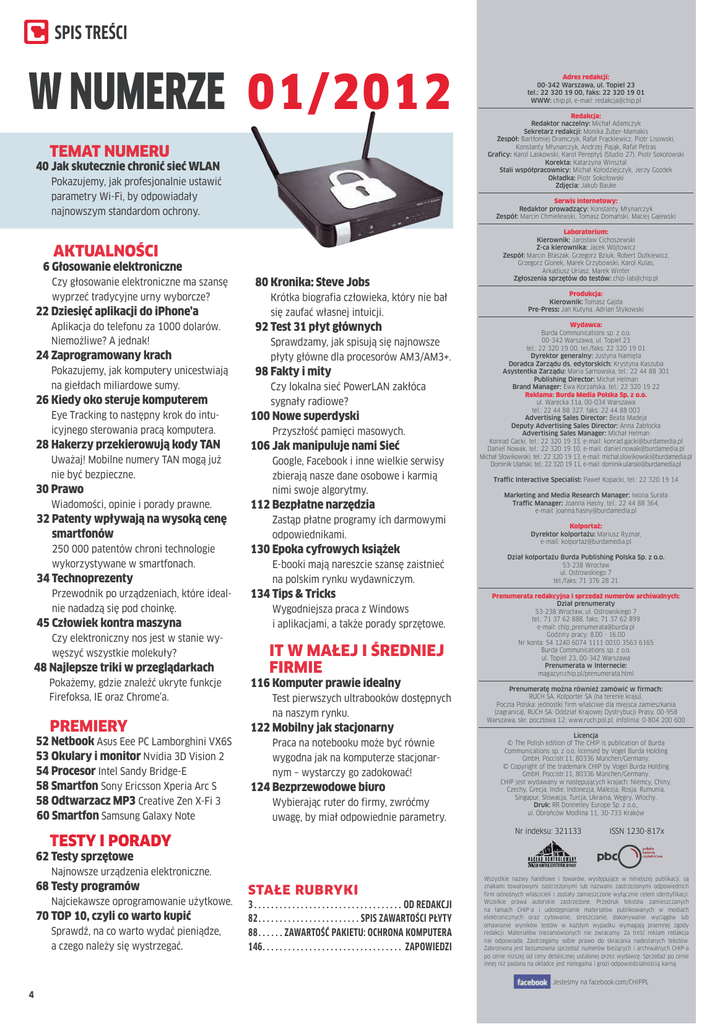 SPIS TREŚCI W NUMERZE 01/2012 TEMAT NUMERU 40 Jak skutecznie chronić sieć WLAN Pokazujemy, jak profesjonalnie ustawić parametry Wi-Fi, by odpowiadały najnowszym standardom ochrony. AKTUALNOŚCI 22 Dziesięć aplikacji do iPhone’a Aplikacja do telefonu za 1000 dolarów. Niemożliwe? A jednak! 24 Zaprogramowany krach Pokazujemy, jak komputery unicestwiają na giełdach miliardowe sumy. 26 Kiedy oko steruje komputerem Eye Tracking to następny krok do intuicyjnego sterowania pracą komputera. 28 Hakerzy przekierowują kody TAN Uważaj! Mobilne numery TAN mogą już nie być bezpieczne. 30 Prawo Wiadomości, opinie i porady prawne. 32 Patenty wpływają na wysoką cenę smartfonów 250 000 patentów chroni technologie wykorzystywane w smartfonach. 34 Technoprezenty Przewodnik po urządzeniach, które idealnie nadadzą się pod choinkę. 45 Człowiek kontra maszyna Czy elektroniczny nos jest w stanie wywęszyć wszystkie molekuły? 48 Najlepsze triki w przeglądarkach 80 Kronika: Steve Jobs Krótka biografia człowieka, który nie bał się zaufać własnej intuicji. 92 Test 31 płyt głównych Sprawdzamy, jak spisują się najnowsze płyty główne dla procesorów AM3/AM3+. 98 Fakty i mity Czy lokalna sieć PowerLAN zakłóca sygnały radiowe? 100 Nowe superdyski Przyszłość pamięci masowych. 106 Jak manipuluje nami Sieć Google, Facebook i inne wielkie serwisy zbierają nasze dane osobowe i karmią nimi swoje algorytmy. 112 Bezpłatne narzędzia Zastąp płatne programy ich darmowymi odpowiednikami. 130 Epoka cyfrowych książek E-booki mają nareszcie szansę zaistnieć na polskim rynku wydawniczym. 134 Tips & Tricks Wygodniejsza praca z Windows i aplikacjami, a także porady sprzętowe. IT W MAŁEJ I ŚREDNIEJ FIRMIE Pokażemy, gdzie znaleźć ukryte funkcje Firefoksa, IE oraz Chrome’a. 116 Komputer prawie idealny PREMIERY 122 Mobilny jak stacjonarny 52 Netbook Asus Eee PC Lamborghini VX6S 53 Okulary i monitor Nvidia 3D Vision 2 54 Procesor Intel Sandy Bridge-E 58 Smartfon Sony Ericsson Xperia Arc S 58 Odtwarzacz MP3 Creative Zen X-Fi 3 60 Smartfon Samsung Galaxy Note Redakcja: Redaktor naczelny: Michał Adamczyk Sekretarz redakcji: Monika Żuber-Mamakis Zespół: Bartłomiej Dramczyk, Rafał Frąckiewicz, Piotr Lisowski, Konstanty Młynarczyk, Andrzej Pająk, Rafał Petras Graficy: Karol Laskowski, Karol Perepłyś (Studio 27), Piotr Sokołowski Korekta: Katarzyna Winsztal Stali współpracownicy: Michał Kołodziejczyk, Jerzy Gozdek Okładka: Piotr Sokołowski Zdjęcia: Jakub Bauke Serwis internetowy: Redaktor prowadzący: Konstanty Młynarczyk Zespół: Marcin Chmielewski, Tomasz Domański, Maciej Gajewski 6 Głosowanie elektroniczne Czy głosowanie elektroniczne ma szansę wyprzeć tradycyjne urny wyborcze? Adres redakcji: 00-342 Warszawa, ul. Topiel 23 tel.: 22 320 19 00, faks: 22 320 19 01 WWW: chip.pl, e-mail: [email protected] Test pierwszych ultrabooków dostępnych na naszym rynku. Praca na notebooku może być równie wygodna jak na komputerze stacjonarnym – wystarczy go zadokować! 124 Bezprzewodowe biuro Wybierając ruter do firmy, zwróćmy uwagę, by miał odpowiednie parametry. Laboratorium: Kierownik: Jarosław Cichoszewski Z-ca kierownika: Jacek Wójtowicz Zespół: Marcin Błaszak, Grzegorz Bziuk, Robert Dutkiewicz, Grzegorz Glonek, Marek Grzybowski, Karol Kulas, Arkadiusz Uriasz, Marek Winter Zgłoszenia sprzętów do testów: [email protected] Produkcja: Kierownik: Tomasz Gajda Pre-Press: Jan Kutyna, Adrian Stykowski Wydawca: Burda Communications sp. z o.o. 00-342 Warszawa, ul. Topiel 23 tel.: 22 320 19 00, tel./faks: 22 320 19 01 Dyrektor generalny: Justyna Namięta Doradca Zarządu ds. edytorskich: Krystyna Kaszuba Asystentka Zarządu: Maria Sarnowska, tel.: 22 44 88 301 Publishing Director: Michał Helman Brand Manager: Ewa Korzańska, tel.: 22 320 19 22 Reklama: Burda Media Polska Sp. z o.o. ul. Warecka 11a, 00-034 Warszawa tel.: 22 44 88 327, faks: 22 44 88 003 Advertising Sales Director: Beata Madeja Deputy Advertising Sales Director: Anna Zabłocka Advertising Sales Manager: MIchał Helman Konrad Gacki, tel.: 22 320 19 33, e-mail: [email protected] Daniel Nowak, tel.: 22 320 19 10, e-mail: [email protected] Michał Słowikowski, tel.: 22 320 19 13, e-mail: [email protected] Dominik Ulański, tel.: 22 320 19 11, e-mail: [email protected] Traffic Interactive Specialist: Paweł Kopacki, tel.: 22 320 19 14 Marketing and Media Research Manager: Iwona Surała Traffic Manager: Joanna Hasny, tel.: 22 44 88 364, e-mail: [email protected] Kolportaż: Dyrektor kolportażu: Mariusz Ryznar, e-mail: [email protected] Dział kolportażu Burda Publishing Polska Sp. z o.o. 53-238 Wrocław ul. Ostrowskiego 7 tel./faks: 71 376 28 21 Prenumerata redakcyjna i sprzedaż numerów archiwalnych: Dział prenumeraty 53-238 Wrocław, ul. Ostrowskiego 7 tel.: 71 37 62 888, faks: 71 37 62 899 e-mail: [email protected] Godziny pracy: 8.00 - 16.00 Nr konta: 54 1240 6074 1111 0010 3563 6165 Burda Communications sp. z o.o. ul. Topiel 23, 00-342 Warszawa Prenumerata w Internecie: magazyn.chip.pl/prenumerata.html Prenumeratę można również zamówić w firmach: RUCH SA, Kolporter SA (na terenie kraju), Poczta Polska: jednostki firm właściwe dla miejsca zamieszkania (zagranica), RUCH SA: Oddział Krajowej Dystrybucji Prasy, 00-958 Warszawa, skr. pocztowa 12; www.ruch.pol.pl, infolinia: 0-804 200 600 Licencja © The Polish edition of The CHIP is publication of Burda Communications sp. z o.o. licensed by Vogel Burda Holding GmbH, Poccistr.11, 80336 München/Germany. © Copyright of the trademark CHIP by Vogel Burda Holding GmbH, Poccistr.11, 80336 München/Germany. CHIP jest wydawany w następujących krajach: Niemcy, Chiny, Czechy, Grecja, Indie, Indonezja, Malezja, Rosja, Rumunia, Singapur, Słowacja, Turcja, Ukraina, Węgry, Włochy. Druk: RR Donnelley Europe Sp. z o.o., ul. Obrońców Modlina 11, 30-733 Kraków Nr indeksu: 321133 TESTY I PORADY ISSN 1230-817x 62 Testy sprzętow