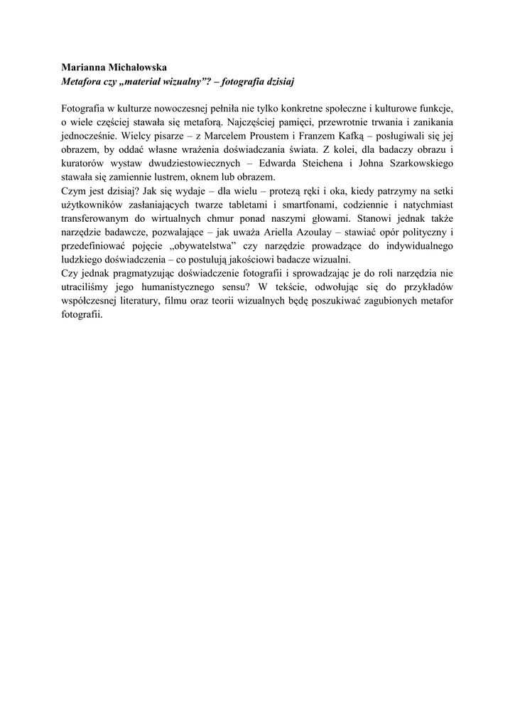 Marianna Michałowska Metafora czy „materiał wizualny”? – fotografia dzisiaj Fotografia w kulturze nowoczesnej pełniła nie tylko konkretne społeczne i kulturowe funkcje, o wiele częściej stawała się metaforą. Najczęściej pamięci, przewrotnie trwania i zanikania jednocześnie. Wielcy pisarze – z Marcelem Proustem i Franzem Kafką – posługiwali się jej obrazem, by oddać własne wrażenia doświadczania świata. Z kolei, dla badaczy obrazu i kuratorów wystaw dwudziestowiecznych – Edwarda Steichena i Johna Szarkowskiego stawała się zamiennie lustrem, oknem lub obrazem. Czym jest dzisiaj? Jak się wydaje – dla wielu – protezą ręki i oka, kiedy patrzymy na setki użytkowników zasłaniających twarze tabletami i smartfonami, codziennie i natychmiast transferowanym do wirtualnych chmur ponad naszymi głowami. Stanowi jednak także narzędzie badawcze, pozwalające – jak uważa Ariella Azoulay – stawiać opór polityczny i przedefiniować pojęcie „obywatelstwa” czy narzędzie prowadzące do indywidualnego ludzkiego doświadczenia – co postulują jakościowi badacze wizualni. Czy jednak pragmatyzując doświadczenie fotografii i sprowadzając je do roli narzędzia nie utraciliśmy jego humanistycznego sensu? W tekście, odwołując się do przykładów współczesnej literatury, filmu oraz teorii wizualnych będę poszukiwać zagubionych metafor fotografii.