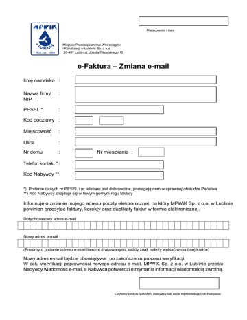 Miejscowość i data Miejskie Przedsiębiorstwo Wodociągów i Kanalizacji w Lublinie Sp. z o.o. 20-407 Lublin al. Józefa Piłsudskiego 15 e-Faktura – Zmiana e-mail Imię nazwisko : Nazwa firmy NIP : : PESEL * : Kod pocztowy : Miejscowość : Ulica : Nr domu : Nr mieszkania : - Telefon kontakt * : Kod Nabywcy **: *) Podanie danych nr PESEL i nr telefonu jest dobrowolne, pomagają nam w sprawnej obsłudze Państwa **) Kod Nabywcy znajduje się w lewym górnym rogu faktury Informuję o zmianie mojego adresu poczty elektronicznej, na który MPWiK Sp. z o.o. w Lublinie powinien przesyłać faktury, korekty oraz duplikaty faktur w formie elektronicznej. Dotychczasowy adres e-mail Nowy adres e-mail (Prosimy o podanie adresu e-mail literami drukowanymi, każdy znak należy wpisać w osobnej kratce) Nowy adres e-mail będzie obowiązywał po zakończeniu procesu weryfikacji. W celu weryfikacji poprawności nowego adresu e-mail, MPWiK Sp. z o.o. w Lublinie prześle Nabywcy wiadomość e-mail, a Nabywca potwierdzi otrzymanie informacji wiadomością zwrotną. Czytelny podpis /pieczęć/ Nabywcy lub osób reprezentujących Nabywcę