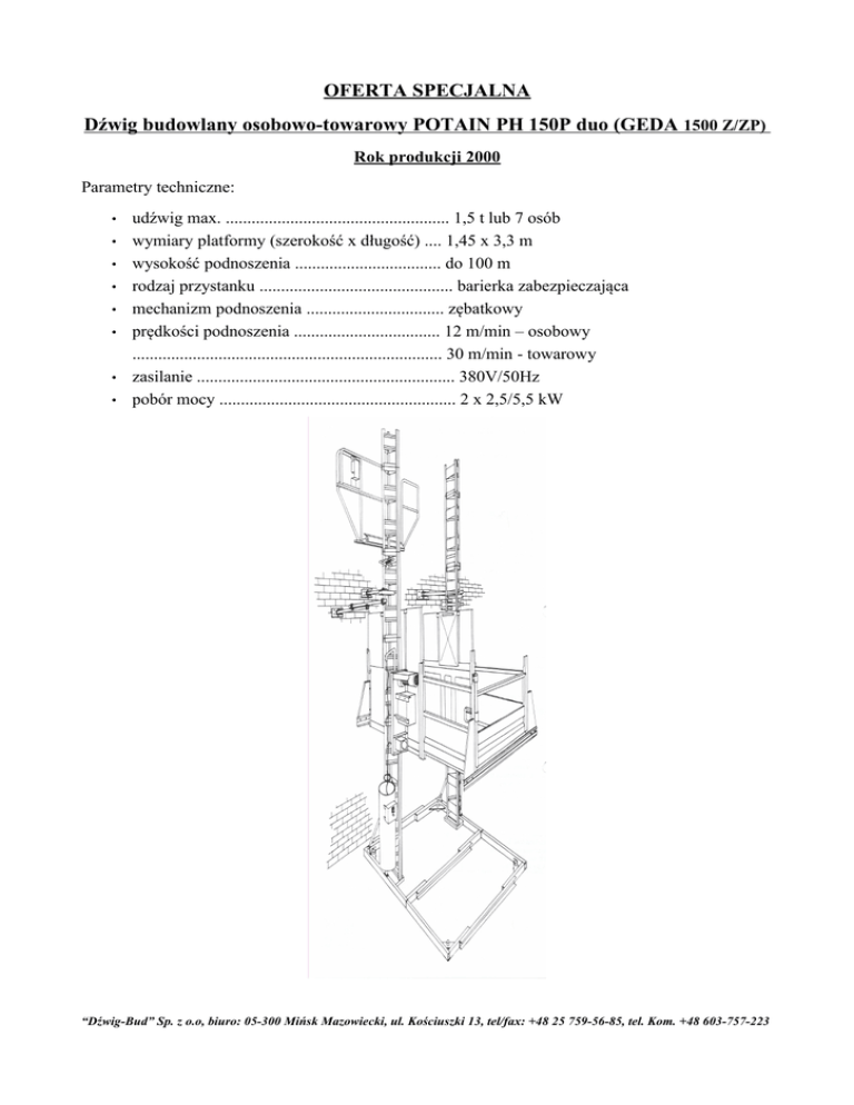 OFERTA SPECJALNA Dźwig budowlany osobowo-towarowy POTAIN PH 150P duo (GEDA 1500 Z/ZP) Rok produkcji 2000 Parametry techniczne: • • • • • • • • udźwig max. .................................................... 1,5 t lub 7 osób wymiary platformy (szerokość x długość) .... 1,45 x 3,3 m wysokość podnoszenia .................................. do 100 m rodzaj przystanku ............................................. barierka zabezpieczająca mechanizm podnoszenia ................................ zębatkowy prędkości podnoszenia .................................. 12 m/min – osobowy ........................................................................ 30 m/min - towarowy zasilanie ............................................................ 380V/50Hz pobór mocy ....................................................... 2 x 2,5/5,5 kW “Dźwig-Bud” Sp. z o.o, biuro: 05-300 Mińsk Mazowiecki, ul. Kościuszki 13, tel/fax: +48 25 759-56-85, tel. Kom. +48 603-757-223