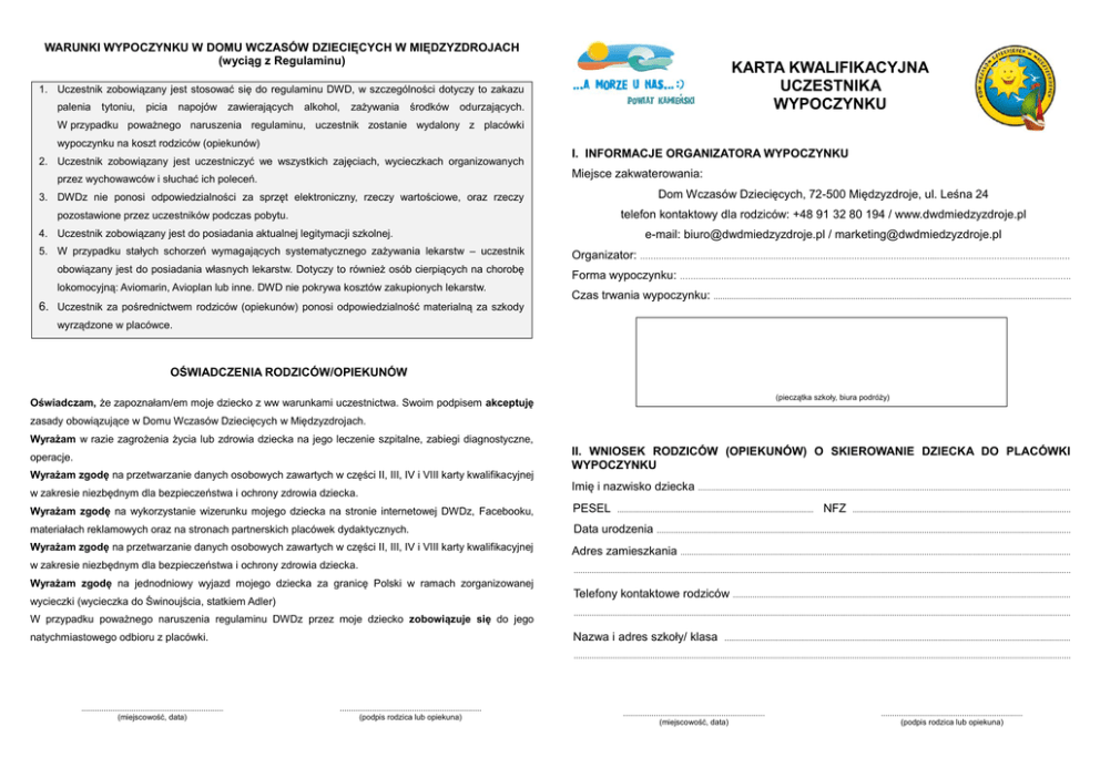 WARUNKI WYPOCZYNKU W DOMU WCZASÓW DZIECIĘCYCH W MIĘDZYZDROJACH (wyciąg z Regulaminu) KARTA KWALIFIKACYJNA UCZESTNIKA WYPOCZYNKU 1. Uczestnik zobowiązany jest stosować się do regulaminu DWD, w szczególności dotyczy to zakazu palenia tytoniu, picia napojów zawierających alkohol, zażywania środków odurzających. W przypadku poważnego naruszenia regulaminu, uczestnik zostanie wydalony z placówki wypoczynku na koszt rodziców (opiekunów) 2. Uczestnik zobowiązany jest uczestniczyć we wszystkich zajęciach, wycieczkach organizowanych I. INFORMACJE ORGANIZATORA WYPOCZYNKU Miejsce zakwaterowania: przez wychowawców i słuchać ich poleceń. Dom Wczasów Dziecięcych, 72-500 Międzyzdroje, ul. Leśna 24 3. DWDz nie ponosi odpowiedzialności za sprzęt elektroniczny, rzeczy wartościowe, oraz rzeczy telefon kontaktowy dla rodziców: +48 91 32 80 194 / www.dwdmiedzyzdroje.pl pozostawione przez uczestników podczas pobytu. 4. Uczestnik zobowiązany jest do posiadania aktualnej legitymacji szkolnej. 5. W przypadku stałych schorzeń wymagających systematycznego zażywania lekarstw – uczestnik obowiązany jest do posiadania własnych lekarstw. Dotyczy to również osób cierpiących na chorobę lokomocyjną: Aviomarin, Avioplan lub inne. DWD nie pokrywa kosztów zakupionych lekarstw. 6. Uczestnik za pośrednictwem rodziców (opiekunów) ponosi odpowiedzialność materialną za szkody e-mail: [email protected] / [email protected] Organizator: …………………………………………………………………………………………………...…………………………………………… Forma wypoczynku: …………..………………………………………………………………………………………………………………………. Czas trwania wypoczynku: .................................................................................................................................................................... wyrządzone w placówce. OŚWIADCZENIA RODZICÓW/OPIEKUNÓW (pieczątka szkoły, biura podróży) Oświadczam, że zapoznałam/em moje dziecko z ww warunkami uczestnictwa. Swoim podpisem akceptuję a zasady obowiązujące w Domu Wczasów Dziecięcych w Międzyzdrojach. Wyrażam w razie zagrożenia życia lub zdrowia dziecka na jego leczenie szpitalne, zabiegi diagnostyczne, operacje. Wyrażam zgodę na przetwarzanie danych osobowych zawartych w części II, III, IV i VIII karty kwalifikacyjnej w zakresie niezbędnym dla bezpieczeństwa i ochrony zdrowia dziecka. II. WNIOSEK RODZICÓW (OPIEKUNÓW) O SKIEROWANIE DZIECKA DO PLACÓWKI WYPOCZYNKU Imię i nazwisko dziecka ........................................................................................................................................................................... Wyrażam zgodę na wykorzystanie wizerunku mojego dziecka na stronie internetowej DWDz, Facebooku, PESEL materiałach reklamowych oraz na stronach partnerskich placówek dydaktycznych. Data urodzenia .............................................................................................................................................................................................. Wyrażam zgodę na przetwarzanie danych osobowych zawartych w części II, III, IV i VIII karty kwalifikacyjnej Adres zamieszkania ................................................................................................................................................................................... w zakresie niezbędnym dla bezpieczeństwa i ochrony zdrowia dziecka. Wyrażam zgodę na jednodniowy wyjazd mojego dziecka za granicę Polski w ramach zorganizowanej wycieczki (wycieczka do Świnoujścia, statkiem Adler) .......................................................................................... NFZ .................................................................................................... .................................................................................................................................................................................................................................... Telefony kontaktowe rodziców ........................................................................................................................................................... W przypadku poważnego naruszenia regulaminu DWDz przez moje dziecko zobowiązuje się do jego .................................................................................................................................................................................................................................... natychmiastowego odbioru z placówki. Nazwa i adres szkoły/ klasa ............................................................................................................................................................... .................................................................................................................................................................................................................................... ................................................................. (miejscowość, data) ................................................................. (podpis rodzica lub opiekuna) ................................................................. (miejscowość, data) ................................................................. (podpis rodzica lub opiekuna) III. INFORMACJA RODZICÓW (OPIEKUNÓW) O STANIE ZDROWIA DZIECKA V. INFORMACJA WYCHOWAWCY KLASY O DZIECKU Wypełniając dokładnie tą część karty, umożliwiają nam Państwo podjęcie właściwych działań, gdy dziecko wymagać będzie interwencji medycznej. W przypadku braku możliwości uzyskania opinii wychowawcy klasy, wypełnia rodzic lub opiekun. 1. Proszę podkreślić dolegliwości i objawy, które występują u dziecka: omdlenia, drgawki z utratą przytomn