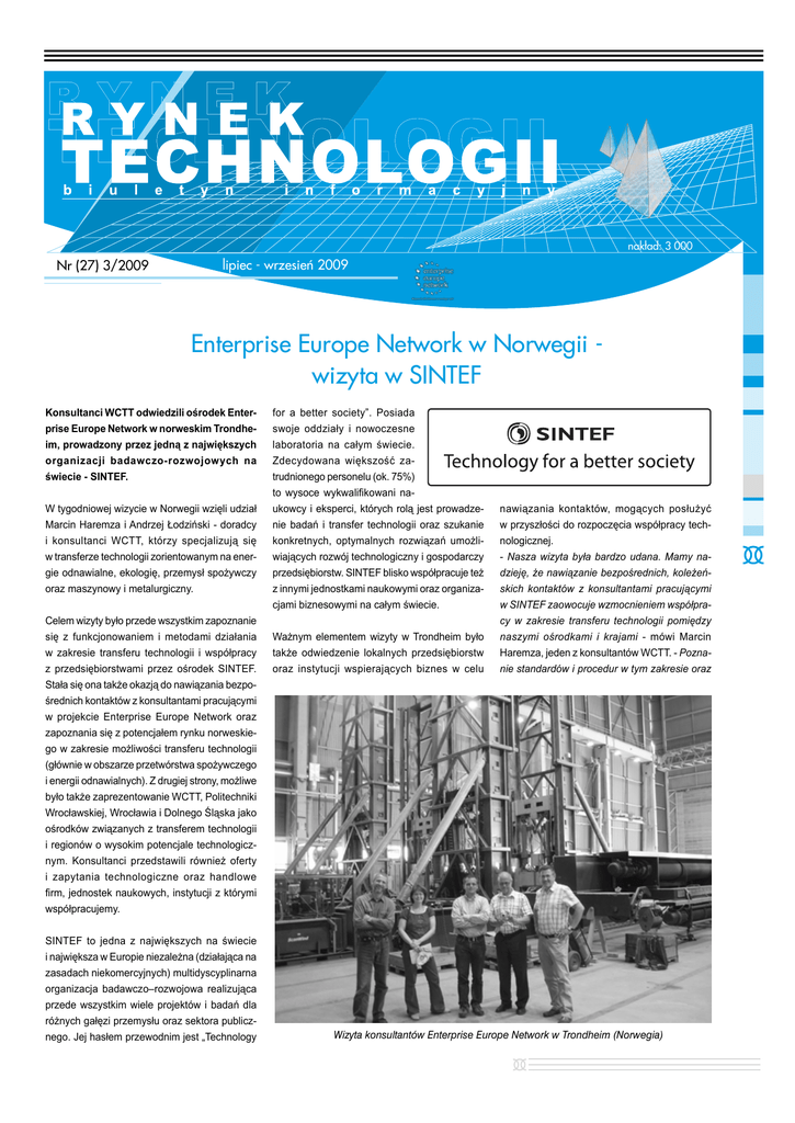 nakład: 3 000 Nr (27) 3/2009 lipiec - wrzesień 2009 Enterprise Europe Network w Norwegii wizyta w SINTEF Konsultanci WCTT odwiedzili ośrodek Enterprise Europe Network w norweskim Trondheim, prowadzony przez jedną z największych organizacji badawczo-rozwojowych na świecie - SINTEF. W tygodniowej wizycie w Norwegii wzięli udział Marcin Haremza i Andrzej Łodziński - doradcy i konsultanci WCTT, którzy specjalizują się w transferze technologii zorientowanym na energie odnawialne, ekologię, przemysł spożywczy oraz maszynowy i metalurgiczny. Celem wizyty było przede wszystkim zapoznanie się z funkcjonowaniem i metodami działania w zakresie transferu technologii i współpracy z przedsiębiorstwami przez ośrodek SINTEF. Stała się ona także okazją do nawiązania bezpośrednich kontaktów z konsultantami pracującymi w projekcie Enterprise Europe Network oraz zapoznania się z potencjałem rynku norweskiego w zakresie możliwości transferu technologii (głównie w obszarze przetwórstwa spożywczego i energii odnawialnych). Z drugiej strony, możliwe było także zaprezentowanie WCTT, Politechniki Wrocławskiej, Wrocławia i Dolnego Śląska jako ośrodków związanych z transferem technologii i regionów o wysokim potencjale technologicznym. Konsultanci przedstawili również oferty i zapytania technologiczne oraz handlowe firm, jednostek naukowych, instytucji z którymi współpracujemy. SINTEF to jedna z największych na świecie i największa w Europie niezależna (działająca na zasadach niekomercyjnych) multidyscyplinarna organizacja badawczo–rozwojowa realizująca przede wszystkim wiele projektów i badań dla różnych gałęzi przemysłu oraz sektora publicznego. Jej hasłem przewodnim jest „Technology for a better society”. Posiada swoje oddziały i nowoczesne laboratoria na całym świecie. Zdecydowana większość zatrudnionego personelu (ok. 75%) to wysoce wykwalifikowani naukowcy i eksperci, których rolą jest prowadzenie badań i transfer technologii oraz szukanie konkretnych, optymalnych rozwiązań umożliwiających rozwój technologiczny i gospodarczy przedsiębiorstw. SINTEF blisko współpracuje też z innymi jednostkami naukowymi oraz organizacjami biznesowymi na całym świecie. Ważnym elementem wizyty w Trondheim było także odwiedzenie lokalnych przedsiębiorstw oraz instytucji wspierających biznes w celu nawiązania kontaktów, mogących posłużyć w przyszłości do rozpoczęcia współpracy technologicznej. - Nasza wizyta była bardzo udana. Mamy nadzieję, że nawiązanie bezpośrednich, koleżeńskich kontaktów z konsultantami pracującymi w SINTEF zaowocuje wzmocnieniem współpracy w zakresie transferu technologii pomiędzy naszymi ośrodkami i krajami - mówi Marcin Haremza, jeden z konsultantów WCTT. - Poznanie standardów i procedur w tym zakresie oraz Wizyta konsultantów Enterprise Europe Network w Trondheim (Norwegia) wymiana doświadczeń pomiędzy nami pozwoli nam skuteczniej działać oraz lepiej organizować naszą pracę. Wizyty w firmach i instytucjach dały możliwość bezpośredniego poznania i zorientowania się w ich profilach działalności i potrzebach oraz były szansą nawiązania dalszych, owocnych kontaktów biznesowych. - Zauważyliśmy także, że kontakty i współpraca pomiędzy jednostkami B+R (takimi jak m.in. SINTEF) a przemysłem stoją w Norwegii na dużo wyższym poziomie niż w Polsce - dodaje Haremza. - Co za tym idzie, współpraca jest dużo bardziej efektywna. Przemysł wie, co może uzyskać od nauki, natomiast nauka wie, co ma oferować przemysłowi – konkretnie do jego potrzeb. U nas ten proces niestety w większości przypadków nadal szwankuje. Konsultanci Enterprise Europe Network: Marcin Haremza, [email protected] Andrzej Łodziński, [email protected] Współpraca z norweskimi przedsiębiorstwami i instytucjami Bardzo ważnym elementem wizyty w Norwegii było nawiązanie kontaktów z lokalnymi firmami i instytucjami okołobiznesowymi. Były to m.in.: technologie mogące znaleźć zastosowanie w technologii żywności. - NTNU (Norweski Uniwersytet Nauki i Technologii). Mieliśmy wiele interesujących spotkań z naukowcami uniwersytetu oraz wizyt w laboratoriach w obszarze energii odnawialnych, przede wszystkim energii wodnej, słonecznej oraz wykorzystania biomasy. Zaprezentowano nam również projekty realizowane przez uniwersyteckie Centrum Transferu Technologii z którym wymieniliśmy praktyczne doświadczenia w tym zakresie. - Scan Wind – jedna z największych norweskich firm produkująca platformy wiertnicze oraz wiatraki energetyczne. Pokazano nam schematycznie cykl produkcji wiatraków z omówieniem ich parametrów technicznych oraz możliwościami praktycznego wykorzystania celem pozyskiwania energii wiatrowej. Elektrownie wiatrowe to gałąź energii odnawialnych, która bardzo dynamicznie się rozwija (w Norwegii aż 20% energii elektrycznej pochodzi z elektrowni wiatrowych), co stwarza wiele możliwości współpracy. - Nofima Mat – instytut technologiczno - naukowy realizujący zadania dla przemysłu spożywczego. Opracowuje i transferuje najnowsze - HiST (Sor-Trondelag University College) – spotkania z przedstawicielami Wydziału Nauk o Żywności i Technologii Medycznych. Omówiliśmy możliwość współpracy w obszarze naukowym i technologicznym pomiędzy HiST, WCTT oraz Uniwersytetem Przyrodniczym we Wrocławiu. - Sal Mar – trzeci co do wielkości producent łososi na świecie. Oglądaliśmy fabrykę oraz zapoznaliśmy się z procesem hodowli i produkcji łososi. Firma zainteresowała się technologiami oferowanymi przez polskie firmy w zakresie hodowli ryb w tym m.in. barierą elektryczną służącą do odstraszania i zabezpieczania ryb. - VITEC AS – firma specjalizująca się w spawalnictwie. Oferuje specjalistyczne usługi w tym zakresie, również nietypowe, trudne do wykonania na indywidualne zapotrzebowanie klienta. Firma oferuje również szeroka g