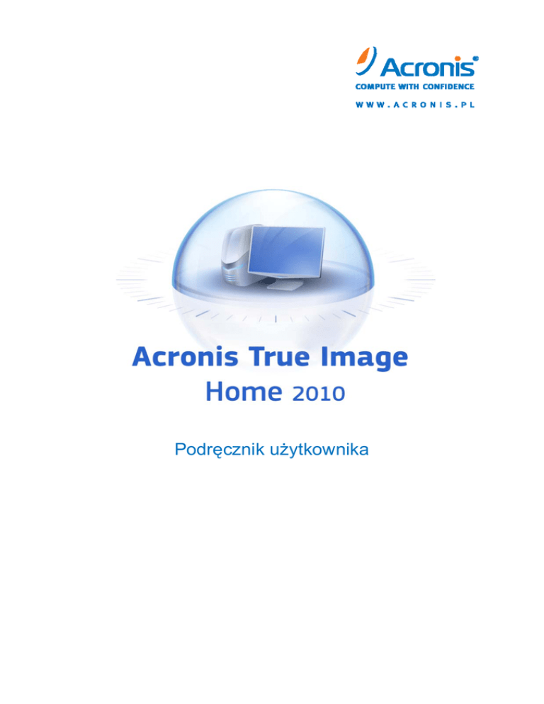 Podręcznik użytkownika Copyright © Acronis, Inc., 2000–2010. Wszelkie prawa zastrzeżone. „Acronis” i „Acronis Secure Zone” są zastrzeżonymi znakami towarowymi firmy Acronis, Inc. „Acronis Compute with Confidence”, „Acronis Startup Recovery Manager”, „Acronis Active Restore” i logo Acronis są znakami towarowymi firmy Acronis, Inc. Linux jest zastrzeżonym znakiem towarowym Linusa Torvaldsa. Windows i MS‐DOS są zastrzeżonymi znakami towarowymi firmy Microsoft Corporation. Wszystkie inne wzmiankowane znaki towarowe i prawa autorskie stanowią własność odpowiednich podmiotów. Zabrania się rozpowszechniania wszelkich wersji niniejszego dokumentu zawierających istotne zmiany bez wyraźnej zgody właściciela praw autorskich. Zabrania się komercyjnego rozpowszechniania niniejszego dokumentu lub jego dzieł pochodnych w postaci zwykłej (papierowej) publikacji książkowej bez wcześniejszego uzyskania zgody właściciela praw autorskich. DOKUMENTACJA JEST DOSTARCZANA W SWOJEJ AKTUALNEJ POSTACI I WYŁĄCZA SIĘ WSZELKIE WYRAŹNE LUB DOROZUMIANE WARUNKI, OŚWIADCZENIA I GWARANCJE, W TYM WSZELKIE GWARANCJE POKUPNOŚCI, PRZYDATNOŚCI DO OKREŚLONEGO CELU ORAZ NIENARUSZENIA PRAW OSÓB TRZECICH, Z ZASTRZEŻENIEM WYŁĄCZEŃ UZNANYCH ZA PRAWNIE NIEWAŻNE. Spis treści 1. Wstęp ....................................................................................................................... 9 1.1. Co to jest Acronis® True Image Home? ............................................................................... 9 1.2. Podstawowe pojęcia dotyczące programu Acronis True Image Home ............................ 10 1.3. Co nowego w programie Acronis True Image Home 2010 ............................................... 12 1.4. Wymagania systemowe i obsługiwane nośniki ................................................................. 14 Minimalne wymagania systemowe ....................................................................................................... 14 Obsługiwane systemy operacyjne ......................................................................................................... 14 Obsługiwane systemy plików ................................................................................................................ 14 Obsługiwane nośniki .............................................................................................................................. 15 Pomoc techniczna dla klientów ........................................................................................ 15 1.4.1. 1.4.2. 1.4.3. 1.4.4. 1.5. 2. Instalowanie i uruchamianie programu Acronis True Image Home .......................... 16 2.1. Instalowanie programu Acronis True Image Home .......................................................... 16 2.2. Wyodrębnianie programu Acronis True Image Home ...................................................... 17 2.3. Uruchamianie programu Acronis True Image Home ........................................................ 17 2.4. Uaktualnianie programu Acronis True Image Home ........................................................ 17 2.5. Usuwanie programu Acronis True Image Home ............................................................... 18 Informacje ogólne i zastrzeżone technologie firmy Acronis ..................................... 19 3. 3.1. Różnice pomiędzy obrazami plików a obrazami dysku/partycji ....................................... 19 3.2. Pełne, przyrostowe i różnicowe kopie zapasowe ............................................................. 19 3.3. Konwencje nazw plików kopii zapasowej ......................................................................... 20 3.4. Acronis Secure Zone™ ....................................................................................................... 22 3.5. Acronis Startup Recovery Manager .................................................................................. 23 3.5.1. Sposób działania: .................................................................................................................................... 23 3.5.2. Sposób użytkowania .............................................................................................................................. 23 3.6. Przeglądanie informacji o dysku i partycjach .................................................................... 24 3.7. Co to jest Try&Decide™? ................................................................................................... 24 3.8. Acronis DriveCleanser, File Shredder i Czyszczenie systemu ............................................ 25 3.9. Obsługa formatu zip .......................................................................................................... 25 3.10. Ciągła kopia zapasowa Acronis ......................................................................................... 26 3.11. Uruchamianie z plików tib obrazu systemu ...................................................................... 26 3.12. Acronis Universal Restore ................................................................................................. 26 Przeznaczenie funkcji Acronis Universal Restore .................................................................................. 26 Ogólne zasady dotyczące funkcji Acronis Universal Restore ................................................................ 27 3.12.1. 3.12.2. Przygotowania do odzyskiwania po awarii .............................................................. 28 4. 4.1. 4.1.1. 4.1.2. Jak najlepiej przygotować się do awarii ............................................................................ 28 Zalecenia dotyczące testowania kopii zapasowych pod kątem możliwości użycia ich do odzyskiwania ................................................................................................................................................................ 