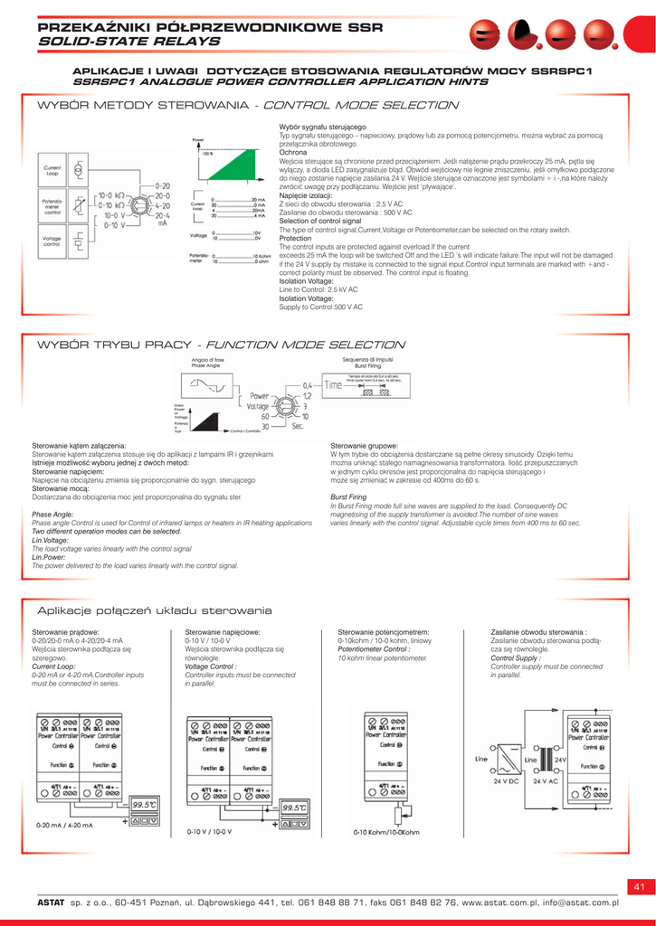 PRZEKAŹNIKI PÓŁPRZEWODNIKOWE SSR SOLID-STATE RELAYS APLIKACJE I UWAGI DOTYCZĄCE STOSOWANIA REGULATORÓW MOCY SSRSPC1 SSRSPC1 ANALOGUE POWER CONTROLLER APPLICATION HINTS WYBÓR METODY STEROWANIA - CONTROL MODE SELECTION Wybór sygnału sterującego Typ sygnału sterującego – napieciowy, prądowy lub za pomocą potencjometru, można wybrać za pomocą przełącznika obrotowego. Ochrona Wejścia sterujące są chronione przed przeciążeniem. Jeśli natężenie prądu przekroczy 25 mA, pętla się wyłączy, a dioda LED zasygnalizuje błąd. Obwód wejściowy nie legnie zniszczeniu, jeśli omyłkowo podączone do niego zostanie napięcie zasilania 24 V. Wejście sterujące oznaczone jest symbolami + i -,na które należy zwrócić uwagę przy podłączaniu. Wejście jest ‘pływające’. Napięcie izolacji: Z sieci do obwodu sterowania : 2,5 V AC Zasilanie do obwodu sterowania : 500 V AC Selection of control signal The type of control signal,Current,Voltage or Potentiometer,can be selected on the rotary switch. Protection The control inputs are protected against overload.If the current exceeds 25 mA the loop will be switched Off and the LED ’s will indicate failure.The input will not be damaged if the 24 V supply by mistake is connected to the signal input.Control input terminals are marked with +and correct polarity must be observed. The control input is floating. Isolation Voltage: Line to Control: 2.5 kV AC Isolation Voltage: Supply to Control:500 V AC WYBÓR TRYBU PRACY - FUNCTION MODE SELECTION Sterowanie kątem załączenia: Sterowanie kątem załączenia stosuje się do aplikacji z lampami IR i grzejnikami Istnieje możliwość wyboru jednej z dwóch metod: Sterowanie napięciem: Napięcie na obciążeniu zmienia się proporcjonalnie do sygn. sterującego Sterowanie mocą: Dostarczana do obciążenia moc jest proporcjonalna do sygnału ster. Phase Angle: Phase angle Control is used for Control of infrared lamps or heaters in IR heating applications Two different operation modes can be selected. Lin.Voltage: The load voltage varies linearly with the control signal Lin.Power: The power delivered to the load varies linearly with the control signal. Sterowanie grupowe: W tym trybie do obciążenia dostarczane są pełne okresy sinusoidy. Dzięki temu można uniknąć stałego namagnesowania transformatora. Ilość przepuszczanych w jednym cyklu okresów jest proporcjonalna do napięcia sterującego i może się zmieniać w zakresie od 400ms do 60 s. Burst Firing In Burst Firing mode full sine waves are supplied to the load. Consequently DC magnetising of the supply transformer is avoided.The number of sine waves varies linearly with the control signal. Adjustable cycle times from 400 ms to 60 sec. Aplikacje połączeń układu sterowania Sterowanie prądowe: 0-20/20-0 mA o 4-20/20-4 mA Wejścia sterownika podłącza się szeregowo. Current Loop: 0-20 mA or 4-20 mA.Controller inputs must be connected in series. Sterowanie napięciowe: 0-10 V / 10-0 V Wejścia sterownika podłącza się równolegle. Voltage Control : Controller inputs must be connected in parallel. Sterowanie potencjometrem: 0-10kohm / 10-0 kohm, liniowy Potentiometer Control : 10 kohm linear potentiometer. Zasilanie obwodu sterowania : Zasilanie obwodu sterowania podłącza się równolegle. Control Supply : Controller supply must be connected in parallel. 41 ASTAT sp. z o.o., 60-451 Poznań, ul. Dąbrowskiego 441, tel. 061 848 88 71, faks 061 848 82 76, www.astat.com.pl, [email protected] PRZEKAŹNIKI PÓŁPRZEWODNIKOWE SSR SOLID-STATE RELAYS Pojedyncza faza 230/400V AC Single Phase 230 /400 V AC Typowa aplikacja do sterowania grupowego grzejników zasilanych napięciem 230V AC lub 400V AC Phase Angle and Burst Firing applications 230 400 V Heaters. Trójfazowy z zerem Three Phase with Neutral Three Do aplikacji ze sterowaniem kątem załączenia i grupowanym. Phase Angle and Burst Firing application. Trójfazowy bez zera (ekonomiczny) Three Phase without Neutral Economy Z jednofazowym stycznikiem SSRSC1-30480C / SSRSC1- 50480C podrzędnym (Slave). Tylko sterowanie grupowe. With single pole contactor SSRSC1-30480C o SSRSC1- 50480C as slave. Only Burst Firing applications. SSRSPC1-30240AD =6,9 kW SSRSPC1-30480AD=12 kW Max SSRSPC1-50240AD =11,5 kW SSRSPC1-50480AD=20 kW Max 3xSSRSPC1-30240AD =20,7 kW Max 3xSSRSPC1-50240AD =30,5 kW Max SSRSPC1-30480AD+SSRSC1-30480C = 20,7 kW SSRSPC1-50480AD+SSRSC1-50480C = 34,5 kW WSKAZÓWKI ODNOŚNIE APLIKACJI Z TRANSFORMATOREM - TRANSFORMER APPLICATIONS HINTS Obciążenie transformatorem Moduł SSRSPC1 umożliwia stosowanie transformatora jako obciążenia – niskonapięciowe obciążenia mogą być sterowane przez transformator separujący, unikając zwarć i efektów magnetycnych DC w transformatorze. Transformator jest obwodem magnetycznym i w stanie wyłączenia ( H=0 ) indukcja ( B ) pozostaje niezerowa, z powodu zjawiska remanencji występującego w materiałach używanych do konstrukcji rdzenia nowoczesnych transformatorów. Podczas załączenia, gdy indukcja remanencji jest nieznana, SSRSPC1 wykonuje miękki start, dzięki czemu unika się impulsowych wysokich prądów występujących przy przemagnesowaniu rdzenia. Polaryzacja w chwili wyłączenia jest zapamiętywana, dzięki czemu ponowne załączenie następuje przy odwróconej polaryzacji, co pozwala uniknąć skokowych zmian natężenia prądu. Składowa stała eliminowana jest dzięki pracy w pełnym cyklu. Transformer Loads SSRSPC1 load driving capability includes transformer applications which means that low voltage loads can be controlled via an isolation transformer without any surge or DC magnetising of the transformer. Switching Transformers The problem in transformer switching is the magnetic circuit.When the transformer is switched Off,(H=O)the field (B)remains on a high level due to the high remanence of modern transformer core material. At initial turn-On where the remanence is unknown the SSRSPC1 will s