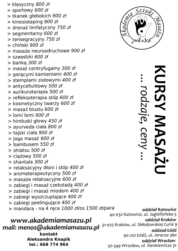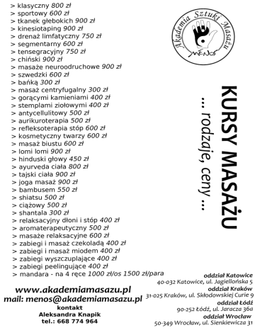 Ma Akademi > klasyczny 800 zł > sportowy 600 zł Sztuki a > tkanek głebokich 900 zł > kinesiotaping 900 zł > drenaż limfatyczny 750 zł > segmentarny 600 zł > tensegracyjny 750 zł > chiński 900 zł > masaże neuroodruchowe 900 zł > szwedzki 600 zł > bańką 300 zł > masaż centryfugalny 300 zł > gorącymi kamieniami 400 zł > stemplami ziołowymi 400 zł > antycellulitowy 500 zł > aurikuroterapia 500 zł > refleksoterapia stóp 600 zł > kosmetyczny twarzy 600 zł > masaż biustu 600 zł > lomi lomi 900 zł > hinduski głowy 450 zł > ayurveda ciała 800 zł > tajski ciała 900 zł > joga masaż 900 zł > bambusem 550 zł > shiatsu 500 zł > ciążowy 500 zł > shantala 300 zł > relaksacyjny dłoni i stóp 400 zł > aromaterapeutyczny 500 zł > masaże relaksacyjne 600 zł > zabiegi i masaż czekoladą 400 zł > zabiegi i masaż miodem 400 zł > zabiegi wyszczuplające 400 zł > zabiegi peelingujące 400 zł > mandara - na 4 ręce 1000 zł/os 1500 zł/para oddział Katowice 40‐032 Katowice, ul. Jagiellońska 5 oddział Kraków www.akademiamasazu.pl 31‐025 Kraków, ul. Skłodowsk iej Curie 9 mail: [email protected] oddział Łódź kontakt 90‐252 Łódź, ul. Jaracza 36a Aleksandra Knapik oddział Wrocław tel.: 668 774 964 50‐349 Wrocław, ul. Sienkiewicza 31 sażu KURSY MASAŻU ... rodzaje, ceny ...