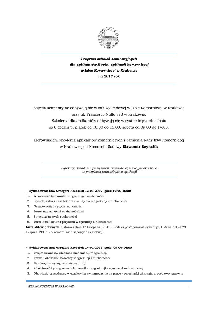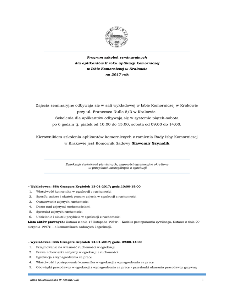 Program szkoleń seminaryjnych dla aplikantów II roku aplikacji komorniczej w Izbie Komorniczej w Krakowie na 2017 rok Zajęcia seminaryjne odbywają się w sali wykładowej w Izbie Komorniczej w Krakowie przy ul. Francesco Nullo 8/3 w Krakowie. Szkolenia dla aplikantów odbywają się w systemie piątek-sobota po 6 godzin tj. piątek od 10:00 do 15:00, sobota od 09:00 do 14:00. Kierownikiem szkolenia aplikantów komorniczych z ramienia Rady Izby Komorniczej w Krakowie jest Komornik Sądowy Sławomir Szynalik Egzekucja świadczeń pieniężnych, czynności egzekucyjne określone w przepisach szczególnych o egzekucji – Wykładowca: SSA Grzegorz Krężołek 13-01-2017; godz.10:00-15:00 1. Właściwość komornika w egzekucji z ruchomości 2. Sposób, zakres i skutek prawny zajęcia w egzekucji z ruchomości 3. Oszacowanie zajętych ruchomości 4. Dozór nad zajętymi ruchomościami 5. Sprzedaż zajętych ruchomości 6. Udzielanie i skutek przybicia w egzekucji z ruchomości Lista aktów prawnych: Ustawa z dnia 17 listopada 1964r. - Kodeks postępowania cywilnego, Ustawa z dnia 29 sierpnia 1997r. - o komornikach sądowych i egzekucji. – Wykładowca: SSA Grzegorz Krężołek 14-01-2017; godz. 09:00-14:00 1. Przejmowanie na własność ruchomości w egzekucji 2. Prawa i obowiązki nabywcy w egzekucji z ruchomości 3. Egzekucja z wynagrodzenia za pracę 4. Właściwość i postępowanie komornika w egzekucji z wynagrodzenia za pracę 5. Obowiązki pracodawcy w egzekucji z wynagrodzenia za pracę - przesłanki ukarania pracodawcy grzywną IZBA KOMORNICZA W KRAKOWIE 1 6. Postępowanie komornika w egzekucji z rachunku bankowego Lista aktów prawnych: Ustawa z dnia 17 listopada 1964r. - Kodeks postępowania cywilnego, Ustawa z dnia 29 sierpnia 1997r. - o komornikach sądowych i egzekucji. – Wykładowca: SSA Grzegorz Krężołek 24-02-2017; godz.10:00-15:00 1. Zakres i skutki zajęcia rachunku bankowego 2. Obowiązki banku w egzekucji z rachunku bankowego i odpowiedzialność banku za naruszenie obowiązków w egzekucji z rachunku bankowego 3. Właściwość i postępowanie komornika w egzekucji z innych wierzytelności 4. Zajęcie wierzytelności związanej z posiadaniem dokumentu 5. Zaspokajanie wierzyciela z zajętej wierzytelności Lista aktów prawnych: Ustawa z dnia 17 listopada 1964r. - Kodeks postępowania cywilnego, Ustawa z dnia 29 sierpnia 1997r. - o komornikach sądowych i egzekucji. – Wykładowca: SSA Grzegorz Krężołek 25-02-2017; godz. 09:00-14:00 1. Postępowanie komornika w egzekucji z innych praw majątkowych 2. Zaspokajanie wierzyciela z zajętego prawa w egzekucji z innych praw majątkowych 3. Postępowanie komornika w egzekucji z papierów wartościowych dopuszczonych do publicznego obrotu 4. Wyjawienie majątku 5. Właściwość komornika w egzekucji z nieruchomości Lista aktów prawnych: Ustawa z dnia 17 listopada 1964r. - Kodeks postępowania cywilnego, Ustawa z dnia 29 sierpnia 1997r. - o komornikach sądowych i egzekucji. – Wykładowca: SSA Grzegorz Krężołek 03-03-2017; godz.10:00-15:00 1. Uczestnicy postępowania w egzekucji z nieruchomości 2. Zajęcie nieruchomości i skutek rozporządzenia nieruchomością po jej zajęciu 3. Zarząd zajętej ruchomości 4. Opis i oszacowanie nieruchomości 5. Obwieszczenie o licytacji nieruchomości i warunki licytacyjne w egzekucji z nieruchomości Lista aktów prawnych: Ustawa z dnia 17 listopada 1964r. - Kodeks postępowania cywilnego, Ustawa z dnia 29 sierpnia 1997r. - o komornikach sądowych i egzekucji. – Wykładowca: SSA Grzegorz Krężołek 04-03-2017; godz.09:00-14:00 1. Licytacja nieruchomości 2. Przybicie w egzekucji z nieruchomości 3. Przysądzenie własności w egzekucji z nieruchomości 4. Egzekucja z ułamkowej części nieruchomości oraz użytkowania wieczystego 5. Uproszczona egzekucja z nieruchomości Lista aktów prawnych: Ustawa z dnia 17 listopada 1964r. - Kodeks postępowania cywilnego, Ustawa z dnia 29 sierpnia 1997r. - o komornikach sądowych i egzekucji. – Wykładowca: SSA Grzegorz Krężołek 28-04-2017; godz. 10:00-15:00 1. Podział sumy uzyskanej z egzekucji 2. Egzekucja obowiązku opróżnienia lokalu mieszkalnego 3. Egzekucja z udziałem Skarbu Państwa IZBA KOMORNICZA W KRAKOWIE 2 4. Egzekucja przez zarząd przymusowy Lista aktów prawnych: Ustawa z dnia 17 listopada 1964r. - Kodeks postępowania cywilnego, Ustawa z dnia 29 sierpnia 1997r. - o komornikach sądowych i egzekucji. – Wykładowca: SSA Grzegorz Krężołek 29-04-2017; godz. 09:00-14:00 1. Egzekucja przez sprzedaż przedsiębiorstwa 2. Egzekucja przez sprzedaż gospodarstwa rolnego 3. Egzekucja świadczeń alimentacyjnych 4. Egzekucja należności sądowych Lista aktów prawnych: Ustawa z dnia 17 listopada 1964r. - Kodeks postępowania cywilnego, Ustawa z dnia 29 sierpnia 1997r. - o komornikach sądowych i egzekucji. Wybrane elementy prawa gospodarczego i prawa spółek handlowych – Wykładowca: SSA Grzegorz Krężołek 12-05-2017; godz.10:00-15:00 1. Spółki osobowe (spółka jawna, partnerska, komandytowa, komandytowo-akcyjna) 2. Rozwiązanie spółek osobowych Lista aktów prawnych: Ustawa z dnia 15 września 2000r. - Kodeks spółek handlowych – Wykładowca: SSA Grzegorz Krężołek 13-05-2017; godz. 09:00-14:00 1. Spółki kapitałowe (spółka z ograniczoną odpowiedzialnością, akcyjna) 2. Rozwiązanie i likwidacja spółek kapitałowych 3. Odpowiedzialność cywilnoprawna spółek i wspólników 4. Łączenie, podział i przekształcenie spółek 5. Lista aktów prawnych: Ustawa z dnia 15 września 2000r. - Kodeks spółek handlowych – Wykładowca: SSA Grzegorz Krężołek 23-06-2017; godz.10:00-15:00 1. Postępowanie w przedmiocie ogłoszenia upadłości 2. Skutki ogłoszenia upadłości: co do osoby upadłego, co do majątku upadłego, co do zobowiązań upadłego, co do spadków nabytych przez upadłego 3. Wpływ ogłoszenia upadłości na stosunki majątkowe małżeńskie 4. Wpływ ogłoszenia upad