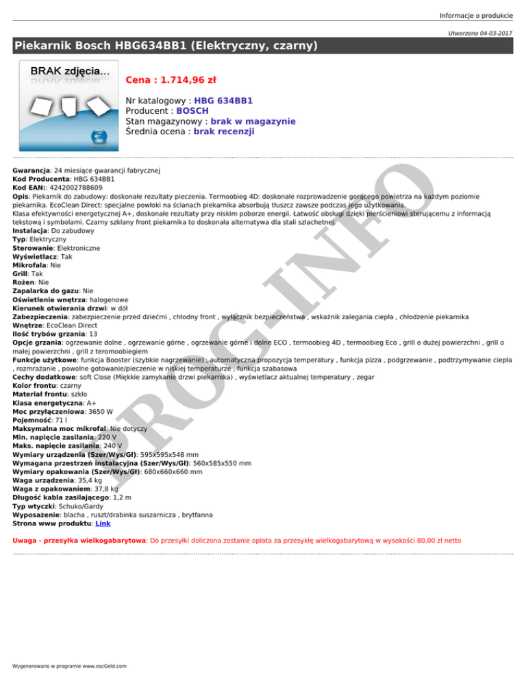 Informacje o produkcie Utworzono 04-03-2017 Piekarnik Bosch HBG634BB1 (Elektryczny, czarny) Cena : 1.714,96 zł Nr katalogowy : HBG 634BB1 Producent : BOSCH Stan magazynowy : brak w magazynie Średnia ocena : brak recenzji PR O G -I N FO Gwarancja: 24 miesiące gwarancji fabrycznej Kod Producenta: HBG 634BB1 Kod EAN:: 4242002788609 Opis: Piekarnik do zabudowy: doskonałe rezultaty pieczenia. Termoobieg 4D: doskonałe rozprowadzenie gorącego powietrza na każdym poziomie piekarnika. EcoClean Direct: specjalne powłoki na ścianach piekarnika absorbują tłuszcz zawsze podczas jego użytkowania. Klasa efektywności energetycznej A+, doskonałe rezultaty przy niskim poborze energii. Łatwość obsługi dzięki pierścieniowi sterującemu z informacją tekstową i symbolami. Czarny szklany front piekarnika to doskonała alternatywa dla stali szlachetnej. Instalacja: Do zabudowy Typ: Elektryczny Sterowanie: Elektroniczne Wyświetlacz: Tak Mikrofala: Nie Grill: Tak Rożen: Nie Zapalarka do gazu: Nie Oświetlenie wnętrza: halogenowe Kierunek otwierania drzwi: w dół Zabezpieczenia: zabezpieczenie przed dziećmi , chłodny front , wyłącznik bezpieczeństwa , wskaźnik zalegania ciepła , chłodzenie piekarnika Wnętrze: EcoClean Direct Ilość trybów grzania: 13 Opcje grzania: ogrzewanie dolne , ogrzewanie górne , ogrzewanie górne i dolne ECO , termoobieg 4D , termoobieg Eco , grill o dużej powierzchni , grill o małej powierzchni , grill z teromoobiegiem Funkcje użytkowe: funkcja Booster (szybkie nagrzewanie) , automatyczna propozycja temperatury , funkcja pizza , podgrzewanie , podtrzymywanie ciepła , rozmrażanie , powolne gotowanie/pieczenie w niskiej temperaturze , funkcja szabasowa Cechy dodatkowe: soft Close (Miękkie zamykanie drzwi piekarnika) , wyświetlacz aktualnej temperatury , zegar Kolor frontu: czarny Materiał frontu: szkło Klasa energetyczna: A+ Moc przyłączeniowa: 3650 W Pojemność: 71 l Maksymalna moc mikrofal: Nie dotyczy Min. napięcie zasilania: 220 V Maks. napięcie zasilania: 240 V Wymiary urządzenia (Szer/Wys/Gł): 595x595x548 mm Wymagana przestrzeń instalacyjna (Szer/Wys/Gł): 560x585x550 mm Wymiary opakowania (Szer/Wys/Gł): 680x660x660 mm Waga urządzenia: 35,4 kg Waga z opakowaniem: 37,8 kg Długość kabla zasilającego: 1,2 m Typ wtyczki: Schuko/Gardy Wyposażenie: blacha , ruszt/drabinka suszarnicza , brytfanna Strona www produktu: Link Uwaga - przesyłka wielkogabarytowa: Do przesyłki doliczona zostanie opłata za przesykłę wielkogabarytową w wysokości 80,00 zł netto Wygenerowano w programie www.oscGold.com