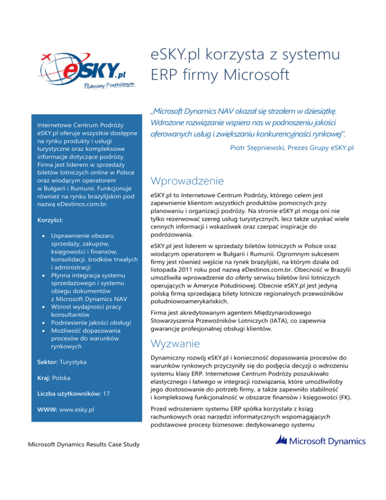 eSKY.pl korzysta z systemu ERP firmy Microsoft Internetowe Centrum Podróży eSKY.pl oferuje wszystkie dostępne na rynku produkty i usługi turystyczne oraz kompleksowe informacje dotyczące podróży. Firma jest liderem w sprzedaży biletów lotniczych online w Polsce oraz wiodącym operatorem w Bułgarii i Rumunii. Funkcjonuje również na rynku brazylijskim pod nazwą eDestinos.com.br. Korzyści: Usprawnienie obszaru sprzedaży, zakupów, księgowości i finansów, konsolidacji, środków trwałych i administracji Płynna integracja systemu sprzedażowego i systemu obiegu dokumentów z Microsoft Dynamics NAV Wzrost wydajności pracy konsultantów Podniesienie jakości obsługi Możliwość dopasowania procesów do warunków rynkowych Sektor: Turystyka Kraj: Polska Liczba użytkowników: 17 WWW: www.esky.pl Microsoft Dynamics Results Case Study „Microsoft Dynamics NAV okazał się strzałem w dziesiątkę. Wdrożone rozwiązanie wspiera nas w podnoszeniu jakości oferowanych usług i zwiększaniu konkurencyjności rynkowej”. Piotr Stępniewski, Prezes Grupy eSKY.pl Wprowadzenie eSKY.pl to Internetowe Centrum Podróży, którego celem jest zapewnienie klientom wszystkich produktów pomocnych przy planowaniu i organizacji podróży. Na stronie eSKY.pl mogą oni nie tylko rezerwować szereg usług turystycznych, lecz także uzyskać wiele cennych informacji i wskazówek oraz czerpać inspiracje do podróżowania. eSKY.pl jest liderem w sprzedaży biletów lotniczych w Polsce oraz wiodącym operatorem w Bułgarii i Rumunii. Ogromnym sukcesem firmy jest również wejście na rynek brazylijski, na którym działa od listopada 2011 roku pod nazwą eDestinos.com.br. Obecność w Brazylii umożliwiła wprowadzenie do oferty serwisu biletów linii lotniczych operujących w Ameryce Południowej. Obecnie eSKY.pl jest jedyną polską firmą sprzedającą bilety lotnicze regionalnych przewoźników południowoamerykańskich. Firma jest akredytowanym agentem Międzynarodowego Stowarzyszenia Przewoźników Lotniczych (IATA), co zapewnia gwarancję profesjonalnej obsługi klientów. Wyzwanie Dynamiczny rozwój eSKY.pl i konieczność dopasowania procesów do warunków rynkowych przyczyniły się do podjęcia decyzji o wdrożeniu systemu klasy ERP. Internetowe Centrum Podróży poszukiwało elastycznego i łatwego w integracji rozwiązania, które umożliwiłoby jego dostosowanie do potrzeb firmy, a także zapewniło stabilność i kompleksową funkcjonalność w obszarze finansów i księgowości (FK). Przed wdrożeniem systemu ERP spółka korzystała z ksiąg rachunkowych oraz narzędzi informatycznych wspomagających podstawowe procesy biznesowe: dedykowanego systemu Piotr Stępniewski Prezes Grupy eSKY.pl „System Microsoft Dynamics NAV mile nas zaskoczył. Szczególnie pod kątem możliwości integracyjnych z naszymi innymi rozwiązaniami funkcjonującymi w firmie, które zaowocowały wieloma usprawnieniami w obszarze sprzedaży, finansów i księgowości”. sprzedażowego stworzonego na potrzeby spółki, zewnętrznego rozwiązania sprzedażowego uruchomionego w celu sprzedaży biletów PKP i obsługi sprzedaży realizowanej przez dział BTM (Business Travel Management), systemu zarządzania obiegiem dokumentów oraz rozwiązania finansowo-księgowego. W rezultacie eSKY.pl wybrało rozwiązanie Microsoft Dynamics NAV 2013 R2, które miało objąć obszar sprzedaży, zakupów, księgowości i finansów, konsolidacji, środków trwałych i administracji. Partnerem wdrożeniowym została firma JCommerce, od 2005 roku specjalizująca się w projektowaniu, doradztwie oraz wdrażaniu rozwiązań informatycznych, w tym aplikacji biznesowych, takich jak systemy ERP, Business Intelligence i CRM. Prace implementacyjne trwały 10 miesięcy i zakończyły się w marcu 2015 roku. „Zależało nam przede wszystkim na uproszczeniu, ujednoliceniu i uporządkowaniu procesów biznesowych poprzez ich standaryzację i parametryzację, a także na integracji naszego systemu sprzedażowego i systemu obiegu dokumentów z rozwiązaniem Dynamics NAV. Chcieliśmy również wypracować standardy możliwe do zastosowania we wdrożeniach w naszych zagranicznych oddziałach” – komentuje Mirela Środowska, Project Manager, eSKY.pl. Wdrożenie Uwarunkowania i ograniczenia wdrożenia systemu ERP Wśród wyzwań, jakim musiało sprostać wdrożenie koncepcji działania nowego systemu, warto wymienić: limit w zakresie liczby wymaganych licencji dostępowych do systemu, zachowanie ciągłości pracy operacyjnej, zakres modyfikacji koniecznych do wykonania w systemie sprzedażowym oraz zachowanie jego kluczowych funkcjonalności. Istotne było także utrzymanie pełnej logiki biznesowej procesu realizacji sprzedaży i fakturowania w jednym systemie sprzedażowym oraz zachowanie w nim funkcjonalności niezbędnych do pełnej i prawidłowej obsługi tych procesów. W okresie przejściowym konieczne było również stworzenie możliwości bieżącej kontroli transakcji księgowanych w systemie finansowo-księgowym oraz minimalizacja ryzyka destabilizacji pracy działów operacyjnych podczas uruchamiania nowego rozwiązania. Głównym założeniem przyjętej koncepcji było wdrożenie nowego modelu integracji pomiędzy systemem sprzedażowym a nowym narzędziem ERP, w oparciu o bezpośrednią komunikację między tymi systemami z wykorzystaniem technologii webservices. „Łatwość integracji, elastyczność i możliwość dostosowania funkcjonalności do potrzeb firmy, a także stabilność i kompleksowa funkcjonalność w obszarze finansowo-księgowym to główne aspekty, które miały wpływ na wybór Microsoft Dynamics NAV – zintegrowanego rozwiązania klasy ERP” – komentuje Agnieszka Stępniewska, Główny Księgowy Grupy eSKY.pl. Na potrzeby wdrożenia zakupiono 17 licencji Full User CAL (Starter Pack + 14 dodatkowych użytkowników). Firma JCommerce zaimplementowała następujące funkcjonalności: Sprzedaż, 