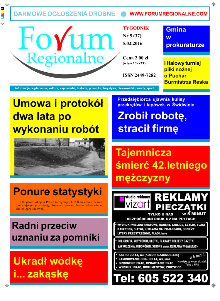 CMY K DARMOWE OG£OSZENIA DROBNE WWW.FORUMREGIONALNE.COM TYGODNIK Nr 5 (37) 5.02.2016 Cena 2.00 z³ (w tym 5 % VAT) ISSN 2449-7282 Gmina w prokuraturze I Halowy turniej pi³ki no¿nej o Puchar Burmistrza Reska informacje, wydarzenia, kultura, zapowiedzi, historia, polemika, turystyka, ciekawostki, porady, sport, Umowa i protokó³ dwa lata po wykonaniu robót Przedsiêbiorca ujawnia kulisy przekrêtów i ³apówek w Œwidwinie Zrobi³ robotê, straci³ firmê Tajemnicza œmieræ 42.letniego mê¿czyzny Ponure statystyki Oficjalnie policja w Polsce zatrzymuje ok. 200 nieletnich rocznie uprawiaj¹cych prostytucjê, g³ównie dziewcz¹t. Jest to jednak wierzcho³ek góry lodowej. Radni przeciw uznaniu za pomniki Ukrad³ wódkê i... zak¹skê Str 2 Forum Regionalne £OBEZ £OBEZ Podpisanie porozumienia dot. kontynuacji projektu ZEBRA 28 stycznia 2016 r. w siedzibie Starostwa Powiatowego w £obzie zawarto porozumienie pomiêdzy Powiatem £obeskim, a Centrum Integracji Spo³ecznej w £obzie dotycz¹ce II edycji projektu ZEBRA. W spotkaniu uczestniczyli Pawe³ Marek Starosta Powiatu £obeskiego, Jaros³aw ¯uk Cz³onek Zarz¹du Powiatu £obeskiego i £ukasz Wójcicki Dyrektor Centrum Integracji Spo³ecznej „Od Nowa”. Na terenie Powiatu £obeskiego znajduje siê 372 km dróg powiatowych. W ramach programu ZEBRA w 2015 roku wyciêto krzaki rosn¹ce przy drogach powiatowych nr 4316Z Be³czna – Klêpnica, 3136Z Modlimowo – Resko, 4337Z Mielno – Sielsko, 4305 Resko – Ostrzyca, 4314Z Resko – Wêgorzyno, 4303Z na odcinku Borkowo – Rogowo na ³¹cznej d³ugoœci 53 km. W roku 2016 planuje siê wycinkê krzaków rosn¹cych przy drogach powiatowych na d³ugoœci 132 km. Szczegó³owy harmonogram robót wykonywanych w ramach projektu ZEBRA znajduje siê na stronie internetowej Zarz¹du Dróg Powiatowych w £obzie pod adresem http://zdp.lobez.ibip./pl w zak³adce og³oszenia. SP £obez £OBEZ PO¯EGNANIE NACZELNIKA PREWENCJI W czwartek 28.01 po¿egnaliœmy Naczelnika Wydzia³u Prewencji i Ruchu Drogowego ³obeskiej komendy. Po 25 latach podinsp. Andrzej Sarnowski przeszed³ na zas³u¿on¹ emeryturê. Wszystkie te lata wypracowa³ w naszej komendzie. Komendant insp. Jacek Dobrek podziêkowa³ odchodz¹cemu Naczelnikowi za nienagann¹ s³u¿bê na rzecz bezpieczeñstwa i porz¹dku Nr 5 (37) 5.02.2016 Oni te¿ kochali dzieci Jeszcze tylko tydzieñ bêdzie otwarta wystawa „Wêdrówki archeologiczne po ziemi ³obeskiej” w gmachu Muzeum Narodowego przy ul. Starom³yñskiej w Szczecinie. Zestawiono j¹ z zabytków przechowywanych w MN, a przeniesionych do Szczecina z muzeum regionalnego w Resku. Systematyczne badania i gromadzenie zbioru zapocz¹tkowali jeszcze w XIX wieku pastor Stuetzner z Karwowa i kustosz muzeum miejskiego w Szczecinie Stubenrauch, a finalizowa³ tu¿ przed II wojn¹ wizytator szkolny Albert Rowe, tworz¹c muzeum w Resku. S¹ one podstaw¹ obecnych zbiorów szczeciñskich. Zabytki pochodz¹ a¿ z 42 miejscowoœci powiatu od Orzeszkowa po Ginawê, od ¯erzyna po Zagórzyce, od Dobrej po Grabowo i Starogard. S¹ to odkrycia z grodzisk, cmentarzysk i osad otwartych oraz przypadkowych znalezisk skarbów ukrytych w ziemi, g³ównie zawieraj¹cych monety. S¹ te¿ znaleziska powierzchniowe. Choæ jest to jedna sala wystawowa, a artefakty s¹ raczej niewielkie, ich wartoœæ archeologiczna jest ogromna. Mo¿e to dobrze, ¿e w oddziale przy ul. Starom³yñskiej jest remont, bo wystawione skarby pomorskie to creme de la creme zbiorów. S¹ tam br¹zowe i ¿elazne miecze, ozdoby kobiece, liczne toporki, naczynia gliniane, urny grobowe. Jest kubek dwa razy wypalony: jako naczynie sto³owe, a potem - gdy w³o¿ono go do r¹k na stosie ofiarnym i umieszczono w urnie z prochami. Teraz kubek odkszta³ci³ siê w wy¿szej temperaturze i przyj¹³ wykrzywiony owal. Ujmuj¹ wysokim kunsztem tzw. importy rzymskie. Jednak najbardziej wzrusza trójko³owy wózeczek-zabawka ozdobiony trzema glinianymi ptaszkami. Ktoœ w BrzeŸniaku 1000 lat p.n.e. bardzo kocha³ synka lub córeczkê, bo trudzi³ siê, by zobaczyæ uœmiech rozbawionego dziecka. Niestety tylko na fotografii zosta³o koœciane d³uto z najstarszej epoki kamienia (Po³chowo), ocala³a motyka z rogu (£obez). Wyj¹tkowo piêkny miecz z Wêgorzyna wypo¿yczy³o muzeum stargardzkie. A w innych czynnych salach – jedyne w swoim rodzaju imponuj¹ce drzewo genealogiczne ksi¹¿¹t pomorskich, ich stroje i bi¿uteria wydobyte z sarkofagów, meble i zastawy sto³owe, obrazy z portretem ksiêcia Filipa I pêdzla Lucasa Cranacha M³odszego, podwójny portret Sydonii, legendarny (a przecie¿ realny) pierœcieñ Borków, niedawno zakupiony do zbiorów. Ziemia ³obeska le¿y w œrodku Zachodniego Pomorza! Ludwik Cwynar publicznego. W imieniu swoim oraz wszystkich policjantów i pracowników policji ¿yczy³ zdrowia, pomyœlnoœci oraz spe³nienia wszystkich planów i zamierzeñ. Odchodz¹cy policjant otrzyma³ podziêkowania oraz drobny upominek. Miejsce odchodz¹cego Naczelnika zaj¹³ jego zastêpca nadkom. Jacek Kamiñski, którego zastêpowa³ bêdzie teraz asp. szt. Krzysztof ¯egota. KPP £obez „Forum Regionalne” REDAKCJA: 73-150 £obez ul. S³owackiego 6. Tel.: 91 577 43 28, REDAKTOR NACZELNY: Magdalena Mucha Tel.: 512 138 741, email: [email protected] WYDAWCA: Wydawnictwo Multimedia Magdalena Mucha. NIP: 881-136-75-37, Konto: Idea Bank S.A. 93 1950 0001 2006 4177 0973 0001 REKLAMA: Tel.: 516 318 626, email: [email protected] Redakcja ma prawo do skracania i adiustacji nadsy³anych materia³ów, materia³ów niezamawianych nie zwracamy. Redakcja nie odpowiada za treœæ reklam, og³oszeñ i og³oszeñ drobnych. Forum Regionalne Nr 5 (37) 5.02.2016 Z POLICJI Str 3 Z POLICJI Tajemnicza œmieræ 42.letniego mê¿czyzny 3 stycznia do jednego z mieszkañców £obza przyszed³ s¹siad mieszkaj¹cy w tym samym budynku. W³aœciciel mieszkania na chwilê opuœci³ lokal. Gdy wróci³, jego goœæ siedzia³ w fotelu, jednak ju¿ nie ¿y³