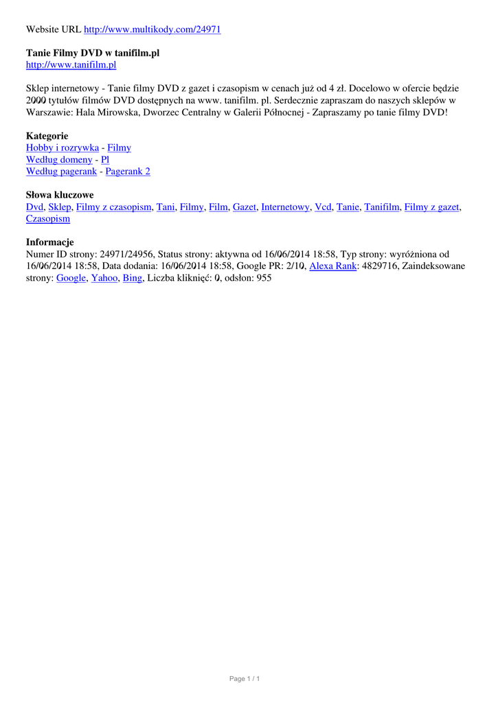 Website URL http://www.multikody.com/24971 Tanie Filmy DVD w tanifilm.pl http://www.tanifilm.pl Sklep internetowy - Tanie filmy DVD z gazet i czasopism w cenach już od 4 zł. Docelowo w ofercie będzie 2000 tytułów filmów DVD dostępnych na www. tanifilm. pl. Serdecznie zapraszam do naszych sklepów w Warszawie: Hala Mirowska, Dworzec Centralny w Galerii Północnej - Zapraszamy po tanie filmy DVD! Kategorie Hobby i rozrywka - Filmy Według domeny - Pl Według pagerank - Pagerank 2 Słowa kluczowe Dvd, Sklep, Filmy z czasopism, Tani, Filmy, Film, Gazet, Internetowy, Vcd, Tanie, Tanifilm, Filmy z gazet, Czasopism Informacje Numer ID strony: 24971/24956, Status strony: aktywna od 16/06/2014 18:58, Typ strony: wyróżniona od 16/06/2014 18:58, Data dodania: 16/06/2014 18:58, Google PR: 2/10, Alexa Rank: 4829716, Zaindeksowane strony: Google, Yahoo, Bing, Liczba kliknięć: 0, odsłon: 955 Page 1 / 1
