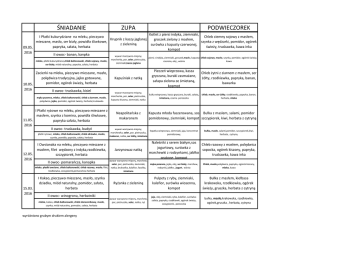 ŚNIADANIE ZUPA PODWIECZOREK Kotlet z piersi indyka, ziemniaki, I Płatki kukurydziane na mleku, pieczywo Chleb ciemny sojowy z masłem, Krupnik z kaszy jaglanej groszek zielony z masłem, mieszane, masło, ser biały, powidła śliwkowe, szynka z wędzarki, pomidor, ogórek z zieleniną surówka z kapusty czerwonej, papryka, sałata, herbata świeży, truskawka, kawa inka 09.05. kompot 2016 II owoc- banan, kanpka wywar marzywno-mięsny, mleko, płatki kukurydziane,chleb baltonowski, chleb sojowy, masło, ser biały, miód naturalny, papryka, sałata, herbata Zacierki na mleku, pieczywo mieszane, masło, polędwica tradycyjna, jajko gotowane, pomidor, ogórek świeży, herbata 10.05. 2016 II owoc- truskawka, kisiel mąka pszenna, mleko, chleb baltonowski, chleb z ziarnem, masło, polędwica, jajko, pomidor, ogórek świeży, herbata,truskawka I Płatki ryżowe na mleku, pieczywo mieszane z masłem, szynka z komina, powidła śliwkowe, 11.05. papryka sałata, herbata 2016 II owoc- truskawka, budyń płatki ryżowe, mleko, chleb baltonowski, chleb zdrówko, masło, szynka, powidła, papryka, sałata, herbata 12.05. 2016 15.03. 2016 I Owsianaka na mleku, pieczywo mieszane z masłem, filet wędzony z indyka,rzodkiewka, szczypiorek, herbata marcherka, por, seler, pietruszka, ziemniaki,kasza jaglana Kapuśniak z natką Pieczeń wieprzowa, kasza gryczana, buraki zasmażane, sałapa zielona ze śmietaną, kopmot Chleb żytni z ziarnem z masłem, ser żółty, rzodkiewka, papryka, banan, bawarka wywar marzywno-mięsny, marcherka, por, seler, pietruszka, kapusta kiszona, ziemniaki, natka kulka wieprzowa, kasza gryczana, buraki, sałata, śmietana, czarna porzeczka chleb, masło, ser żółty, rzodkiewka, papryka, banan, herbata, mleko Neapolitańska z makaronem wywar warzywno-mięsny, marchewka, seler, por, pietruszka, makaron, natka, ser żółty, śmietana Jarzynowaz natką wywar warzywno-mięsny, marchew, seler, por, pietruszka, ziemniaki, mleko, pładki owsiane, chleb baltonowski, chleb razowy, masło, filet, natka, brukselka, kalafior, fasolka, rzodkiewka, szczypiorek,pomarańcza herbata śmietana II owoc- pomarańcza, kanapka I Kakao, pieczywo mieszane, masło, szynka dziadka, miód naturalny, pomidor, sałata, herbata II owoc- winogrona, herbatniki mleko, kakao, chleb baltonowski, chleb słonecznikowy, masło, szynka, miód naturalny, pomodor, sałata, herbata wyróżniono grubym drukiem alergeny piersi z indyka, ziemniaki, groszek,masło, kapusta chleb sojowy, masło, szynka, pomidor, ogórek świeży, czerona, olej , wiśnia kawa Kapusta młoda faszerowana, sos Bułka z maslem, salami, pomidor pomidorowy, ziemniaki, kompot szczypiorek, kiwi, herbata z cytryną łopatka wieprzowa, ziemniaki, jaja, koncentrat pomidorowy, bułka, masło, salami,pomidor, szczypiorek,kiwi, herbata , cytryna, Naleśniki z serem białym,sos Chleb razowy z masłem, polędwica jogurtowy, surówka z sopocka, ogórek kiszony, papryka, marchewki z rodzynkami, jabłko truskawka, kawa inka prażone, kompot mąka pszenna, jajka, olej, ser biały, marchew, rodzynki, jabłko , jogurt, wiśnia Chleb, masło,polędwica, papryka, ogórek kiszony, mleko, kawa Ryżanka z zieleniną Pulpety z ryby, ziemniaki, kalafior, surówka wiosenna, kompot Bułka z masłem, kiełbasa krakowska, rzodkiewka, ogórek świeży, gruszka, herbata z cytryną wywar warzywno-mięsny, marchew, por, pietruszka, seler, natka, ryż jaja, olej, ziemniaki, ryba, kalafior, surówkasałata, papryka, rzodkiewki, ogórek świeży, szczypiorek , porzeczka bułka, masło,krakowska, rzodkiewka, ogórek,gruszka , herbata, cytryna