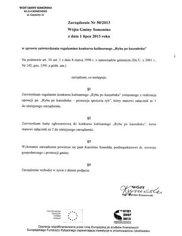 WÓJT GMINY SOMONINO 83·3\4 SOMONINO ul. Ccynowy 2\ Zarządzenie Nr 50/2013 Wójta Gminy Somo nino z dnia 1 lipca 2013 roku Na podstawie art. 30 ust. 1 z dnia 8 marca 1990 r. o samorządzie gminnym (Dz.U. z 2001 r., Nr 142, poz. 1591 z późń. zm.) Zatwierdzam regulamin konkursu kulinarnego "Ryba po kaszubsku" związanego z realizacją operacji pn. "Ryba po kaszubsku - promocja spożycia ryb", który stanowi załącznik nr l do niniejszego zarządzenia. Zatwierdzam kartę zgłoszeniową do konkursu kulinarnego "Ryba po kaszubsku", która stanowi załącznik nr 2 do niniejszego zarządzenia. Wykonanie zarządzenia powierza się pani Karolinie Szmołda, podinspektorowi ds. rozwoju gospodarczego i promocji gminy. Unia EuropeJska EuropeJski Fundusz Rybacki * *** * * * * *** * tJLpoRYBY ~2007 .2013 Operacja współfinansowana przez Unię Europejską ze środków finansowych Europejskiego Funduszu Rybackiego zapewniającą inwestycje w zrównoważone rybołówstwo Załącznik nr l do Zarządzenia Nr 50/2013 Wójta Gminy Somonino z dnia 01.07.2013 REGULAMIN KONKURSU KULINARNEGO "RYBA PO KASZUBSKU" 1. Organizatorem konkursu kułinarnego "Ryba po kaszubsku" jest Gmina Somonino, która realizuje operację pn. "Ryba po kaszubsku - promocja spożycia ryb", współfinansowaną z Europejskiego Funduszu Rybackiego. 2. Cele główne konkursu to: • zachowanie rybackiego charakteru obszaru LSROR Kaszuby, • kultywowanie tradycji rybaczenia na tym obszarze, • promocja spożycia ryb. 3. Konkurs adresowany jest do wszystkich mieszkańców obszaru LSROR Kaszuby, tj. m.in. do osób fizycznych, restauratorów, kół gospodyń wiejskich, gospodarstw agroturystycznych, organizacj i pozarządowych. 4. Do obszaru LSROR Kaszuby należą: Gminy Somonino, Gmina Kartuzy, Gmina Stężyca, Gmina Chmielno, Gmina Sulęczyno, Gmina Przodkowo, Gmina Sierakowice. 5. Każdy może dokonać tylko jednego zgłoszenia. Przed zgłoszeniem udziału w konkursie uczestnik powinien zapoznać się z regulaminem. Dokonanie zgłoszenia do konkursu będzie traktowane równoznacznie z zapoznaniem się z regulaminem oraz jego akceptacją. 6. Każdy uczestnik może wziąć udział w konkursie poprzez: • wypełnienie karty zgłoszeniowej, • dostarczenie przepisu na danie na bazie ryb żyjących w kaszubskich jeziorach w wersji elektronicznej i papierowej; • dostarczenie zdjęcia potrawy w wersji elektronicznej. 7. Każdy przepis musi zawierać: • nazwę potrawy, • zdjęcie potrawy, • opis sposobu wykonania, Dodatkowo, można załączyć opis tradycji, pochodzenia oraz historii potrawy. 8. Zgłoszenia do konkursu będą przyjmowane do 5 sierpnia 2013. Unia Europejska *** łfl PO RYBY E~~~~~~~ Rybacki ** : * *** * .C ,.. 2007 2013 Operacja współfinansowana przez Unię Europejską ze środków finansowych Europejskiego Funduszu Rybackiego zapewniającą inwestycje w zrównoważone rybołówstwo 9. W oceme przeplsow komisja będzie brała pod uwagę wygląd i sposób podania potrawy na podstawie dostarczonego zdjęcia, pomysłowość i kreatywność, a także realność wykonania. 10. Potrawy muszą być wykonane z ryb żyjących w akwenach wodnych znajdujących się na terenie Szwajcarii Kaszubskiej. 11. Kartę zgłoszeniową wraz z przepisem i zdjęciem w wersji elektronicznej można składać osobiście lub pocztą w siedzibie Urzędu Gminy Somonino, ul. Ceynowy 21, 83-314 Somonino w zaklejonej kopercie z dopiskiem: "Ryba po kaszubsku". 12. Ogłoszenie wyników, wręczenie dyplomów i nagród oraz wspólne zdjęcie odbędzie się 27 sierpnia o godz. 12.00. 13. Organizator przewiduje przyznanie nagród za I, II i III miejsce. Dodatkowo, wyłonione zostaną trzy wyróżnienia. 14. Ponadto naj ciekawsze przepisy będą zamieszone w książce kulinarnej, która zostanie wydana na zakończenie konkursu. 15. Organizator zastrzega sobie prawo do zmiany terminu rozstrzygnięcia konkursu bez podania powodu. 16. Osoba do kontaktów bezpośrednich z ramienia Organizatora: Karolina Szmolda, tel. 58 684 11 21. 17. Organizator konkursu zastrzega sobie prawo do publikacji danych osobowych uczestników konkursu, nazw zgłoszonych do konkursu potraw i przepisów oraz wykorzystywania zdjęć wykonywanych podczas konkursu, w tym zdjęć osób i potraw. Uma Europejska Europejski Fundusz Rybacki * *** * * * * *** * (IIIlPORYBY ~2007 .2013 Operacja współfinansowana przez Unię Europejską ze środków finansowych Europejskiego Funduszu Rybackiego zapewniającą inwestycje w zrównoważone rybołówstwo Załącznik nr 2 do Zarządzenia Nr 50/2013 Wójta Gminy Somonino z dnia 01.07.2013 KARTA ZGŁOSZENIA DO KONKURSU "RYBA PO KASZUBSKU" I l Imię i nazwisko/ Nazwa podmiotu zgłaszaj ącego 2 Adres zamieszkania/siedziby I l ~ II I I ~ I I 3 Numer tełefonu 4 Adres e-maił 5 Nazwa potrawy l I I I ~ I I I ! i I 6 II Krótka charakterystyka/uzasadnienie zgłoszenia ! I I l II I II I I I I 7 l I I j Zgłaszam chęć udziału w konkursie kulinarnym i "Ryba po kaszubsku" jednocześnie wyrażam zgodę na publikację moich danych osobowych, nazw zgłoszonych do konkursu potraw i przepisów oraz wykorzystywania zdjęć wykonywanych podczas konkursu, w tym zdjęć osób i potraw. ~ I I I I I I (data, podpis) UnIa Europejska Europejski Fundusz Rybacki * *** * * * * *** * ,.rPORYBY ~2007 .2013 Operacja współfinansowana przez Unię Europejską ze środków finansowych Europejskiego Funduszu Rybackiego zapewniającą inwestycje w zrównoważone rybołówstwo I