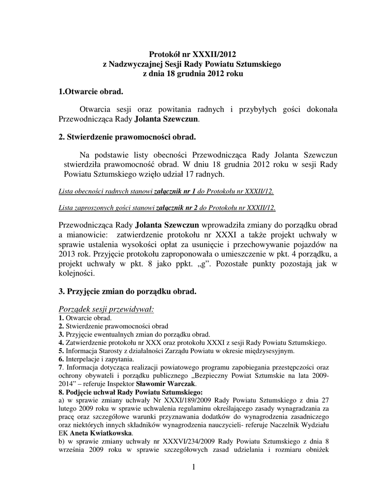 Protokół nr XXXII/2012 z Nadzwyczajnej Sesji Rady Powiatu Sztumskiego z dnia 18 grudnia 2012 roku 1.Otwarcie obrad. Otwarcia sesji oraz powitania radnych i przybyłych gości dokonała Przewodnicząca Rady Jolanta Szewczun. 2. Stwierdzenie prawomocności obrad. Na podstawie listy obecności Przewodnicząca Rady Jolanta Szewczun stwierdziła prawomocność obrad. W dniu 18 grudnia 2012 roku w sesji Rady Powiatu Sztumskiego wzięło udział 17 radnych. Lista obecności radnych stanowi załącznik nr 1 do Protokołu nr XXXII/12. Lista zaproszonych gości stanowi załącznik nr 2 do Protokołu nr XXXII/12. Przewodnicząca Rady Jolanta Szewczun wprowadziła zmiany do porządku obrad a mianowicie: zatwierdzenie protokołu nr XXXI a także projekt uchwały w sprawie ustalenia wysokości opłat za usunięcie i przechowywanie pojazdów na 2013 rok. Przyjęcie protokołu zaproponowała o umieszczenie w pkt. 4 porządku, a projekt uchwały w pkt. 8 jako ppkt. „g”. Pozostałe punkty pozostają jak w kolejności. 3. Przyjęcie zmian do porządku obrad. Porządek sesji przewidywał: 1. Otwarcie obrad. 2. Stwierdzenie prawomocności obrad 3. Przyjęcie ewentualnych zmian do porządku obrad. 4. Zatwierdzenie protokołu nr XXX oraz protokołu XXXI z sesji Rady Powiatu Sztumskiego. 5. Informacja Starosty z działalności Zarządu Powiatu w okresie międzysesyjnym. 6. Interpelacje i zapytania. 7. Informacja dotycząca realizacji powiatowego programu zapobiegania przestępczości oraz ochrony obywateli i porządku publicznego „Bezpieczny Powiat Sztumskie na lata 20092014” – referuje Inspektor Sławomir Warczak. 8. Podjęcie uchwał Rady Powiatu Sztumskiego: a) w sprawie zmiany uchwały Nr XXXI/189/2009 Rady Powiatu Sztumskiego z dnia 27 lutego 2009 roku w sprawie uchwalenia regulaminu określającego zasady wynagradzania za pracę oraz szczegółowe warunki przyznawania dodatków do wynagrodzenia zasadniczego oraz niektórych innych składników wynagrodzenia nauczycieli- referuje Naczelnik Wydziału EK Aneta Kwiatkowska. b) w sprawie zmiany uchwały nr XXXVI/234/2009 Rady Powiatu Sztumskiego z dnia 8 września 2009 roku w sprawie szczegółowych zasad udzielania i rozmiaru obniżek 1 tygodniowego obowiązkowego wymiaru godzin nauczycielom, którym powierzono stanowiska kierownicze w szkołach i placówkach oświatowych oraz szczegółowych zasad zwalniania od obowiązku realizacji tygodniowego obowiązkowego wymiaru godzin zajęć dydaktycznych, wychowawczych i opiekuńczych –referuje Naczelnik Wydziału EK Aneta Kwiatkowska. c) zmieniająca uchwałę nr XXXI/191/2012 z dnia 20 listopada 2012 roku w sprawie określenia zadań i zmiany w podziale wysokości środków Państwowego Funduszu Rehabilitacji Osób Niepełnosprawnych na poszczególne zadania w 2012 roku. –referuje Kierownik PCPR w Sztumie Ewelina Łęgowska. d) w sprawie wydatków budżetu powiatu, które w 2012 roku nie wygasają z upływem roku budżetowego – referuje Skarbnik Lucyna Bednarska. e) w sprawie zmiany Wieloletniej Prognozy Finansowej dla Powiatu Sztumskiego na lata 2012-2021 – referuje Skarbnik Lucyna Bednarska. f) w sprawie zmiany budżetu powiatu na 2012 rok – referuje Skarbnik Lucyna Bednarska. g) w sprawie ustalenia wysokości opłat za usunięcie i przechowywanie pojazdów na 2013r – referuje Naczelnik Wydziału KT Maciej Derbich. 9. Przedstawienie opinii Komisji Stałych Rady Powiatu w sprawie projektu uchwały dotyczącej przyjęcia Wieloletniej Prognozy Finansowej dla Powiatu Sztumskiego na lata 2013 – 2021 oraz projektu uchwały dotyczącej uchwalenia budżetu powiatu na 2013 rok.referują Przewodniczący Komisji Stałych. 10. Przedstawienie opinii Regionalnej Izby Obrachunkowej w sprawie uchwały o Wieloletniej Prognozy Finansowej Powiatu Sztumskiego na lata 2013-2021 oraz opinii o projekcie uchwały budżetowej Powiatu Sztumskiego na 2013 rok – referuje Skarbnik Lucyna Bednarska. 11. Podjęcie uchwał Rady Powiatu Sztumskiego: a) w sprawie przyjęcia Wieloletniej Prognozy Finansowej dla Powiatu Sztumskiego na lata 2013-2021 – referuje Skarbnik Lucyna Bednarska. b) w sprawie uchwalenia budżetu powiatu na 2013 rok – referuje Skarbnik Lucyna Bednarska. 12. Przedstawienie projektu planu pracy Rady Powiatu Sztumskiego na 2013 rok – referuje Przewodnicząca Rady Powiatu Jolanta Szewczun. 13. Odpowiedzi na interpelacje i zapytania 14. Wnioski i oświadczenia. 15. Sprawy różne. 16. Zakończenie obrad. Porządek stanowi załącznik nr 3 do Protokołu nr XXXII/12. Porządek sesji Rady Powiatu Sztumskiego wraz z wniesionymi zmianami radni zatwierdzili jednogłośnie. Przewodnicząca Rady Jolanta Szewczun poinformowała, że Stowarzyszenie Przyjaciół Rodzin Zastępczych „Lepszy Dom” z Dzierzgonia przygotowało na dzisiejszą sesję świąteczno-noworoczny program. Dodała, że Stowarzyszenie powstało niespełna dwa lata temu i specjalizuje się w opiece zstępczej. Stowarzyszenie w czasie swego działania realizuje wiele interesujących programów wspierających rodziny zastępcze. Następnie grupa 2 dzieci wyśpiewała kilka kolęd, natomiast grający na gitarze Damian Bujanowski wykonał kilka interesujących kompozycji muzycznych. Po zakończeniu przedstawienia, Starosta wraz z Przewodniczącą Rady podziękowali grupie dzieci i wręczyli im świąteczne upominki. Radny Zbigniew Zwolenkiewicz poinformował, że Damian Bujanowski jest niezwykle utalentowanym muzykiem, uczącym się w Szkole Muzycznej w Malborku i osiągającym sukcesy w konkursach. W tym roku zgłoszono go po raz pierwszy do konkursu międzynarodowego. Ażeby chłopiec mógł wziąć udział w tym konkursie musi posiadać instrument wyższej jakości. W tym celu powstał projekt zbiórki pieniędzy na zakup dla Damiana nowego instrumentu wysokiej klasy. Wartość nowej gitary to kwota rzędu 18-20 tyś. złotych. Radny zaapelował do radnych i obecnych gości na sesji o wsparcie w zakupie gitary. Przewodnicząca Rady Jola