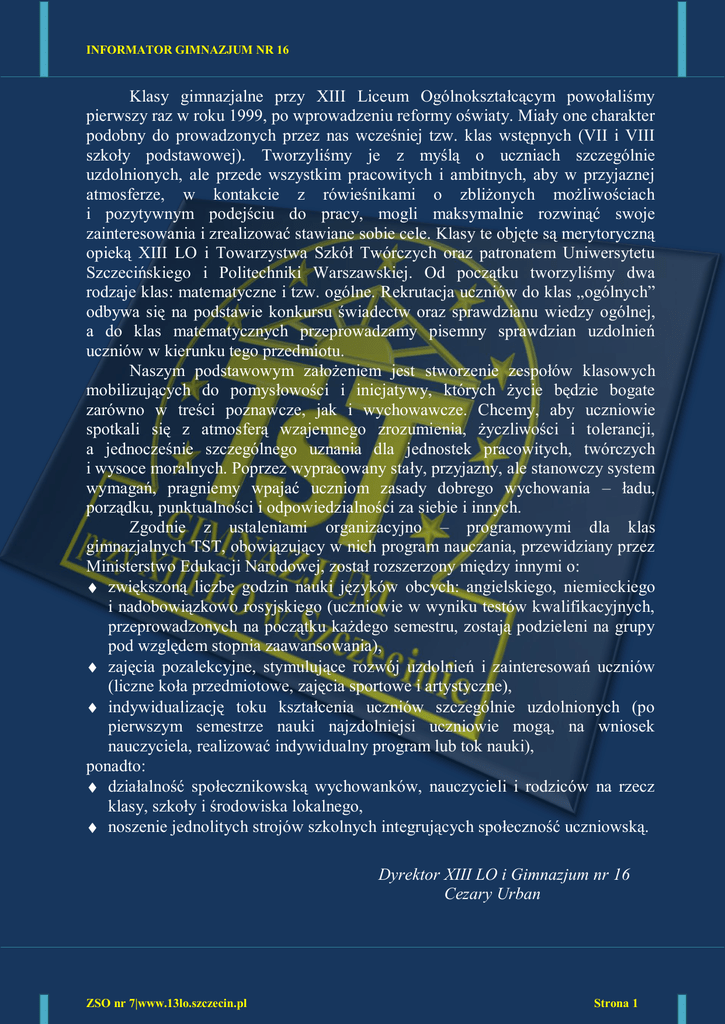 INFORMATOR GIMNAZJUM NR 16 Klasy gimnazjalne przy XIII Liceum Ogólnokształcącym powołaliśmy pierwszy raz w roku 1999, po wprowadzeniu reformy oświaty. Miały one charakter podobny do prowadzonych przez nas wcześniej tzw. klas wstępnych (VII i VIII szkoły podstawowej). Tworzyliśmy je z myślą o uczniach szczególnie uzdolnionych, ale przede wszystkim pracowitych i ambitnych, aby w przyjaznej atmosferze, w kontakcie z rówieśnikami o zbliżonych możliwościach i pozytywnym podejściu do pracy, mogli maksymalnie rozwinąć swoje zainteresowania i zrealizować stawiane sobie cele. Klasy te objęte są merytoryczną opieką XIII LO i Towarzystwa Szkół Twórczych oraz patronatem Uniwersytetu Szczecińskiego i Politechniki Warszawskiej. Od początku tworzyliśmy dwa rodzaje klas: matematyczne i tzw. ogólne. Rekrutacja uczniów do klas „ogólnych” odbywa się na podstawie konkursu świadectw oraz sprawdzianu wiedzy ogólnej, a do klas matematycznych przeprowadzamy pisemny sprawdzian uzdolnień uczniów w kierunku tego przedmiotu. Naszym podstawowym założeniem jest stworzenie zespołów klasowych mobilizujących do pomysłowości i inicjatywy, których życie będzie bogate zarówno w treści poznawcze, jak i wychowawcze. Chcemy, aby uczniowie spotkali się z atmosferą wzajemnego zrozumienia, życzliwości i tolerancji, a jednocześnie szczególnego uznania dla jednostek pracowitych, twórczych i wysoce moralnych. Poprzez wypracowany stały, przyjazny, ale stanowczy system wymagań, pragniemy wpajać uczniom zasady dobrego wychowania – ładu, porządku, punktualności i odpowiedzialności za siebie i innych. Zgodnie z ustaleniami organizacyjno – programowymi dla klas gimnazjalnych TST, obowiązujący w nich program nauczania, przewidziany przez Ministerstwo Edukacji Narodowej, został rozszerzony między innymi o: zwiększoną liczbę godzin nauki języków obcych: angielskiego, niemieckiego i nadobowiązkowo rosyjskiego (uczniowie w wyniku testów kwalifikacyjnych, przeprowadzonych na początku każdego semestru, zostają podzieleni na grupy pod względem stopnia zaawansowania), zajęcia pozalekcyjne, stymulujące rozwój uzdolnień i zainteresowań uczniów (liczne koła przedmiotowe, zajęcia sportowe i artystyczne), indywidualizację toku kształcenia uczniów szczególnie uzdolnionych (po pierwszym semestrze nauki najzdolniejsi uczniowie mogą, na wniosek nauczyciela, realizować indywidualny program lub tok nauki), ponadto: działalność społecznikowską wychowanków, nauczycieli i rodziców na rzecz klasy, szkoły i środowiska lokalnego, noszenie jednolitych strojów szkolnych integrujących społeczność uczniowską. Dyrektor XIII LO i Gimnazjum nr 16 Cezary Urban ZSO nr 7|www.13lo.szczecin.pl Strona 1 INFORMATOR GIMNAZJUM NR 16 INFORMACJE OGÓLNE O SZKOLE 1. Nauczyciele Obecnie w Gimnazjum przy XIII LO jest zatrudnionych 66 nauczycieli, w tym także byli lub obecni nauczyciele akademiccy Uniwersytetu Szczecińskiego. Między innymi dr Małgorzata Kępińska-Żerko – nauczycielka chemii, mgr Michał Szuman – nauczyciel matematyki, dr Tomasz Rydzewski – nauczyciel geografii. Trzy osoby posiadają tytuł doktora nauk, a dwie są w trakcie studiów doktoranckich. Każdego roku kilku nauczycieli kończy kursy podwyższające ich kwalifikacje zawodowe. 2. Współpraca z Uniwersytetem Szczecińskim i Politechniką Warszawską W ramach sprawowanego przez Uniwersytet Szczeciński patronatu nad XIII Liceum Ogólnokształcącym i klasami gimnazjalnymi: zajęcia z niektórych przedmiotów prowadzą nauczyciele i lektorzy akademiccy, pracownicy naukowi US sprawują merytoryczną opiekę nad kołami przedmiotowymi, szczególnie uzdolnieni uczniowie uczestniczą w wykładach i ćwiczeniach na wybranych kierunkach studiów, uczniowie korzystają z bibliotek i czytelni uniwersyteckich, Od 2011 roku patronat nad przedmiotami ścisłymi w liceum i gimnazjum sprawuje Politechnika Warszawska. Dzięki temu nasi uczniowie m.in.: biorą udział w obozach naukowych, na których zajęcia odbywają się w laboratoriach politechniki, uczestniczą w wykładach odbywających się w ramach Dni Politechniki Warszawskiej w naszej szkole. 3. Towarzystwo Szkół Twórczych XIII Liceum Ogólnokształcące jest członkiem TST od 1991 roku. Do tego elitarnego Towarzystwa należy 29, najbardziej renomowanych liceów z całego kraju. Celem TST, jak to zapisano w statucie, jest współdziałanie szkół w zakresie doskonalenia procesu nauczania i wychowania poprzez projektowanie, wdrażanie i upowszechnianie innowacji pedagogicznych. „Trzynastka” z powodzeniem prowadzi, cieszące się bardzo dużą popularnością, Międzyszkolne Koła Matematyczne i od 1999 roku klasy gimnazjalne. 4. Zajęcia pozalekcyjne Nauczyciele XIII LO prowadzą dla uczniów liceum i gimnazjum następujące koła przedmiotowe ▪ matematyczne ▪ chemiczne ▪ informatyczne ▪ historyczne ▪ polonistyczne ▪ fizyczne ▪ geograficzne ▪ biologiczne ▪ filozoficzne Ponadto odbywają się zajęcia: teatralne sportowe koła brydżowego szkolnego zespołu muzycznego ZSO nr 7|www.13lo.szczecin.pl Strona 2 INFORMATOR GIMNAZJUM NR 16 5. Pracownie komputerowe Jednymi z najlepiej wyposażonych pracowni przedmiotowych w XIII LO są pracownie komputerowe. Pracownie umożliwiają pracę w systemach Microsoft Windows XP, Windows VISTA oraz Linux. Wszystkie komputery połączone są w sieć lokalną opartą na architekturze Windows Server 2003. Program nauczania obejmuje naukę używania popularnych aplikacji biurowych, korzystania z sieci Internet, a także podstawy programowania i algorytmiki. Ponadto każdy uczeń ma możliwość bezpłatnego otrzymania konta pocztowego, miejsca na publikowanie własnych witryn WWW, konta FTP oraz konta shellowego na naszym szkolnym serwerze internetowym (13lo.szczecin.pl). 6. Opieka medyczna W szkole znajduje się gabinet medyczny, w którym opiekę nad uczniami sprawuje pielęgniarka.
