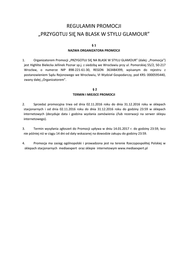 REGULAMIN PROMOCJI „PRZYGOTUJ SIĘ NA BLASK W STYLU GLAMOUR” §1 NAZWA ORGANIZATORA PROMOCJI 1. Organizatorem Promocji „PRZYGOTUJ SIĘ NA BLASK W STYLU GLAMOUR” (dalej: „Promocja") jest Highlite Bielecka Jellinek Poznar sp.j. z siedzibą we Wrocławiu przy ul. Pomorskiej 55/2, 50-217 Wrocław, o numerze NIP 898-221-61-30, REGON 363484399, wpisanym do rejestru z postanowieniem Sądu Rejonowego we Wrocławiu, VI Wydział Gospodarczy, pod KRS: 0000595440, zwany dalej „Organizatorem”. §2 TERMIN I MIEJSCE PROMOCJI 2. Sprzedaż promocyjna trwa od dnia 02.11.2016 roku do dnia 31.12.2016 roku w sklepach stacjonarnych i od dnia 02.11.2016 roku do dnia 31.12.2016 roku do godziny 23:59 w sklepach internetowych (decyduje data i godzina wysłania zamówienia i/lub rezerwacji na serwer sklepu internetowego). 3. Termin wysyłania zgłoszeń do Promocji upływa w dniu 14.01.2017 r. do godziny 23:59, lecz nie później niż w ciągu 14 dni od daty wskazanej na dowodzie zakupu do godziny 23:59. 4. Promocja ma zasięg ogólnopolski i prowadzona jest na terenie Rzeczypospolitej Polskiej w sklepach stacjonarnych mediaexpert oraz sklepie internetowym www.mediaexpert.pl §3 PRODUKTY OBJĘTE SPRZEDAŻĄ PROMOCYJNĄ 5. Sprzedażą promocyjną objęte są wybrane produkty spośród suszarek, prostownic, lokówek, lokówko-suszarek, zestawów do stylizacji, wałków, depilatorów oraz urządzeń IPL, golarek i trymerów damskich, zalotek do rzęs, pilników do stóp, szczotek do ciała, szczoteczek do twarzy oraz szczoteczek do zębów Remington (dalej: „Produkty promocyjne"). Lista produktów promocyjnych stanowi Załącznik nr 2. §4 UCZESTNICY PROMOCJI 6. Uczestnikiem Promocji może być każda pełnoletnia osoba fizyczna posiadająca pełną zdolność do czynności prawnej oraz każda osoba fizyczna, która ukończyła 13 rok życia za zgodą przedstawiciela ustawowego (dalej „Uczestnik”). W przypadku wątpliwości co do wieku Uczestnika, Organizator może poprosić o okazanie dokumentu potwierdzającego wiek Uczestnika pod warunkiem nie wydania nagrody. 7. W Promocji nie mogą brać udziału pracownicy Organizatora, Loyal Concept i Spectrum Brands Poland Sp. z o.o. oraz członkowie ich rodzin. Przez członków rodziny rozumie się: rodziców, dzieci, małżonków i rodzeństwo, przy czym zastrzeżenie dotyczy osób, które brały bezpośredni udział przy realizacji Promocji oraz tych, które pracowały nad projektem i wdrożeniem Promocji. Organizator zwolniony jest z pobierania oświadczeń w tym zakresie. §5 DANE OSOBOWE 8. Dane osobowe Uczestników będą przetwarzane w celu przeprowadzenia niniejszej Promocji oraz wydania Gratisów przez Highlite Bielecka Jellinek Poznar sp.j. z siedzibą we Wrocławiu przy ul. Pomorskiej 55/2, 50-217 Wrocław i Loyal Concept Sp. z o.o. z siedzibą w Warszawie przy ul. Tużyckiej 8 lok. 6, 03-683 Warszawa. Administratorem danych osobowych jest Spectrum Brands Poland sp. z o.o. z siedzibą w Warszawie, przy ul. Bitwy Warszawskiej 1920r. 7a, 02-366 Warszawa. Podanie danych jest dobrowolne, lecz niezbędne dla potrzeb przeprowadzenia Promocji i wydania Gratisów. Dane osobowe Uczestników – po wyrażeniu przez nich zgody, będą również przetwarzane do celów marketingowych przez Spectrum Brands Poland oraz Highlite Bielecka Jellinek Pozar sp.j. zgodnie z ustawą z dn. 29.08.1997 r. o ochronie danych osobowych (tekst jedn. Dz.U. z 2002, Nr 101, poz. 926 z późn. zm.). Uczestnikom Promocji przysługuje prawo dostępu do treści swoich danych oraz ich poprawiania. §6 NAGRODY W PROMOCJI 9. W Promocji przewidziano gratisy (dalej: „Gratisy”) za zakup produktu Remington objętego Promocją: srebrne kolczyki marki Apart o wartości rynkowej 49 zł brutto. Liczba Gratisów jest ograniczona do 2000 sztuk (słownie: dwa tysiące sztuk). 10. W przypadku wyczerpania puli Gratisów Organizator poinformuje o tym na stronie blaskglamour.pl w zakładce Weź udział. §7 WARUNKI UCZESTNICTWA W PROMOCJI 11. Podstawą do wzięcia udziału w Promocji może być jedynie zakup produktów nowych, dostępnych tylko i wyłącznie w sklepach określonych w punkcie 4 niniejszego Regulaminu, w stosunku do których gwarantem jest Spectrum Brands Poland Sp. z o.o., oraz w terminie, o którym jest mowa w punkcie 2 niniejszego Regulaminu. 12. Aby wziąć udział w Promocji Uczestnik zobowiązany jest spełnić łącznie następujące warunki: 12.1. Dokonać w terminie od dnia 02.11.2016 r. do dnia 31.12.2016 r. zakupu produktu spośród wybranych suszarek, prostownic, lokówek, lokówko-suszarek, zestawów do stylizacji, wałków, depilatorów oraz urządzeń IPL, golarek i trymerów damskich, zalotek do rzęs, pilników do stóp, szczotek do ciała, szczoteczek do twarzy oraz szczoteczek do zębów marki Remington. Listę Produktów Promocyjnych stanowi Załącznik nr 2. Zakup Produktów Promocyjnych musi być udokumentowany jednym dowodem zakupu (paragon lub faktura VAT), upoważniającym do wysłania jednego Zgłoszenia do Promocji, 12.2. W ciągu 14 dni od daty wskazanej na dowodzie zakupu, ale nie później niż do 14.01.2017 roku do godziny 23:59, przekazać swoje zgłoszenie poprzez wypełnienie formularza rejestracyjnego w wersji elektronicznej na stronie blaskglamour.pl (w tym dodanie zdjęć lub skanów wyciętego z opakowania produktu kodu EAN i paragonu lub faktury VAT potwierdzającej zakup) oraz kliknięcie w link aktywacyjny w mailu weryfikacyjnym. 13. W skład prawidłowego Zgłoszenia do Promocji wchodzi: a) Kopia, zdjęcie lub skan dowodu zakupu Produktu Promocyjnego (faktura VAT lub paragon fiskalny), oraz b) Oryginalny kod kreskowy wycięty z opakowania Produktu Promocyjnego (lub jego zdjęcie lub skan), oraz c) Kompletnie wypełniony, w formie elektronicznej, formularz rejestracyjny w Promocji „PRZYGOTUJ SIĘ NA BLASK W STYLU GLAMOUR”, który dostępny jest na stronie blaskglamour.pl, a którego wzór stanowi Załącznik nr 1. 14. Dokumenty, o któ