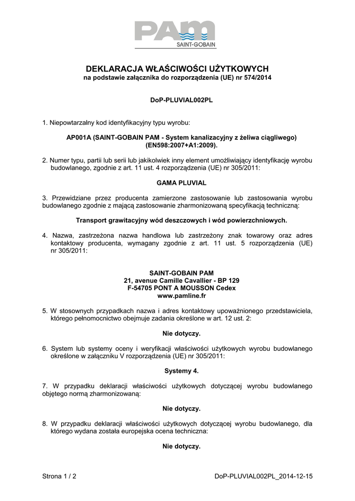 DEKLARACJA WŁAŚCIWOŚCI UŻYTKOWYCH na podstawie załącznika do rozporządzenia (UE) nr 574/2014 DoP-PLUVIAL002PL 1. Niepowtarzalny kod identyfikacyjny typu wyrobu: AP001A (SAINT-GOBAIN PAM - System kanalizacyjny z żeliwa ciągliwego) (EN598:2007+A1:2009). 2. Numer typu, partii lub serii lub jakikolwiek inny element umożliwiający identyfikację wyrobu budowlanego, zgodnie z art. 11 ust. 4 rozporządzenia (UE) nr 305/2011: GAMA PLUVIAL 3. Przewidziane przez producenta zamierzone zastosowanie lub zastosowania wyrobu budowlanego zgodnie z mającą zastosowanie zharmonizowaną specyfikacją techniczną: Transport grawitacyjny wód deszczowych i wód powierzchniowych. 4. Nazwa, zastrzeżona nazwa handlowa lub zastrzeżony znak towarowy oraz adres kontaktowy producenta, wymagany zgodnie z art. 11 ust. 5 rozporządzenia (UE) nr 305/2011: SAINT-GOBAIN PAM 21, avenue Camille Cavallier - BP 129 F-54705 PONT A MOUSSON Cedex www.pamline.fr 5. W stosownych przypadkach nazwa i adres kontaktowy upoważnionego przedstawiciela, którego pełnomocnictwo obejmuje zadania określone w art. 12 ust. 2: Nie dotyczy. 6. System lub systemy oceny i weryfikacji właściwości użytkowych wyrobu budowlanego określone w załączniku V rozporządzenia (UE) nr 305/2011: Systemy 4. 7. W przypadku deklaracji właściwości użytkowych dotyczącej wyrobu budowlanego objętego normą zharmonizowaną: Nie dotyczy. 8. W przypadku deklaracji właściwości użytkowych dotyczącej wyrobu budowlanego, dla którego wydana została europejska ocena techniczna: Nie dotyczy. Strona 1 / 2 DoP-PLUVIAL002PL_2014-12-15 9. Deklarowane właściwości użytkowe W poniższej tabeli wszystkie zasadnicze charakterystyki wymienione w pierwszej kolumnie odpowiadają charakterystykom opisanym w załączniku ZA (tabela ZA.1) do normy EN598:2007+A1:2009. Zasadnicze charakterystyki Tolerancje wymiarów Odporność na ciśnienie wewnętrzne Odporność na uderzenie Rury Złączki Odporność na zginanie wzdłużne Maksymalne obciążenie dla dopuszczalnego odkształcenia Szczelność: gaz i ciecz Ciśnienie wewnętrzne Ciśnienie ujemne Ciśnienie zewnętrzne Trwałość Powłoki zewnętrzne Rury Cynk Złączki 230 HB 250 HB Zgodna Zgodna 2 bary -0,9 bary 2 bary 130g/m² Epoksydacja Zgodnie z EN14 901 Powłoki wewnętrzne: Rury Zaprawa z cementu glinowego Złączki Właściwości użytkowe Zgodna 420 Mpa Zgodna Epoksydacja Zgodnie z EN14 901 Odporność chemiczna na ścieki Odporność na ścieranie Zgodna Zgodna (Zgodny(-a/-e) = Zgodność z EN598) 10. Właściwości użytkowe wyrobu określone w pkt 1 i 2 powyżej są zgodne z właściwościami użytkowymi deklarowanymi w pkt 9. Niniejsza deklaracja właściwości użytkowych wydana zostaje na wyłączną odpowiedzialność producenta określonego w pkt 4. W imieniu producenta podpisał(-a): Nancy, dnia 15.12.2014 Dyrektor Generalny, Vincent LEGROS. Strona 2 / 2 DoP-PLUVIAL002PL_2014-12-15