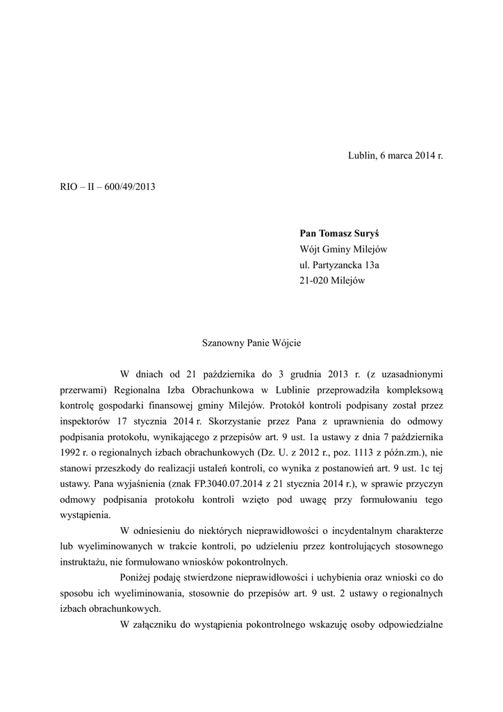 Lublin, 6 marca 2014 r. RIO – II – 600/49/2013 Pan Tomasz Suryś Wójt Gminy Milejów ul. Partyzancka 13a 21-020 Milejów Szanowny Panie Wójcie W dniach od 21 października do 3 grudnia 2013 r. (z uzasadnionymi przerwami) Regionalna Izba Obrachunkowa w Lublinie przeprowadziła kompleksową kontrolę gospodarki finansowej gminy Milejów. Protokół kontroli podpisany został przez inspektorów 17 stycznia 2014 r. Skorzystanie przez Pana z uprawnienia do odmowy podpisania protokołu, wynikającego z przepisów art. 9 ust. 1a ustawy z dnia 7 października 1992 r. o regionalnych izbach obrachunkowych (Dz. U. z 2012 r., poz. 1113 z późn.zm.), nie stanowi przeszkody do realizacji ustaleń kontroli, co wynika z postanowień art. 9 ust. 1c tej ustawy. Pana wyjaśnienia (znak FP.3040.07.2014 z 21 stycznia 2014 r.), w sprawie przyczyn odmowy podpisania protokołu kontroli wzięto pod uwagę przy formułowaniu tego wystąpienia. W odniesieniu do niektórych nieprawidłowości o incydentalnym charakterze lub wyeliminowanych w trakcie kontroli, po udzieleniu przez kontrolujących stosownego instruktażu, nie formułowano wniosków pokontrolnych. Poniżej podaję stwierdzone nieprawidłowości i uchybienia oraz wnioski co do sposobu ich wyeliminowania, stosownie do przepisów art. 9 ust. 2 ustawy o regionalnych izbach obrachunkowych. W załączniku do wystąpienia pokontrolnego wskazuję osoby odpowiedzialne 2 za stwierdzone nieprawidłowości. 1. W zakresie rachunkowości i sprawozdawczości: 1.1. Nieujęcie w księgach rachunkowych 2012 roku wszystkich kosztów dotyczących tego roku (w wysokości 36.388, 46 zł) – str. 5-6 protokołu. W księgach rachunkowych jednostki ujmować wszystkie obciążające ją koszty, dotyczące danego roku obrotowego, niezależnie od terminu ich zapłaty, stosownie do przepisów art. 6 ust.1 ustawy z dnia 29 września 1994 r. o rachunkowości (Dz. U. z 2013 r., poz. 330 z późn. zm.). 1.2. Przypadki niebieżącego ujmowania operacji gospodarczych, dotyczących przychodu środków trwałych – str. 7 protokołu. Do ksiąg rachunkowych okresu sprawozdawczego wprowadzać, w postaci zapisu, każde zdarzenie, które nastąpiło w tym okresie sprawozdawczym, zgodnie z przepisami art. 20 ust. 1 ustawy o rachunkowości, w związku z przepisami § 18 ust. 2 rozporządzenia Ministra Finansów z dnia 5 lipca 2010 r. w sprawie szczególnych zasad rachunkowości oraz planów kont dla budżetu państwa, budżetów jednostek samorządu terytorialnego, jednostek budżetowych, samorządowych zakładów budżetowych, państwowych funduszy celowych oraz państwowych jednostek budżetowych mających siedzibę poza granicami Rzeczpospolitej polskiej (Dz. U. z 2013 r., poz. 289), powoływanego w dalszej części tego wystąpienia jako ,,rozporządzenie Ministra Finansów z dnia 5 lipca 2010 r.’’. 1.3. Dokonywanie zapisów w ewidencji analitycznej do konta 221 „Należności z tytułu dochodów budżetowych” w zakresie dotyczącym opłat za wodę oraz najmu lokali bez określenia rodzaju i numeru identyfikacyjnego dowodu księgowego, stanowiącego podstawę zapisu oraz bez sporządzania dowodów księgowych, będących podstawą ich zapisów lub w kwotach niewynikających z dowodu, na podstawie którego ich dokonano (w zakresie opłat za wodę) – str. 8, 9, 76 protokołu. Zapisów w księgach rachunkowych dokonywać na podstawie dowodów księgowych, stwierdzających dokonanie operacji gospodarczej i zgodnie z ich treścią oraz ze wskazaniem rodzaju i numeru identyfikacyjnego dowodu księgowego stanowiącego podstawę zapisu, odzwierciedlając w nich stan rzeczywisty, stosownie do 3 przepisów art. 20 ust. 2, art. 23 ust. 2 pkt 2 i art. 24 ust. 2 ustawy o rachunkowości. 1.4. Niepobieranie odsetek za zwłokę od nieterminowo wnoszonych należności z tytułu opłat za dostawę wody oraz z tytułu czynszu najmu i dzierżawy – str. 9, 74 protokołu. Od nieterminowo regulowanych należności cywilnoprawnych pobierać odsetki za zwłokę w wysokości określonej w umowie, a w przypadku braku uregulowania umownego – w wysokości ustawowej, stosownie do przepisów art. 481 § 1 i 2 w związku z art. 359 § 1 i 2 ustawy z dnia 23 kwietnia 1964 r. Kodeks cywilny (Dz. U. z 2014 r. poz. 121), mając na uwadze przepisy art. 42 ust. 5 ustawy z dnia 27 sierpnia 2009 r. o finansach publicznych (Dz. U. Z 2013 r. poz. 885 z późn. zm.). 1.5. Przypadki ewidencjonowania wpłat za dostarczanie wody niezgodnie ze wskazaniem osoby dokonującej wpłaty – str. 9-10 protokołu. Dokonywane wpłaty z tytułu należności cywilnoprawnych, zawierające wskazanie zobowiązania, na poczet którego dokonano wpłaty, zaliczać i ewidencjonować zgodnie z przepisami art. 451 § 1 Kodeksu cywilnego. 1.6. Wykazanie w sprawozdaniu Rb-PDP za okres od początku roku do 31 grudnia 2012 r.: - zawyżonych skutków obniżenia górnej stawki w podatku rolnym (o 1.486 zł), w wyniku ich wyliczenia dla użytków rolnych zwolnionych ustawowo z tego podatku, - skutków wynikających z decyzji w sprawie umorzenia zaległości w podatku od środków transportowych (w kwocie 3.279 zł), wydanej i przypisanej pod datą 31 grudnia 2012 r., mimo jej doręczenia w styczniu 2013 r., - skutków obniżenia górnej stawki dla budynków mieszkalnych oraz skutków udzielonego przez Radę Gminy zwolnienia z podatku od nieruchomości dla tych budynków na podstawie szacunkowych danych – str. 16, 17, 58 protokołu. W sprawozdaniu Rb-PDP „Sprawozdanie z wykonania dochodów podatkowych gminy” wykazywać kwoty stanowiące rzeczywiste skutki obniżenia górnych stawek podatków, udzielonych przez gminę ulg i zwolnień oraz skutki decyzji wydanych przez organ podatkowy na podstawie ustawy Ordynacja podatkowa, stosownie do przepisów § 3 ust. 1 pkt 9, 10 i 11 w związku z § 8 ust. 3 „Instrukcji sporządzania sprawozdań budżetowych w zakresie budżetów jednostek samorządu terytorialnego”, stanowiącej załącznik N