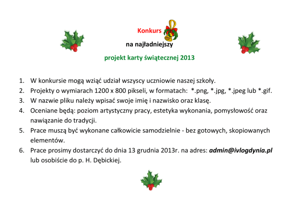 Konkurs na najładniejszy projekt karty świątecznej 2013 1. 2. 3. 4. W konkursie mogą wziąć udział wszyscy uczniowie naszej szkoły. Projekty o wymiarach 1200 x 800 pikseli, w formatach: *.png, *.jpg, *.jpeg lub *.gif. W nazwie pliku należy wpisać swoje imię i nazwisko oraz klasę. Oceniane będą: poziom artystyczny pracy, estetyka wykonania, pomysłowość oraz nawiązanie do tradycji. 5. Prace muszą być wykonane całkowicie samodzielnie - bez gotowych, skopiowanych elementów. 6. Prace prosimy dostarczyć do dnia 13 grudnia 2013r. na adres: [email protected] lub osobiście do p. H. Dębickiej.