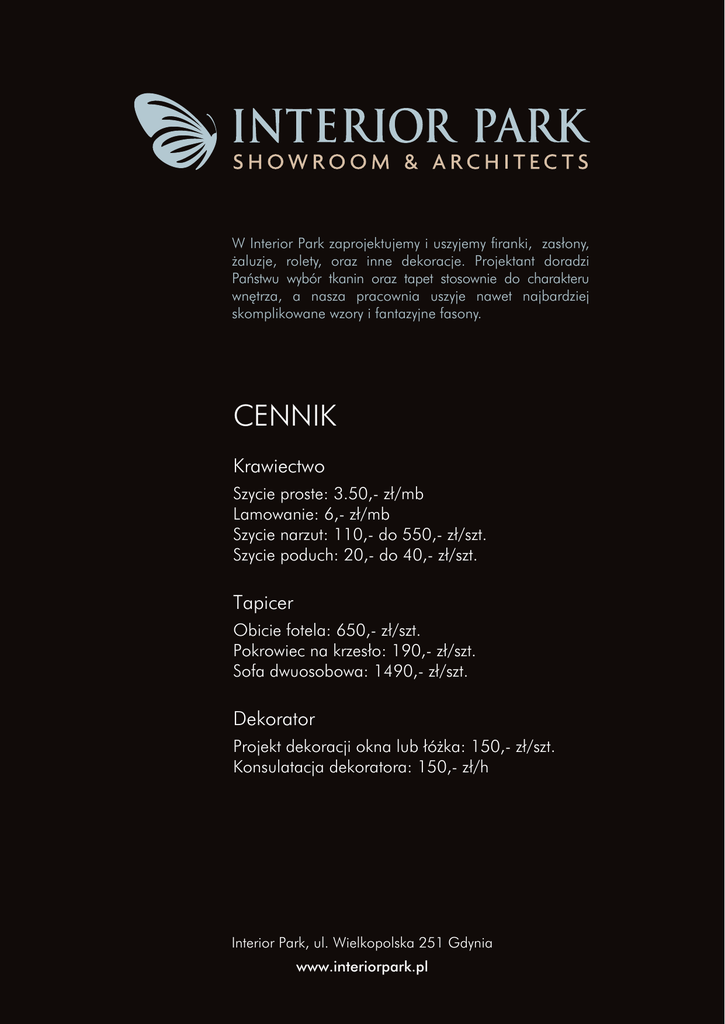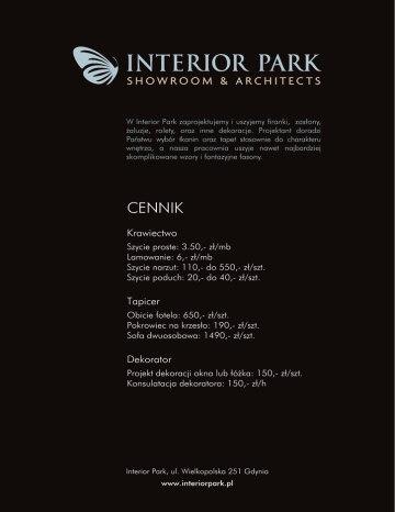 W Interior Park zaprojektujemy i uszyjemy firanki, zasłony, żaluzje, rolety, oraz inne dekoracje. Projektant doradzi Państwu wybór tkanin oraz tapet stosownie do charakteru wnętrza, a nasza pracownia uszyje nawet najbardziej skomplikowane wzory i fantazyjne fasony. CENNIK Krawiectwo Szycie proste: 3.50,- zł/mb Lamowanie: 6,- zł/mb Szycie narzut: 110,- do 550,- zł/szt. Szycie poduch: 20,- do 40,- zł/szt. Tapicer Obicie fotela: 650,- zł/szt. Pokrowiec na krzesło: 190,- zł/szt. Sofa dwuosobowa: 1490,- zł/szt. Dekorator Projekt dekoracji okna lub łóżka: 150,- zł/szt. Konsulatacja dekoratora: 150,- zł/h Interior Park, ul. Wielkopolska 251 Gdynia www.interiorpark.pl