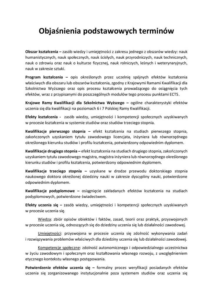 Objaśnienia podstawowych terminów Obszar kształcenia – zasób wiedzy i umiejętności z zakresu jednego z obszarów wiedzy: nauk humanistycznych, nauk społecznych, nauk ścisłych, nauk przyrodniczych, nauk technicznych, nauk o zdrowiu oraz nauk o kulturze fizycznej, nauk rolniczych, leśnych i weterynaryjnych, nauk w zakresie sztuki. Program kształcenia – opis określonych przez uczelnię spójnych efektów kształcenia właściwych dla obszaru lub obszarów kształcenia, zgodny z Krajowymi Ramami Kwalifikacji dla Szkolnictwa Wyższego oraz opis procesu kształcenia prowadzącego do osiągnięcia tych efektów, wraz z przypisanymi do poszczególnych modułów tego procesu punktami ECTS. Krajowe Ramy Kwalifikacji dla Szkolnictwa Wyższego – ogólne charakterystyki efektów uczenia się dla kwalifikacji na poziomach 6 i 7 Polskiej Ramy Kwalifikacji. Efekty kształcenia - zasób wiedzy, umiejętności i kompetencji społecznych uzyskiwanych w procesie kształcenia w systemie studiów oraz studiów trzeciego stopnia. Kwalifikacje pierwszego stopnia – efekt kształcenia na studiach pierwszego stopnia, zakończonych uzyskaniem tytułu zawodowego licencjata, inżyniera lub równorzędnego określonego kierunku studiów i profilu kształcenia, potwierdzony odpowiednim dyplomem. Kwalifikacje drugiego stopnia – efekt kształcenia na studiach drugiego stopnia, zakończonych uzyskaniem tytułu zawodowego magistra, magistra inżyniera lub równorzędnego określonego kierunku studiów i profilu kształcenia, potwierdzony odpowiednim dyplomem. Kwalifikacje trzeciego stopnia – uzyskane w drodze przewodu doktorskiego stopnia naukowego doktora określonej dziedziny nauki w zakresie dyscypliny nauki, potwierdzone odpowiednim dyplomem. Kwalifikacje podyplomowe – osiągnięcie zakładanych efektów kształcenia na studiach podyplomowych, potwierdzone świadectwem. Efekty uczenia się – zasób wiedzy, umiejętności i kompetencji społecznych uzyskiwanych w procesie uczenia się. Wiedza: zbiór opisów obiektów i faktów, zasad, teorii oraz praktyk, przyswojonych w procesie uczenia się, odnoszących się do dziedziny uczenia się lub działalności zawodowej. Umiejętności: przyswojona w procesie uczenia się zdolność wykonywania zadań i rozwiązywania problemów właściwych dla dziedziny uczenia się lub działalności zawodowej. Kompetencje społeczne: zdolność autonomicznego i odpowiedzialnego uczestnictwa w życiu zawodowym i społecznym oraz kształtowania własnego rozwoju, z uwzględnieniem etycznego kontekstu własnego postępowania. Potwierdzenie efektów uczenia się – formalny proces weryfikacji posiadanych efektów uczenia się zorganizowanego instytucjonalnie poza systemem studiów oraz uczenia się niezorganizowanego instytucjonalnie, realizowanego w sposób i metodami zwiększającymi zasób wiedzy, umiejętności i kompetencji społecznych (nie dotyczy kierunku analityka medyczna i medycyna laboratoryjna). Kwalifikacja – zestaw zgodnych z ustalonymi wymaganiami efektów uczenia się (wiedzy, umiejętności oraz kompetencji społecznych nabytych w procesie uczenia się), których osiągnięcie zostało sprawdzone (walidacja) oraz formalnie potwierdzone przez uprawnioną instytucję certyfikującą (certyfikacja). Kwalifikacja pełna – kwalifikacja nadawana wyłącznie w ramach systemów oświaty oraz szkolnictwa wyższego na zakończenie określonych etapów kształcenia, np. świadectwa ukończenia szkół, dyplomy ukończenia studiów wyższych; wszystkie kwalifikacje pełne są włączone do Zintegrowanego Systemu Kwalifikacji. Kwalifikacją cząstkowa – włączona do Zintegrowanego Systemu Kwalifikacji kwalifikacja, która nie jest pełna, np. świadectwo ukończenia studiów podyplomowych, zaświadczenie potwierdzające kwalifikację „biegły rewident”. Krajowy System Kwalifikacji – obowiązujące w kraju zasady i procedury dotyczące potwierdzania efektów uczenia się dla potrzeb rynku pracy, społeczeństwa obywatelskiego oraz indywidualnego rozwoju uczących, a także instytucje, w których się tworzy, nadaje i uznaje kwalifikacje. Ważnym elementem krajowego systemu kwalifikacji są mechanizmy zapewnienia jakości kwalifikacji. Zintegrowany System Kwalifikacji – podstawowa część krajowego systemu kwalifikacji obejmująca wszystkie kwalifikacje pełne nadawane w systemach oświaty i szkolnictwa wyższego oraz kwalifikacje cząstkowe nadawane przez system oświaty, które zostały włączone do tego systemu na podstawie jednostkowych decyzji podjętych na podstawie przepisów ustawy o ZSK. Zintegrowany Rejestr Kwalifikacji – publiczny rejestr działający w systemie teleinformatycznym ewidencjonujący kwalifikacje możliwe do uzyskania w Polsce, które są włączone do ZSK. Europejska Rama Kwalifikacji – przyjęta w UE struktura poziomów kwalifikacji stanowiąca układ odniesienia dla krajowych ram kwalifikacji umożliwiający porównywanie kwalifikacji uzyskiwanych w różnych krajach UE. Polska Rama Kwalifikacji – przyjęta w Polsce struktura poziomów kwalifikacji włączonych do ZSK. Poziomy PRK odpowiadają poziomom ERK. Przypisanie poziomu PRK danej kwalifikacji – rozstrzygnięcie podjęte na zasadach określonych w ustawie o ZSK o ustaleniu poziomu PRK dla danej kwalifikacji na podstawie porównania efektów uczenia się wymaganych dla tej kwalifikacji z charakterystykami poziomów PRK. Walidacja – sprawdzenie, czy – niezależnie od sposobu uczenia się – kompetencje wymagane dla danej kwalifikacji zostały osiągnięte. Pozytywny wynik walidacji jest podstawą wydania przez upoważnioną instytucje (np. uczelnię wyższą) dokumentu potwierdzającego uzyskanie tej kwalifikacji.