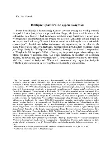 Ks. Jan Nowak1 Biblijne i pastoralne ujęcie świętości Przez beatyfikację i kanonizację Kościół zwraca uwagę na wielką wartość świętości, która jest jednym z przymiotów Boga, ale jednocześnie darem dla człowieka. Jan Paweł II był świadomy wielkiej wagi świętości, o czym pisał w programie duszpasterskim na trzecie tysiąclecie: „Składam dzięki Bogu za to, że pozwolił mi beatyfikować i kanonizować w minionych latach tak wielu chrześcijan”2. Papież nie tylko zachwycał się wyniesionymi na ołtarze, ale także budował się ich świadectwem. Szczególnym przykładem świętego życia jest Sługa Boży ks. Władysław Bukowiński, którego Jan Paweł II wspominał w Watykanie 18 listopada 2004: „Cieszę się, że postać tego bohaterskiego kapłana nie idzie w zapomnienie. (...) Bogu dziękuję, że mogłem go osobiście poznać, budować się jego świadectwem”3. Potrzebujemy świadków, aby umacniać się i trwać w świętości. Warto też zastanowić się, czym jest świętość w Biblii i jak realizować ją we wspólnocie Kościoła współcześnie. 1 Ks. Jan Nowak. zgłosił się do pracy duszpasterskiej w diecezji koszalińsko-kołobrzeskiej w 1984 r, gdzie w latach 1989-1995 był ojcem duchownym w koszalińskim Seminarium Duchownym a także wykładowcą w tymże Seminarium i w Wyższym Instytucie Teologicznym w Koszalinie. W 1995 roku obronił pracę doktorską z homiletyki pt. Aktualność kaznodziejskiej koncepcji kształtowania sumienia w kazaniach katechizmowych okresu międzywojennego na Papieskiej Akademii Teologicznej w Krakowie. W 1996 roku powrócił do Archidiecezji Krakowskiej, gdzie został Ojcem Duchownym w tutejszym Seminarium. Po 10 latach pobytu w Seminarium zgłosił się na misje do Kazachstanu. Po roku pracy w parafii w Kazachstanie został powołany na Postulatora Procesu Beatyfikacyjnego Sługi Bożego ks. Władysława Bukowińskiego w Krakowie. W latach 2006-2010 gromadził materiały archiwalne, wydawał dokumenty i napisał Positio o heroiczności cnót Sługi Bożego ks. Władysława Bukowińskiego. Między innymi opracował rękopisy ks. W. Bukowińskiego: Wybór wspomnień i informacji dla moich przyjaciół i Listy oraz Historia nauczycielką życia (historia pisana w łagrze Dżezgazgan, Kazachstan). Ponadto wydał książki popularyzujące Sługę Bożego; Apostoł Kazachstanu, Kraków 2006 Misjonarz Wschodu, Kraków 2008 Najbliżsi przyjaciele ks. Władysława Bukowińskiego ks. Bronisław Drzepecki i ks. Józef Kuczyński, Kraków 2009. Świadek, Kraków 2009, Vianey wschodu (ks. Władysław Bukowiński), Kraków 2010. W latach 2010/2011 był wykładowcą homiletyki i teologii duchowości w Międzydiecezjalnym Wyższym Seminarium Duchownym Karagandzie – Kazachstan. Obecnie dalej zajmuje się dalej troską o kult i informację o ks. W. Bukowińskim, nawiedzając parafie i pisząc na te tematy artykuły. 2 Jan Paweł II, Novo millennnio ineunte, Libreria Editrice Vaticana 2001, nr 31, s. 44. 3 Archiwum prywatne kard. F. Macharskiego. 190 Biblijne i pastoralne ujęcie świętości 1. Biblijna wizja świętości Hebrajskie qadosz i greckie hagios – odpowiedniki słowa święty – wskazują na silny związek z Bogiem i z tym, co boskie, oddzielone od sfery profanum4. Biblia ukazuje Boga, od którego pochodzi wszelka świętość5. Świętość ma wymiar moralny, bo wzywa do odpowiedzi na miłość Boga, do życia zgodnie z Jego przykazaniami. – teofania Wszystko, co istnieje, pochodzi od Boga. Dzieło stworzenia i teofania wskazują na Jego świętość. Majestatyczna teofania na Synaju jest przerażająca, ale zsyła również błogosławieństwo. Bóg wzywa Mojżesza, aby w Jego imię naród wybrany opuścił niewolę egipską. Lud gromadzi się wokół Boga, który jest święty. Dzięki Niemu wychodzi z niewoli, zawiera przymierze i oddaje Mu cześć. Spotkanie Mojżesza z Bogiem na górze Synaj ukazuje potęgę Boga i moc przymierza, które łączy naród wybrany z Bogiem i czyni go świętym: Mojżesz wstąpił wtedy do Boga, a Pan zawołał na niego z góry i powiedział: Tak powiesz domowi Jakuba i to oznajmisz Izraelitom: Wyście widzieli, co uczyniłem Egiptowi, jak niosłem was na skrzydłach orlich i przywiodłem was do Mnie. Teraz jeśli pilnie słuchać będziecie głosu mego i strzec mojego przymierza, będziecie szczególną moją własnością pośród wszystkich narodów, gdyż do Mnie należy cała ziemia. Lecz wy będziecie Mi królestwem kapłanów i ludem świętym (Wj 19, 3-6). Doświadczenie klęski również może prowadzić do odkrycia świętości Boga. Podkreśla to w Starym Testamencie prorok Ezechiel. Ogień i siarkę ześlę jak deszcz na niego i na jego wojsko i na rozliczne ludy, które są z nim. Tak okażę się wielkim i świętym, tak ukażę się oczom wszystkich narodów, wtedy poznają, że Ja jestem Pan. (Ez 38, 21-23) Najczęściej jednak Bóg objawia swoją świętość, troszcząc się o naród wybrany. Pragnie się nim opiekować i czuwać nad nim: Będą mieszkać na swojej ziemi, którą dałem słudze memu, Jakubowi. Będą na niej mieszkać bezpiecznie, będą budować domy i uprawiać winnice; będą mieszkać bezpiecznie, podczas gdy nad wszystkimi dokoła, którzy ich nienawidzili, Ja będę wykonywać sądy. I poznają, że Ja jestem Pan, ich Bóg (Ez 28, 25-26). Nawet gdy lud zrywa przymierze z Bogiem i oddaje cześć bożkom, to po pewnym czasie odkrywa, że tylko Bóg jest Panem i źródłem prawdziwej miłości i pragnie doświadczyć Jego opieki. Arka Przymierza staje się symbolem błogosławieństwa Boga dla tych, którzy ją przyjmują: „Arka Pańska pozosta4 5 Encyklopedia biblijna, Paul J. Achtemajer (red.), Warszawa 1999, s. 1227. Słownik teologii biblijnej, Xavier Leon Dufour (red.), Poznań 1994, s. 972. ks. Jan Nowak 191 wała w domu Obed-Edoma z Gat przez trzy miesiące. A Pan pobłogosławił Obed-Edomowi i całej jego rodzinie” (2 Sm 