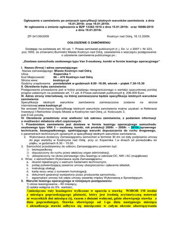 Ogłoszenie o zamówieniu po zmianach specyfikacji istotnych warunków zamówienia z dnia 15.01.2010r. oraz 19.01.2010r. Nr ogłoszenia o zmianie ogłoszenia w BZP 13382-1010 z dnia 15.01.2010r. oraz 16086-2010 z dnia 19.01.2010r. ZP-341/39/2009 Kostrzyn nad Odrą, 18.12.2009r. OGŁOSZENIE O ZAMÓWIENIU Działając na podstawie art. 40 ust. 1 Prawa zamówień publicznych (t. j. Dz. U. z 2007 r. Nr 223, poz.1655, ze zmianami) Burmistrz Miasta Kostrzyn nad Odrą zawiadamia o wszczęciu postępowania o udzielenie zamówienia publicznego pn.: „Dostawa samochodu osobowego typu Van 5-osobowy, kombi w formie leasingu operacyjnego” I. Nazwa (firma) i adres zamawiającego: Nazwa zamawiającego: Miasto Kostrzyn nad Odrą Ulica: Kopernika 1 Kod Miejscowość: 66 – 470 Kostrzyn nad Odrą Strona www: kostrzyn.pl Godziny urzędowania: poniedziałek w godzinach 8.00 -16.00, wtorek – piątek 7.30-15.30 II. Określenie trybu zamówienia: Postępowanie prowadzone jest w trybie przetargu nieograniczonego o wartości szacunkowej poniżej progów ustalonych na podstawie art. 11 ust. 8 Prawa zamówień publicznych tj. 206.000 Euro III. Adres strony internetowej, na której zamieszczona będzie specyfikacja istotnych warunków zamówienia: Specyfikacja istotnych warunków zamówienia zamieszczona zostanie na stronie internetowej:www.kostrzyn.pl Na wniosek Wykonawcy Specyfikację istotnych warunków zamówienia można uzyskać: w Referacie Inwestycji I Remontów Urzędu Miasta w Kostrzynie nad Odrą ,ul. Kościuszki 3, pok.9 lub pocztą. IV. Określenie przedmiotu oraz wielkości lub zakresu zamówienia, z podaniem informacji o możliwości składania ofert częściowych: 1. Przedmiotem zamówienia jest dostawa w formie leasingu operacyjnego samochodu osobowego typu VAN 5 – osobowy, kombi, rok produkcji 2008r. – 2009r. – 2010r.,sprawnego technicznie, bezwypadkowego, spełniającego warunki dopuszczenia do ruchu drogowego, o parametrach technicznych opisanych w specyfikacji istotnych warunków zamówienia. 2. Wykonawca dostarczy Zamawiającemu samochód w terminie 30 dni od daty podpisania umowy do jego siedziby w Kostrzynie nad Odrą przy ul. Kopernika 1,w dniach od poniedziałku do piątku, w godzinach 8.30 – 15.00. 3. Samochód przedstawiony do odbioru Zamawiającemu powinien być: 1) bezwypadkowy 2) dopuszczony do ruchu przez właściwy organ administracji, 3) ubezpieczony na okres pierwszego roku leasingu w zakresie OC, NW i AC (majątkowe) 4. Wraz z samochodem Wykonawca wyda Zamawiającemu: a. dowód rejestracyjny z ważnymi badaniami technicznymi, b. polisę potwierdzającą zawarcie umowy ubezpieczenia i opłacenie składek, c. instrukcję obsługi, d. kartę wozu wraz z numerem homologacji, e. dokument gwarancji wystawiony przez producenta samochodu, f. egzemplarz umowy lub odpis umowy zawartej między Wykonawcą a Sprzedającym. 5. Warunki leasingu operacyjnego w niniejszym postępowaniu: 1) okres leasingowania – 60 miesięcy, 2) opłata wstępna do 5% wartości, 3)miesięczne raty leasingowe wyliczone w oparciu o stawkę WIBOR 1M średni z miesiąca poprzedzającego płatność, który jest średnią arytmetyczną notowań ze wszystkich dni miesiąca (tj. razem z dniami wolnymi, gdzie obowiązuje stawka z dnia poprzedniego). Stawka obowiązuje od 1-go dnia następnego miesiąca i aktualizacja stawki odbywa się miesięcznie w całym okresie obowiązywania umowy. Pozostałe składniki raty leasingowej w oparciu o które będzie ustalona jej wysokość będą stałe. 4) płatność miesięcznej raty leasingowej przypadać będzie na ostatni dzień roboczy każdego miesiąca na podstawie faktury VAT, wystawionej przez Leasingodawcę 5) ubezpieczenie OC, NW i AC (majątkowe) jest płatne przez Leasingodawcę za cały rok z góry. Koszty ubezpieczenia w całym okresie obowiązywania umowy leasingu, Leasingodawca doliczy do ceny oferty. Wykonawca zobowiązuje się do ubezpieczenia samochodu do pełnej wartości rynkowej, 6) opłata końcowa (wykup) 1% wartości, 7) ewentualna prowizja – opłata manipulacyjna płatna jednorazowo wraz z opłatą końcową, 8) nie przewiduje się wystąpienia innych dodatkowych opłat, z wyłączeniem opłat wynikających z przepisów prawa, 9) możliwość wykupu, 10) waluta leasingu – PLN, 11) odpisów amortyzacyjnych w okresie obowiązywania umowy leasingu dokonuje Leasingodawca. 7. Warunki płatności za przedmiot zamówienia: leasing na 60 miesięcznych rat, wysokość pierwszej wpłaty nie więcej niż 5% wartości, płatność miesięcznej raty leasingowej przypadać będzie na ostatni dzień roboczy każdego miesiąca na podstawie faktury VAT, wystawionej przez Leasingodawcę. 8. Inne warunki przedmiotowe: 1) czas dostępu serwisu nie dłuższy niż 24 godziny, 2) w zakresie obsługi samochodu dokonać przeszkolenia jednego pracownika, 3) Wykonawca wyrazi zgodę na montaż w oferowanym pojeździe systemu łączności bezprzewodowej tj.: instalacji antenowej, instalacji zasilania urządzeń łączności radiowej oraz innego specjalistycznego sprzętu, 4) zmiany adaptacyjne pojazdu powstałe w trakcie jego eksploatacji, dotyczące montażu wyposażenia specjalnego, nie mogą powodować utraty ani ograniczenia uprawnień wynikających z fabrycznej gwarancji, Wspólny Słownik Zamówień (CPV): 34110000-1 Samochody osobowe 66000000-0 Usługi finansowe i ubezpieczeniowe V. Informacja o możliwości złożenia oferty wariantowej Zamawiający nie dopuszcza składania ofert wariantowych VI Informacja o możliwości składania ofert częściowych Zamawiający nie dopuszcza możliwości składania ofert częściowych. VII. Termin wykonania zamówienia Umowa leasingu operacyjnego zostanie zawarta na 5 lat (60 miesięcy) okres spłaty rat leasingowych. Odbiór samochodu nastąpi nie później niż do 30 dni od daty podpisania umowy. Z chwilą odbioru samochodu, zaczyna biec okres spłaty leasingu – 60 miesięcy. VIII. Opis warunków udziału w postępowaniu