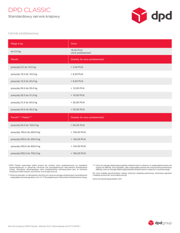 DPD CLASSIC Standardowy serwis krajowy Cennik podstawowy Waga w kg Cena do 5,0 kg 16,00 PLN cena podstawowa* Paczki Dopłaty do ceny podstawowej* powyżej 5,0 do 10,0 kg + 3,00 PLN powyżej 10,0 do 15,0 kg + 6,00 PLN powyżej 15,0 do 20,0 kg + 9,00 PLN powyżej 20,0 do 25,0 kg + 12,00 PLN powyżej 25,0 do 31,5 kg + 15,00 PLN powyżej 31,5 do 40,0 kg + 25,00 PLN powyżej 40,0 do 50,0 kg + 35,00 PLN Paczki** / Palety*** Dopłaty do ceny podstawowej* powyżej 50,0 do 100,0 kg + 94,00 PLN powyżej 100,0 do 200,0 kg + 104,00 PLN powyżej 200,0 do 300,0 kg + 124,00 PLN powyżej 300,0 do 500,0 kg + 144,00 PLN powyżej 500,0 do 700,0 kg + 184,00 PLN * DPD Polska zastrzega sobie prawo do zmiany ceny podstawowej na zasadach przewidzianych w zawartej Umowie lub Szczegółowych Warunkach Świadczenia Usług. Aktualnie obowiązująca cena podstawowa zamieszczona jest w Cenniku Krajowym DPD Classic na stronie: www.dpd.com.pl. ** Dotyczy paczek, w odniesieniu do których cena za usługę ustalana jest na podstawie wagi gabarytowej zgodnie z Art. 6 i 7 Szczegółowych Warunków Świadczenia Usług. Serwis krajowy DPD Classic. Wersja 12.0. Obowiązuje od 01.11.2016 r. *** Cena za usługę obejmującą paletę ustalana jest w oparciu o wagę gabarytową nie niższą niż 288 kg. W przypadku, gdy waga gabarytowa lub rzeczywista przekracza 288 kg, cena za usługę obejmującą paletę ustalana jest w oparciu o wyższą wagę. Do ceny każdej paczki/palety należy doliczyć dopłatę paliwową, naliczaną zgodnie z tabelą na stronie: www.dpd.com.pl Ceny nie zawierają podatku VAT. DPD CLASSIC Usługi i opłaty dodatkowe Zastrzeżenia doręczenia* Cena DPD 9:30 (doręczenie do godz. 9:30) 60,00 PLN DPD 12:00 (doręczenie do godz. 12:00) 30,00 PLN DPD NA GODZINĘ (zastrzeżenie doręczenia na godzinę) 30,00 PLN DPD NEXT DAY 10,00 PLN Sobota (nadanie lub doręczenie w sobotę) 15,00 PLN Niedziela i święta (nadanie lub doręczenie w niedzielę i święta) 30,00 PLN DPD PRZETARG MONITOROWANY 90,00 PLN Strefa B2C (BUSINESS TO CONSUMER)** Cena C.O.D. Usługa za pobraniem*** 5,00 PLN + 1% wartości pobrania C.O.D. Express Usługa za pobraniem*** 9,00 PLN + 1% wartości pobrania Doręczenie do rąk własnych 12,00 PLN Predict SMS 1,00 PLN Awizo SMS 0,50 PLN Predict E-mail bezpłatna Awizo E-mail bezpłatna Odbiór własny bezpłatna Nadanie w punkcie Pickup wg cennika podstawowego Odbiór w punkcie Pickup wg cennika podstawowego * Usługi realizowane zgodnie z Tabelą dostępności usług DPD dostępną na stronie www.dpd.com.pl ** U sługi dostępne również dla B2B (Business to Business). *** Wpisanie na potwierdzeniu nadania kwoty pobrania powyżej 1 000 PLN powoduje przystąpienie do dodatkowej ochrony ubezpieczeniowej i pobranie opłaty z tego tytułu. Maksymalna kwota pobrania to równowartość 3 000 EUR liczonych w PLN obliczonej według średniego kursu ogłaszanego przez Narodowy Bank Polski ostatniego roboczego dnia miesiąca poprzedzającego miesiąc, w którym nadano przesyłkę. Ceny nie zawierają podatku VAT. Serwis krajowy DPD Classic. Wersja 12.0. Obowiązuje od 01.11.2016 r. DPD CLASSIC Usługi i opłaty dodatkowe Inne usługi i opłaty dodatkowe Cena Zwrot do nadawcy wg cennika podstawowego Przekierowanie przesyłki (do innego oddziału DPD) wg cennika podstawowego Przekierowanie przesyłki (w ramach tego samego oddziału DPD) bezpłatnie DOX wg cennika podstawowego Przesyłka zwrotna wg cennika podstawowego Dokumenty zwrotne 10,00 PLN Paczka niestandardowa 12,00 PLN za paczkę Dodatkowa ochrona ubezpieczeniowa: - powyżej 1 000 PLN do 2 000 PLN - powyżej 2 000 PLN do 3 000 PLN - powyżej 3 000 PLN do 4 000 PLN - powyżej 4 000 PLN do 5 000 PLN - powyżej 5 000 PLN do 10 000 PLN - powyżej 10 000 PLN do 20 000 PLN - powyżej 20 000 PLN do 50 000 PLN - powyżej 50 000 PLN 1,00 PLN 2,00 PLN 3,00 PLN 4,00 PLN 7,00 PLN 12,00 PLN 0,1% zadeklarowanej wartości 0,2% zadeklarowanej wartości Kolejna próba doręczenia (druga nieskuteczna i każda kolejna) 16,00 PLN Zlecenie odbioru 10,00 PLN Potwierdzenie doręczenia przesyłki 6,00 PLN wersja elektroniczna 12,00 PLN wersja papierowa Magazynowanie 4,00 PLN za każdy dzień List ręczny 2,00 PLN Pusty podjazd 10,00 PLN Czas oczekiwania (na nadanie lub doręczenie przesyłki powyżej 10 min) 10,00 PLN za każde rozpoczęte 10 min Płatność kartą za C.O.D. 1% wartości pobrania (nie mniej niż 3,50 PLN) Cena za usługi i opłaty dodatkowe doliczana jest do ceny podstawowej przesyłki. Szczegółowe informacje dotyczące poszczególnych usług i opłat dodatkowych dostępne są w Szczegółowych Warunkach Świadczenia Usług zamieszczonych na stronie www.dpd.com.pl. Ceny nie zawierają podatku VAT. Serwis krajowy DPD Classic. Wersja 12.0. Obowiązuje od 01.11.2016 r.