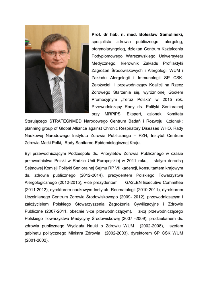 Prof. dr hab. n. med. Bolesław Samoliński, specjalista zdrowia publicznego, alergolog, otorynolaryngolog, dziekan Centrum Kształcenia Podyplomowego Warszawskiego Uniwersytetu Medycznego, Zakładu kierownik Profilaktyki Zagrożeń Środowiskowych i Alergologii WUM i Zakładu Alergologii i Immunologii SP CSK. Założyciel i przewodniczący Koalicji na Rzecz Zdrowego Starzenia się, wyróżnionej Godłem Promocyjnym „Teraz Polska” w 2015 rok. Przewodniczący Rady ds. Polityki Senioralnej przy MRPiPS. Ekspert, członek Komitetu Sterującego STRATEGNMED Narodowego Centrum Badań i Rozwoju. Członek: planning group of Global Alliance against Chronic Respiratory Diseases WHO, Rady Naukowej Narodowego Instytutu Zdrowia Publicznego – PZH, Instytut Centrum Zdrowia Matki Polki, Rady Sanitarno-Epidemiologicznej Kraju. Był przewodniczącym Podzespołu ds. Priorytetów Zdrowia Publicznego w czasie przewodnictwa Polski w Radzie Unii Europejskiej w 2011 roku, stałym doradcą Sejmowej Komisji Polityki Senioralnej Sejmu RP VII kadencji, konsultantem krajowym ds. zdrowia publicznego (2012-2014), prezydentem Alergologicznego (2012-2015), v-ce prezydentem Polskiego Towarzystwa GA2LEN Executive Committee (2011-2012), dyrektorem naukowym Instytutu Reumatologii (2010-2011), dyrektorem Uczelnianego Centrum Zdrowia Środowiskowego (2009- 2012), przewodniczącym i założycielem Polskiego Stowarzyszenia Zagrożenia Cywilizacyjne Publiczne (2007-2011, obecnie v-ce przewodniczącym), i Zdrowie z-cą przewodniczącego Polskiego Towarzystwa Medycyny Środowiskowej (2007 -2009), prodziekanem ds. zdrowia publicznego Wydziału Nauki o Zdrowiu WUM gabinetu politycznego Ministra Zdrowia (2001-2002). (2002-2008), szefem (2002-2003), dyrektorem SP CSK WUM