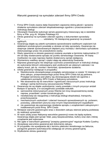 Warunki gwarancji na symulator zderzeń firmy SPH Credo 1. 2. 3. 4. 5. 6. 7. 8. 9. 10. 11. 12. 13. 14. 15. Firma SPH Credo zwana dalej Gwarantem zapewnia dobrą jakość i sprawne działanie symulatora zderzeń eksploatowanego zgodnie z przeznaczeniem i instrukcją obsługi. Obowiązki Gwaranta wykonuje serwis gwarancyjny mieszczący się w siedzibie firmy w Pile przy Al. Wojska Polskiego 43. Okres gwarancji na symulator zderzeń zgodny z dokumentem sprzedaży FV ………………………… udzielamy 18 miesięcznej gwarancji na prawach ogólnych. Gwarancją objęte są usterki symulatora spowodowane wadliwymi częściami lub defektami produkcyjnymi powstałe w okresie od daty sprzedaży. Gwarancja nie obejmuje usterek spowodowanych błędami przy montażu i demontażu symulatora dokonywanego przez nie przeszkolone osoby. Wady ujawnione w okresie gwarancji zostaną usunięte w terminie maksymalnie 21 dni od daty dostarczenia sprzętu do punktu serwisowego Gwaranta. W miarę możliwości na czas naprawy będzie dostarczony sprzęt zastępczy. Wymieniony wadliwy sprzęt i części stają się własnością Gwaranta. Naprawa gwarancyjna nie obejmuje czynności przewidzianych w instrukcji obsługi, do wykonania których zobowiązany jest użytkownik we własnym zakresie i na własny koszt, jak np. montaż i demontaż, sprawdzenie działania. Utrata gwarancji następuje w przypadku: a. Niedokonania obowiązkowego przeglądu serwisowego w czasie 12 miesięcy od dnia zakupu, przeprowadzonego przez firmę SPH Credo lub jej partnera. Przegląd serwisowy jest płatny wg obowiązującej stawki lub zgodnie z ustaleniami pomiędzy SPH Credo a Nabywcą symulatora. b. Nie stosowania się do warunków i ograniczeń narzuconych przez instrukcję obsługi i opinię techniczną rzeczoznawców PZMot. Gwarancją nie są objęte uszkodzenia i wady powstałe z innych przyczyn aniżeli tkwiące w sprzęcie, a w szczególności powstałe wskutek: a. samowolnie dokonywanych przez Klienta lub inną nieupoważnioną osobę napraw, przeróbek i zmian konstrukcyjnych, b. niewłaściwej lub niezgodnej z instrukcją obsługi eksploatacji, transportu, przechowywania c. mechanicznych uszkodzeń i zdarzeń losowych spowodowanych np. pożarem; powodzą, uderzeniem pioruna oraz innymi nieprzewidzianymi wypadkami d. nie gwarantuje się poprawnego działania sprzętu z urządzeniami zakupionymi i instalowanymi poza firmą SPH Credo Niniejsze warunki gwarancyjne wraz z dowodem zakupu stanowi jedyną podstawę do realizacji uprawnień. W razie utraty przez Nabywcę warunków gwarancji nowe nie będą wydane, Gwarancją objęty jest sprzęt: fotel, pasy bezpieczeństwa, bufory oraz stal z której urządzenie jest wykonane. Nie ujęte w warunkach gwarancji "przepisy gwarancyjne" reguluje Kodeks Cywilny. Akceptacja warunków gwarancji jest dokonanie zakupu. W przypadku nie wywiązania się z terminu płatności określonego na fakturze, paragonie gwarant automatycznie odstępuję od umowy gwarancyjnej. Wydłużenie okresu gwarancji: Istnieje możliwość wykupienia przedłużonej gwarancji na symulator zderzeń. W tym celu należy w ciągu 90 dni od zakupu symulatora wyrazić chęć (telefonicznie, listownie lub faxem) wydłużenia okresu gwarancyjnego. Wiąże się to z wykupieniem dodatkowego pakietu serwisowego, którego wartość zależna jest od okresu o jaki Nabywca chce ją wydłużyć. Opcje: a) o 1 rok – koszt 15% wartości zakupu symulatora (w cenie przedłużonej gwarancji zawarte są koszty 1 obowiązkowego przeglądu serwisowego oraz 2 pasów bezpieczeństwa wymienianych przez serwisanta SPH Credo) b) o 2 lata – koszt 25% wartości zakupu symulatora (w cenie przedłużonej gwarancji zawarte są koszty 2 obowiązkowych przeglądów serwisowych oraz 4 pasów bezpieczeństwa wymienianych przez serwisanta SPH Credo) c) o 3 lata – koszt 35% wartości zakupu symulatora (w cenie przedłużonej gwarancji zawarte są koszty 5 obowiązkowych przeglądów serwisowych oraz 6 pasów bezpieczeństwa wymienianych przez serwisanta SPH Credo)