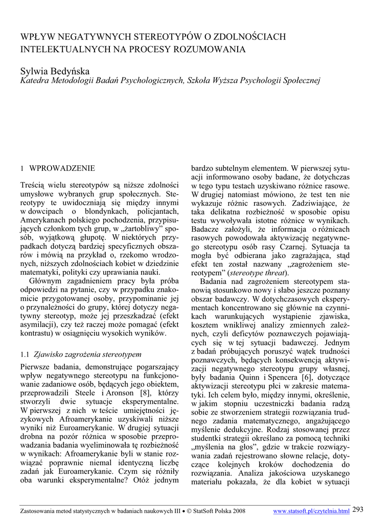 WPŁYW NEGATYWNYCH STEREOTYPÓW O ZDOLNOŚCIACH INTELEKTUALNYCH NA PROCESY ROZUMOWANIA Sylwia Bedyńska Katedra Metodologii Badań Psychologicznych, Szkoła Wyższa Psychologii Społecznej 1 WPROWADZENIE Treścią wielu stereotypów są niższe zdolności umysłowe wybranych grup społecznych. Stereotypy te uwidoczniają się między innymi w dowcipach o blondynkach, policjantach, Amerykanach polskiego pochodzenia, przypisujących członkom tych grup, w „żartobliwy” sposób, wyjątkową głupotę. W niektórych przypadkach dotyczą bardziej specyficznych obszarów i mówią na przykład o, rzekomo wrodzonych, niższych zdolnościach kobiet w dziedzinie matematyki, polityki czy uprawiania nauki. Głównym zagadnieniem pracy była próba odpowiedzi na pytanie, czy w przypadku znakomicie przygotowanej osoby, przypominanie jej o przynależności do grupy, której dotyczy negatywny stereotyp, może jej przeszkadzać (efekt asymilacji), czy też raczej może pomagać (efekt kontrastu) w osiągnięciu wysokich wyników. 1.1 Zjawisko zagrożenia stereotypem Pierwsze badania, demonstrujące pogarszający wpływ negatywnego stereotypu na funkcjonowanie zadaniowe osób, będących jego obiektem, przeprowadzili Steele i Aronson [8], którzy stworzyli dwie sytuacje eksperymentalne. W pierwszej z nich w teście umiejętności językowych Afroamerykanie uzyskiwali niższe wyniki niż Euroamerykanie. W drugiej sytuacji drobna na pozór różnica w sposobie przeprowadzania badania wyeliminowała tę rozbieżność w wynikach: Afroamerykanie byli w stanie rozwiązać poprawnie niemal identyczną liczbę zadań jak Euroamerykanie. Czym się różniły oba warunki eksperymentalne? Otóż jednym bardzo subtelnym elementem. W pierwszej sytuacji informowano osoby badane, że dotychczas w tego typu testach uzyskiwano różnice rasowe. W drugiej natomiast mówiono, że test ten nie wykazuje różnic rasowych. Zadziwiające, że taka delikatna rozbieżność w sposobie opisu testu wywoływała istotne różnice w wynikach. Badacze założyli, że informacja o różnicach rasowych powodowała aktywizację negatywnego stereotypu osób rasy Czarnej. Sytuacja ta mogła być odbierana jako zagrażająca, stąd efekt ten został nazwany „zagrożeniem stereotypem” (stereotype threat). Badania nad zagrożeniem stereotypem stanowią stosunkowo nowy i słabo jeszcze poznany obszar badawczy. W dotychczasowych eksperymentach koncentrowano się głównie na czynnikach warunkujących wystąpienie zjawiska, kosztem wnikliwej analizy zmiennych zależnych, czyli deficytów poznawczych pojawiających się w tej sytuacji badawczej. Jednym z badań próbujących poruszyć wątek trudności poznawczych, będących konsekwencją aktywizacji negatywnego stereotypu grupy własnej, były badania Quinn i Spencera [6], dotyczące aktywizacji stereotypu płci w zakresie matematyki. Ich celem było, między innymi, określenie, w jakim stopniu uczestniczki badania radzą sobie ze stworzeniem strategii rozwiązania trudnego zadania matematycznego, angażującego myślenie dedukcyjne. Rodzaj stosowanej przez studentki strategii określano za pomocą techniki „myślenia na głos”, gdzie w trakcie rozwiązywania zadań rejestrowano słowne relacje, dotyczące kolejnych kroków dochodzenia do rozwiązania. Analiza jakościowa uzyskanego materiału pokazała, że dla kobiet w sytuacji Zastosowania metod statystycznych w badaniach naukowych III • StatSoft Polska 2008 www.statsoft.pl/czytelnia.html 293 Wpływ negatywnych stereotypów o zdolnościach intelektualnych na procesy rozumowania zagrożenia stereotypem największą trudność stanowi początkowa faza procesu formułowania strategii. W wielu przypadkach następowała bowiem blokada tego procesu. Osoby, które ją przezwyciężyły i rozpoczęły planowanie dalszych kroków rozwiązania zadania, dochodziły do takich samych rozwiązań, jak osoby niezagrożone stereotypem. Formułując wnioski z badania, autorzy stwierdzili, że w wyniku aktywizacji stereotypu następuje swoista blokada inicjacji procesu generowania strategii, który to proces wymagał uwzględnienia cząstkowych informacji zawartych w treści zadania. Choć badacze nie analizowali bezpośrednio skuteczności generatywnego myślenia, można sądzić, że właśnie ten rodzaj myślenia jest silnie uwikłany w proces planowania rozwiązania złożonych zadań poznawczych. Ten fakt skłania do postawienia hipotezy, że w sytuacji aktywizacji negatywnego stereotypu dotyczącego grupy własnej – sytuacji zagrożenia stereotypem – pojawiają się trudności w zakresie myślenia generatywnego. Na jakiej podstawie można wnioskować, że informacje rzeczywiście są integrowane już w trakcie zapoznawania się z nimi, a nie później, gdy osoba jest pytana o relacje między konkretnymi osobami? Odpowiedzieć można dzięki dobrze udokumentowanemu i wielokrotnie zreplikowanemu wzorcowi wyników pokazującemu występowanie efektu odległości [4]. Z badań wynika, że jeśli osoba tworzy wektor już w trakcie zapoznawania się z informacjami, to pytana o relacje między parami osób, szybciej i bardziej poprawnie określa te relacje, które nie były wcześniej prezentowane, a mogą być określone jedynie po integracji wektora. Wolniej i mniej poprawnie natomiast określa relacje między elementami sąsiednimi, czyli tymi, które były uprzednio prezentowane. Tak więc, odwołując się do powyższego przykładu, osoba badana mniej poprawnie określi relacje typu: „Jan wyższy niż Paweł”, czy „Paweł wyższy niż Grzegorz” (elementy sąsiednie wektora), niż relacje nigdy nie prezentowane typu: „Jan wyższy niż Ryszard” (krańce wektora). 1.2 Myślenie generatywne 1.3 Zaburzenia myślenia generatywnego W psychologii poznawczej zakłada się, że w trakcie zapoznawania się z przesłankami człowiek ma naturalną tendencję do integrowania docierających informacji w spójny model umysłowy, uproszczon
