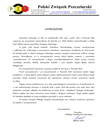 zaproszenie-relikwie-WZP - Polski Związek Pszczelarski