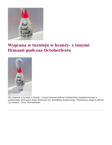 Wygrana w turnieju w branży- z innymi firmami podczas Octoberfestu Oto wygrana w turnieju w branży- z innymi firmami podczas Octoberfestu zorganizowanego w październiku 2016 przez firmę Wortmann AG. Rozbiliśmy konkurencję:) Tremarkowa ekipa to Michał i ja tremark – Artur Niewiadomski. Gepardy biznesu 2015 Ciężka praca zawsze jest nagradzana. Owocna praca całego zespołu pozwala napawać nas dumą. Miło nam poinformować, że zostaliśmy docenieni przez Instytutu Europejskiego Biznesu i otrzymaliśmy geparda biznesu 2015. Gratulacje dla całego zespołu. Certyfikat wiarygodności dla Tremark Sp. z.o.o. Wiarygodność płatności to w dzisiejszych czasach podstawa. Miło nam jest Państwa poinformować, że otrzymaliśmy certyfikat wiarygodności płatniczej. Potwierdza to naszą wiarygodność i rzetelność w realizacji transakcji z naszymi kontrahentami.