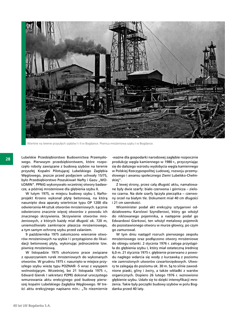 Wiertnie na terenie przyszłych szybów I i II w Bogdance. Piwnica mrożeniowa szybu I w Bogdance. 28 Lubelskie Przed siębiorstwo Budownictwa Przemysło wego. Pierwszym przedsiębiorstwem, które rozpoczęło roboty zawiązane z budową szybów na terenie przy szłej Kopalni Pilotującej Lubelskie go Zagłębia Węglowego, jeszcze przed podjęciem uchwały 15/75, było Przedsiębiorstwo Poszukiwań Nafty i Gazu „WOŁOMIN”. PPNiG wykonywało wcześniej otwory badawcze, a później mrożeniowe dla głębienia szybu II. W lutym 1975, w miejscu budowy szybu I, Naftoprojekt Krosno wyko nał płytę betonową, na którą nasunięto dwa aparaty wiertnicze typu OP 1200 dla odwiercenia 44 sztuk otworów mrożeniowych. Łącznie odwiercono znacznie więcej otworów z powodu ich znacznego skrzywienia. Skrzywienie otworów mrożeniowych, z których każdy miał długość ok. 720 m, uniemoż liwiało zamknięcie płaszcza mrożeniowego, a tym samym ochronę szybu przed zalaniem. 9 października 1975 zakończono wiercenie otworów mrożeniowych na szybie I i przystąpiono do likwidacji betonowej płyty, wykonując jedno cześnie tzw. piwnicę mrożeniową. W listopadzie 1975 ukończono prace związane z opuszczaniem rurek mrożeniowych do wykonanych otworów. W grudniu 1975 r. nasunięto w miejsce przyszłego szybu wieżę typu POZNAŃ -5 wraz z wysypem wolnostojącym. Wcześniej, bo 21 listopada 1975 r., Edward Gierek I sekretarz PZPR) dokonał uroczystego wmurowania aktu erekcyjne go pod budowę pierwszej kopalni Lubelskiego Zagłębia Węglowego. W treści aktu erekcyjnego napisano min.: „To niezmiernie 40 lat LW Bogdanka S.A. -ważne dla gospodarki narodowej zagłębie rozpocznie produkcję węgla kamiennego w 1980 r., przyczyniając się do dalszego wzrostu wydobycia węgla kamiennego w Polskiej Rzeczypospolitej Ludowej, rozwoju przemy słowego i awansu społecznego Ziemi Lubelsko-Chełmskiej”. Z lewej strony, przez całą długość aktu, namalowane były dwie szarfy: biało czerwona i górnicza – zielono czarna. Na dole szarfy łączyła pieczątka – czerwony orzeł na białym tle. Dokument miał 40 cm długości i 21 cm szerokości. Wiceminister podał akt erekcyjny sztygarowi oddziałowemu Karolowi Szyndlerowi, który go włożył do ni klowanego pojemnika, a następnie podał go Edwardowi Gierkowi, ten włożył metalowy pojemnik do pozostawionego otworu w murze głowicy, po czym go zamurował. W tym dniu nastąpił rozruch pierw szego zespołu mrożeniowego oraz podłączono otwory mrożeniowe do obiegu solanki. 2 stycznia 1976 r. załoga przystąpiła do głębienia szybu I, który miał ostateczną średnicę 6,0 m. 21 stycznia 1975 r. głębienie przerwano z powodu nagłego wdarcia się wody z kurzawką z poziomu nie zamrożonych utworów czwartorzędowych. Utwory te zalegają do poziomu ok. 30 m. Są to silnie zawod nione piaski, gliny i żwiry, a także wkładki z warstw organicznych. Dopiero 26 lutego 1976 r. wznowiono głębienie szybu. Udało się to dzięki intensyfikacji mrożenia. Takie były początki budowy szybów w polu Bogdanka przed 40 laty.